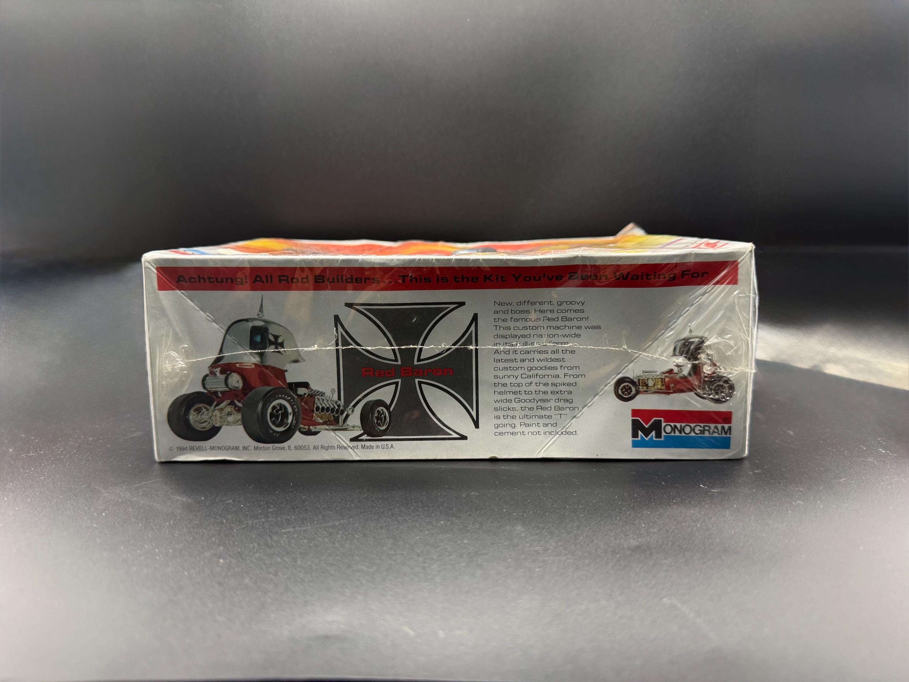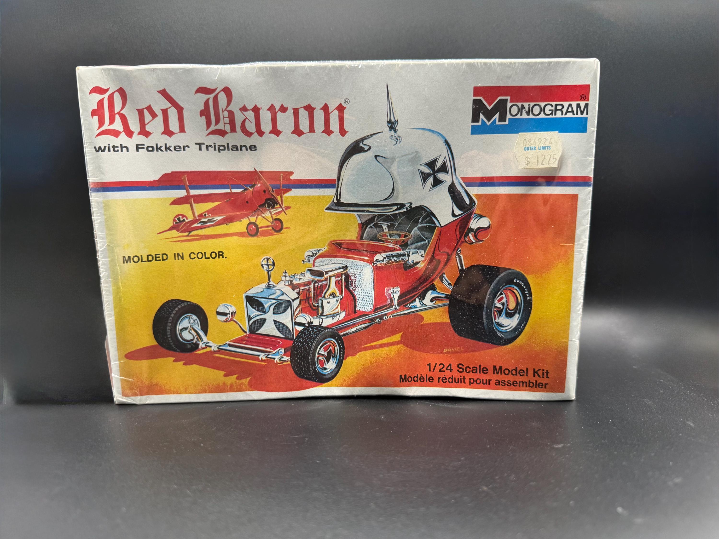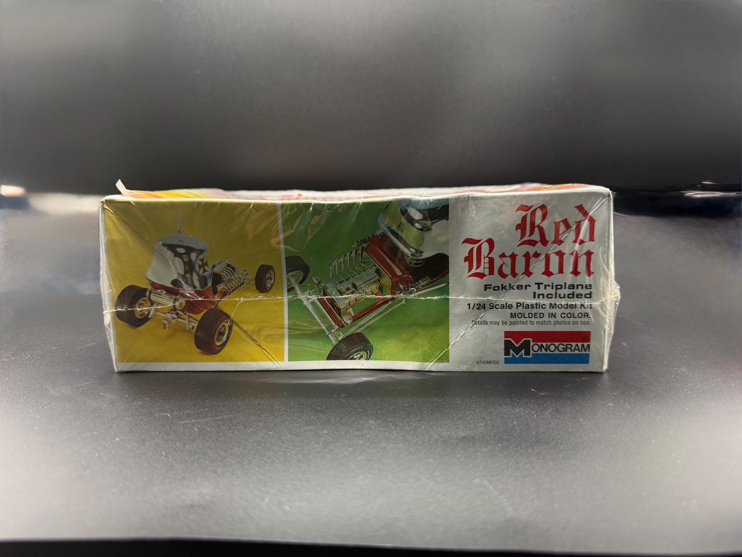 Step back into model kit history with this vintage Monogram Red Baron 1/24 Scale Plastic Model Kit. Featuring the iconic hot rod design topped with the German helmet and complete with the legendary Fokker Triplane, this kit is a true collector’s treasure.
