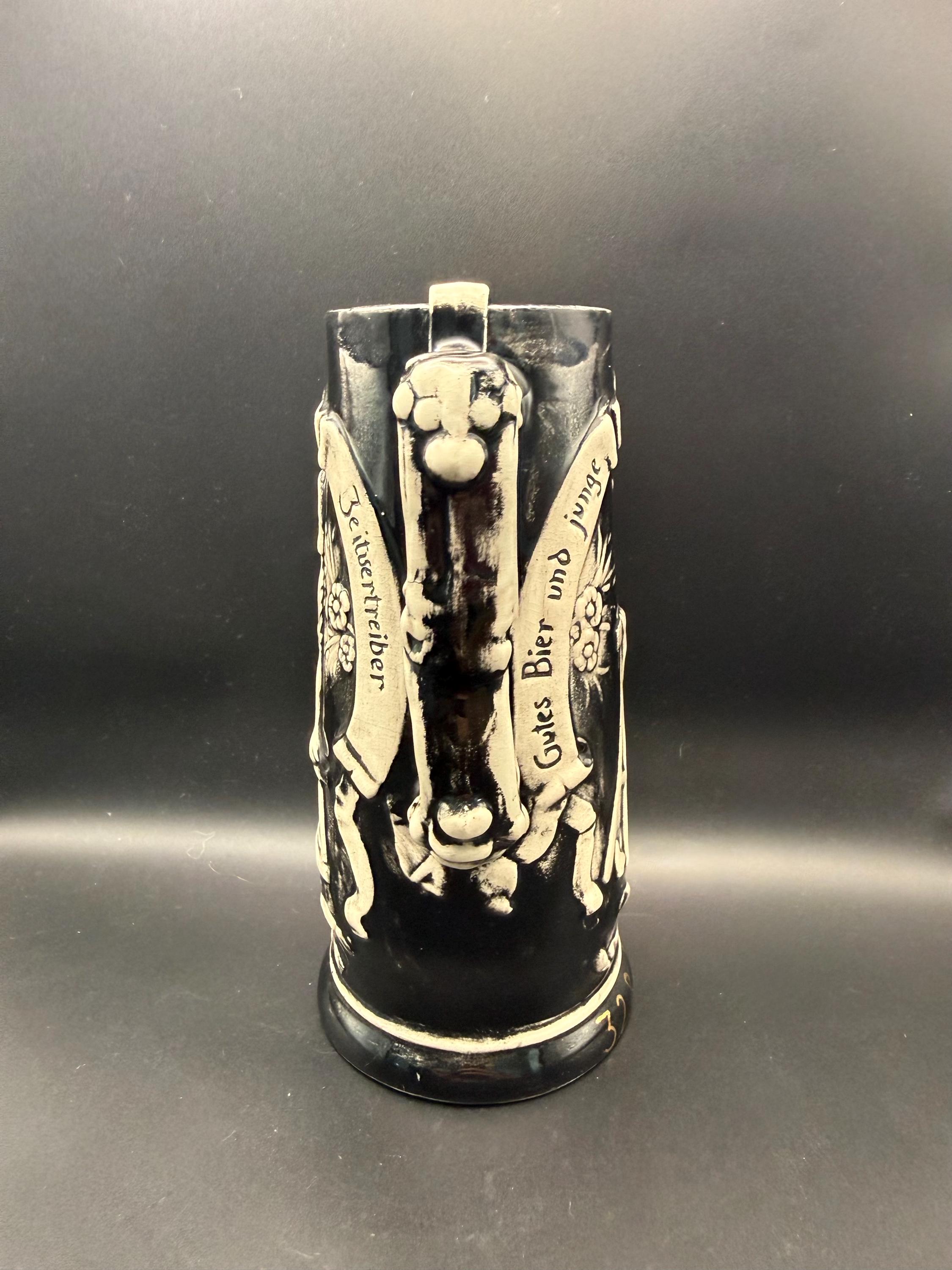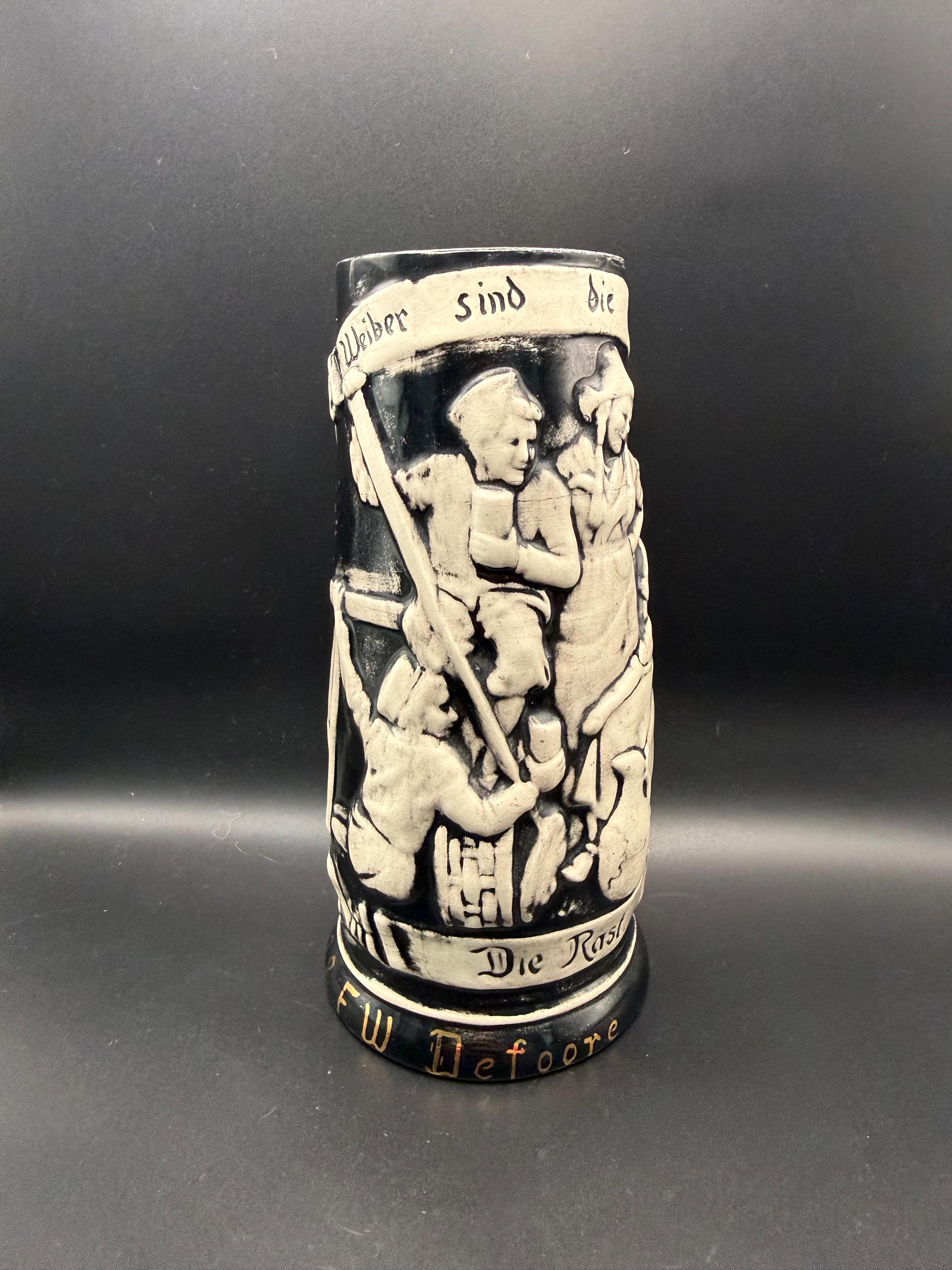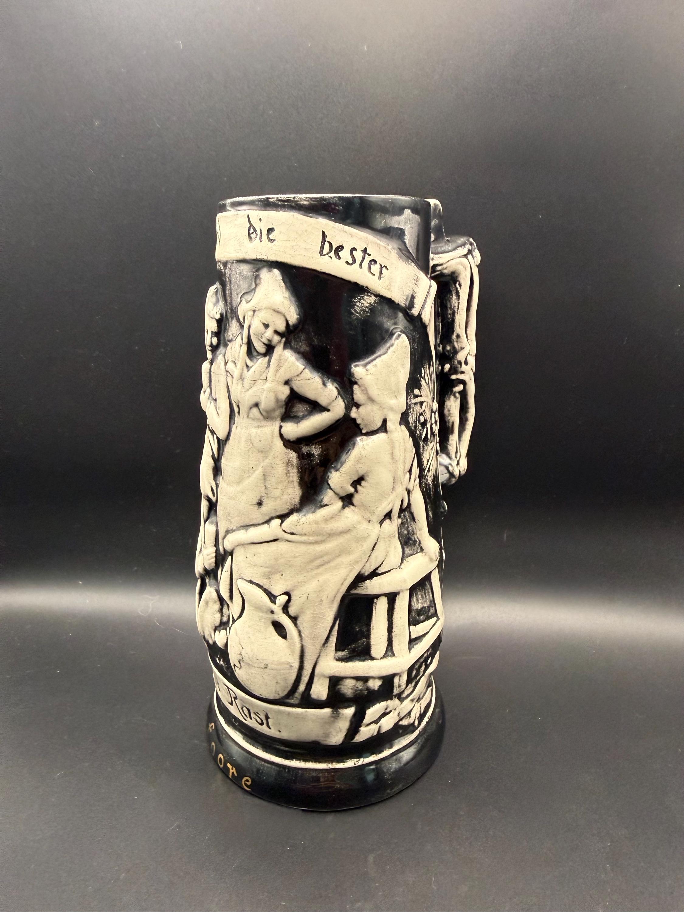 This vintage German beer stein features a charming tavern scene in raised relief, complete with rustic figures enjoying food and drink. Inscribed with the motto: