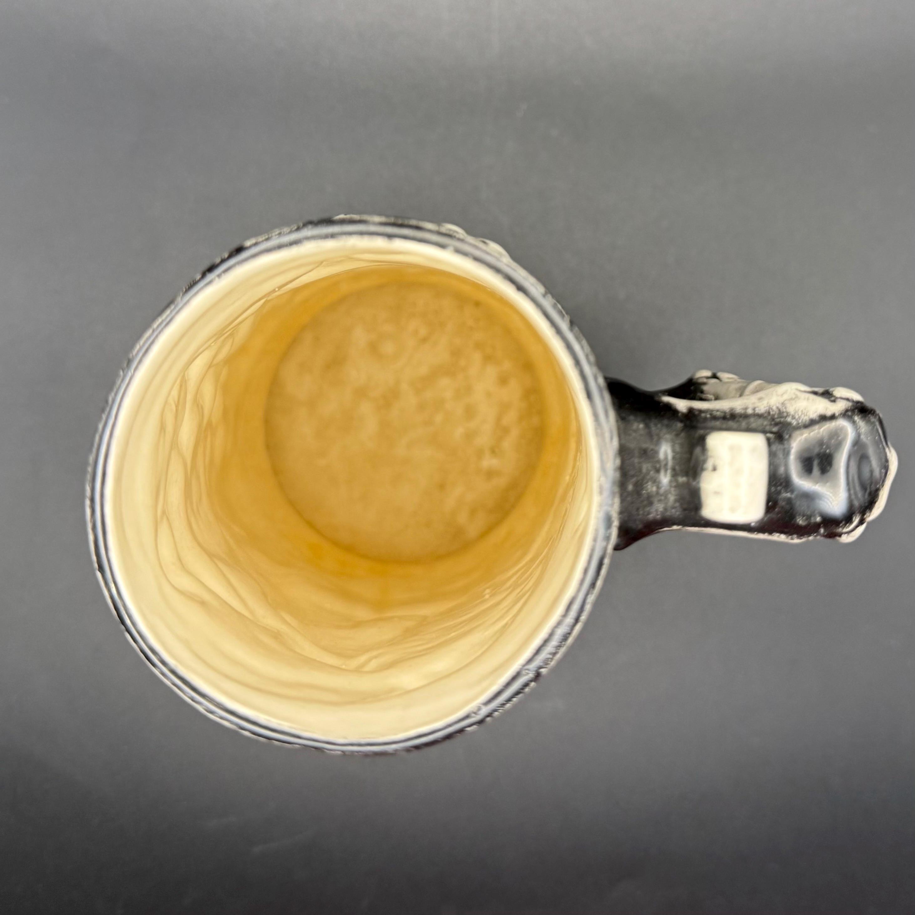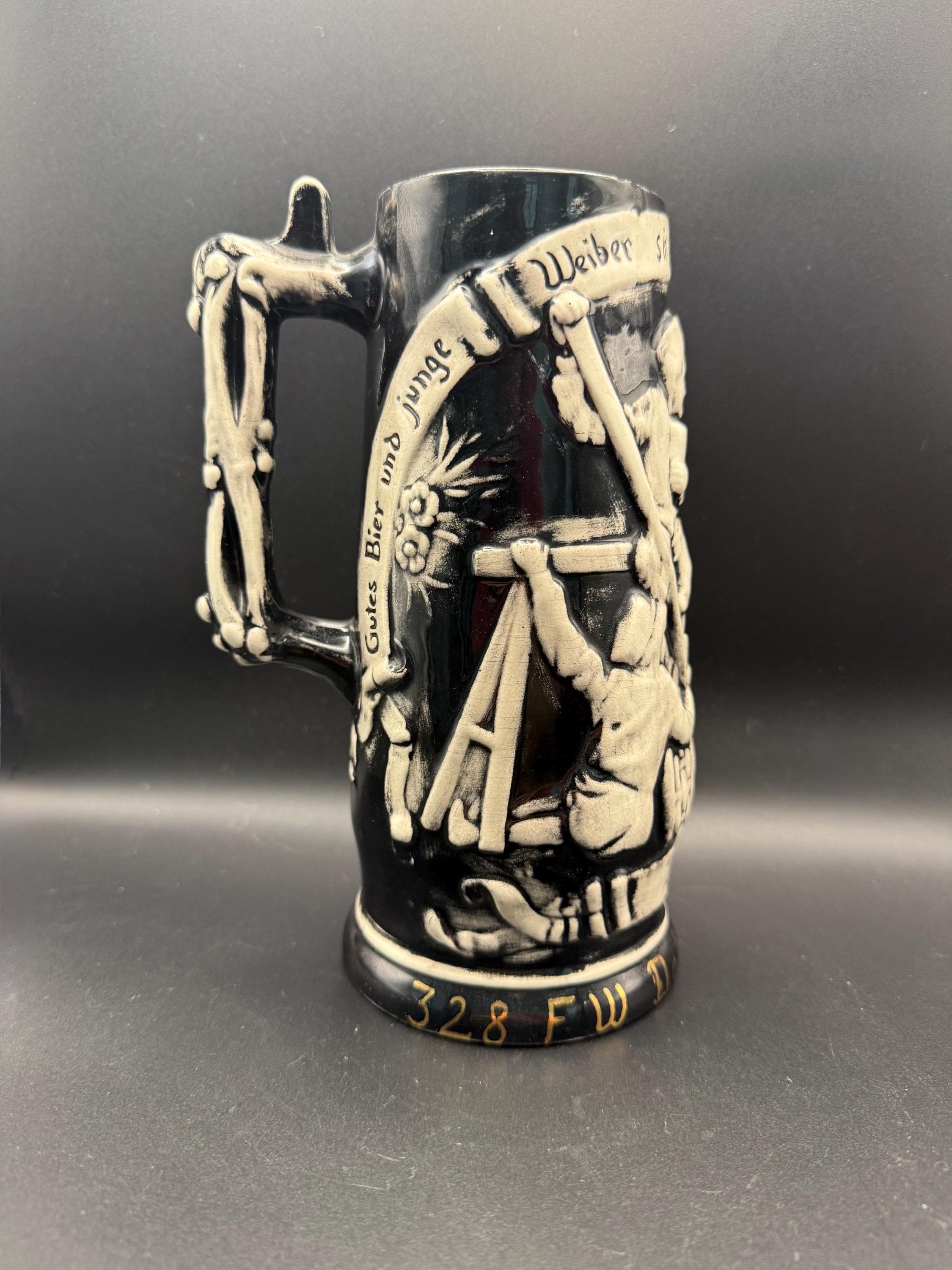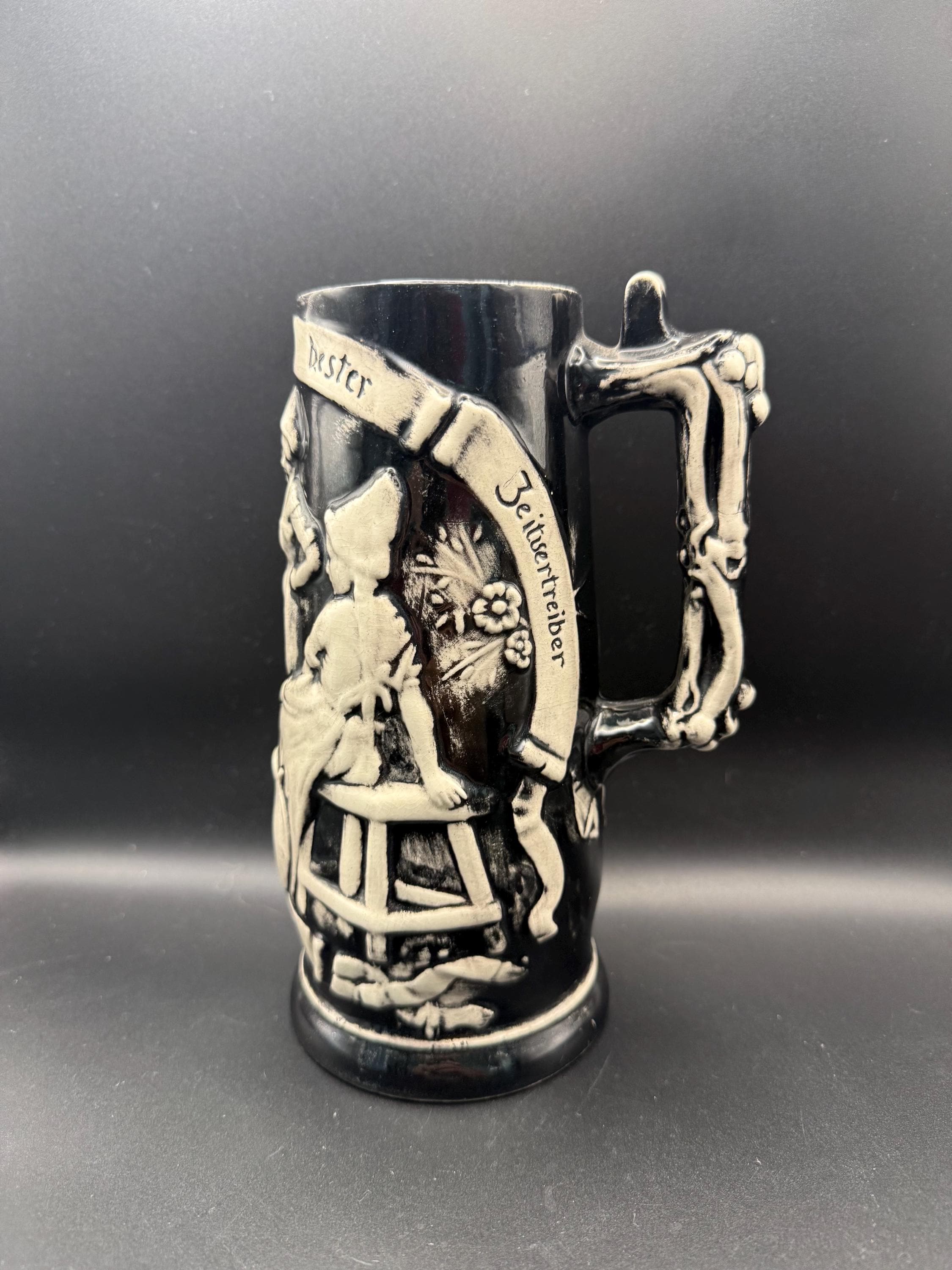 This vintage German beer stein features a charming tavern scene in raised relief, complete with rustic figures enjoying food and drink. Inscribed with the motto: