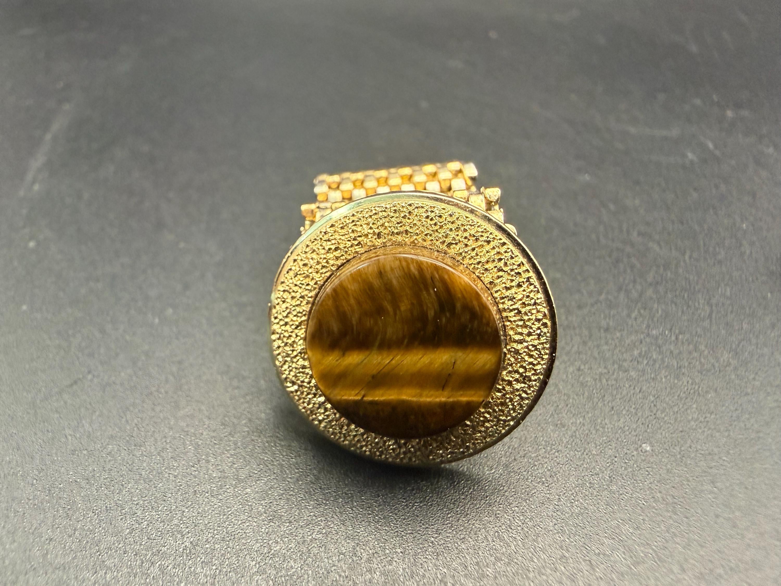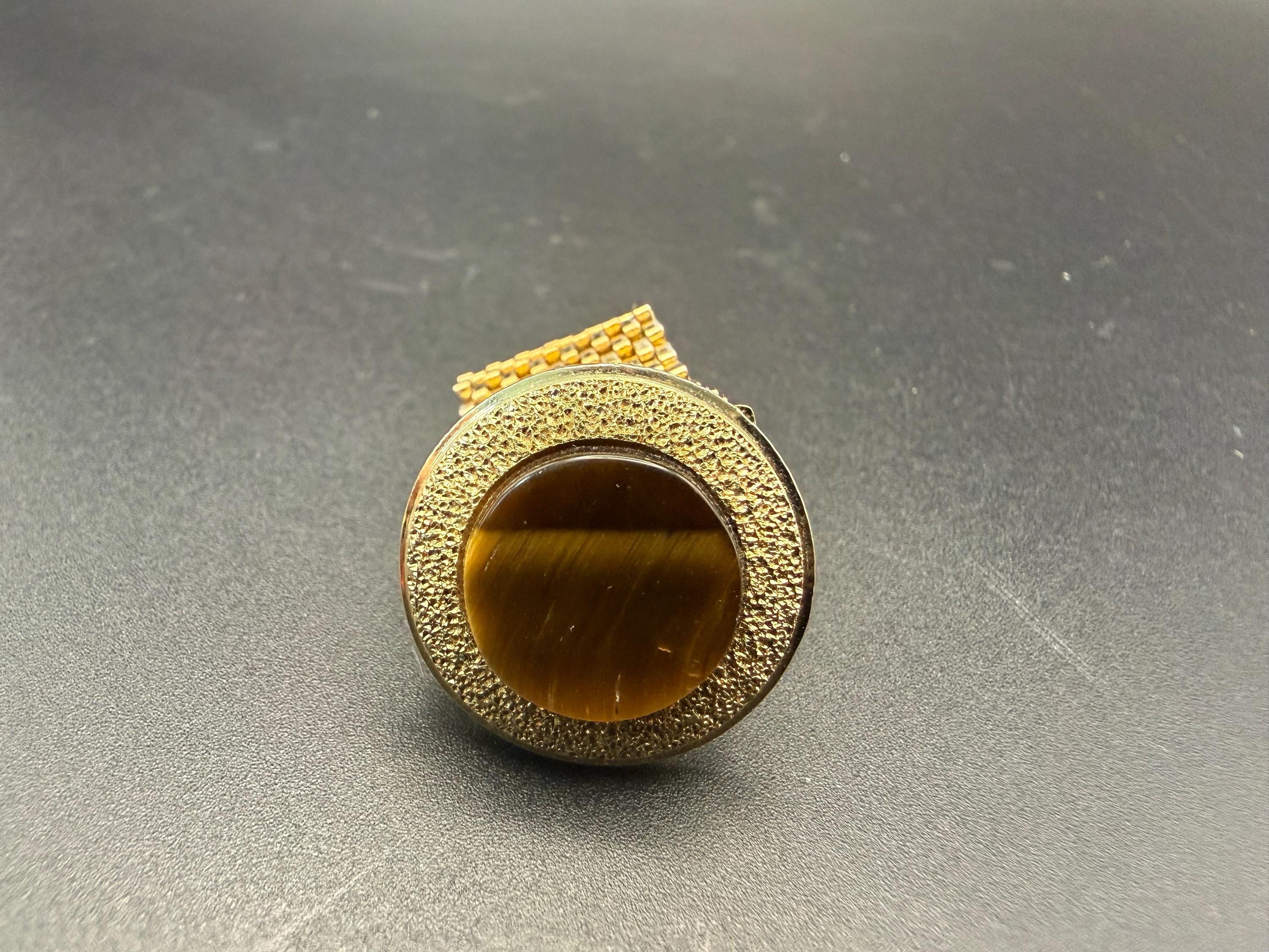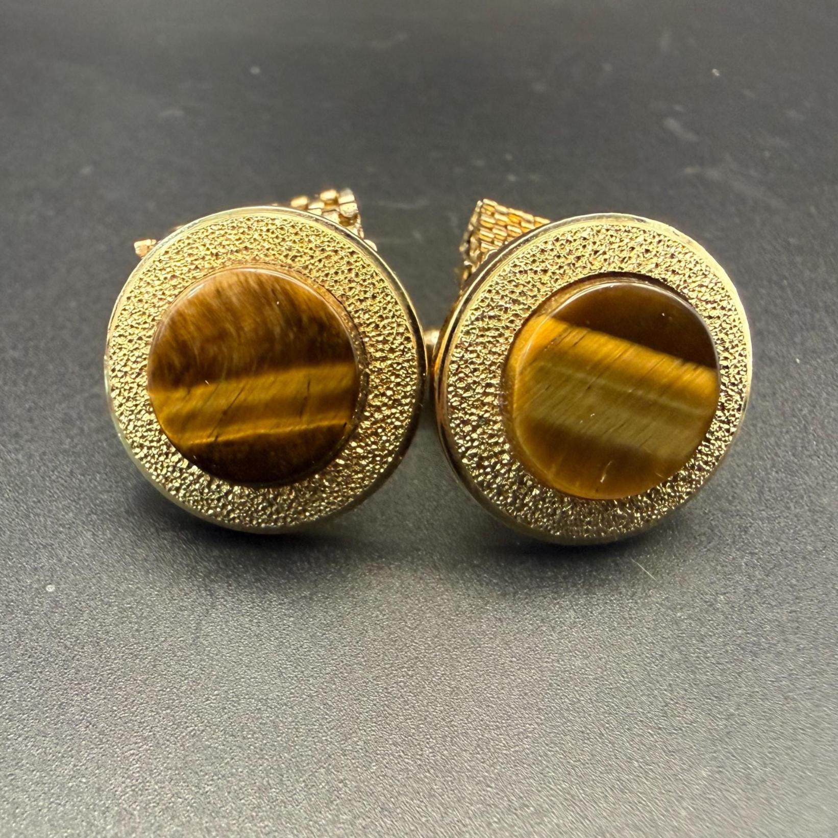 A striking pair of vintage cuff links featuring round tiger’s eye stones set in textured gold tone metal with a classic mesh wrap design. The golden-brown cabochon stones measure 5/8” across, set in a 1” diameter face, and display the natural chatoyancy (cat’s eye effect) that makes tiger’s eye so distinctive.