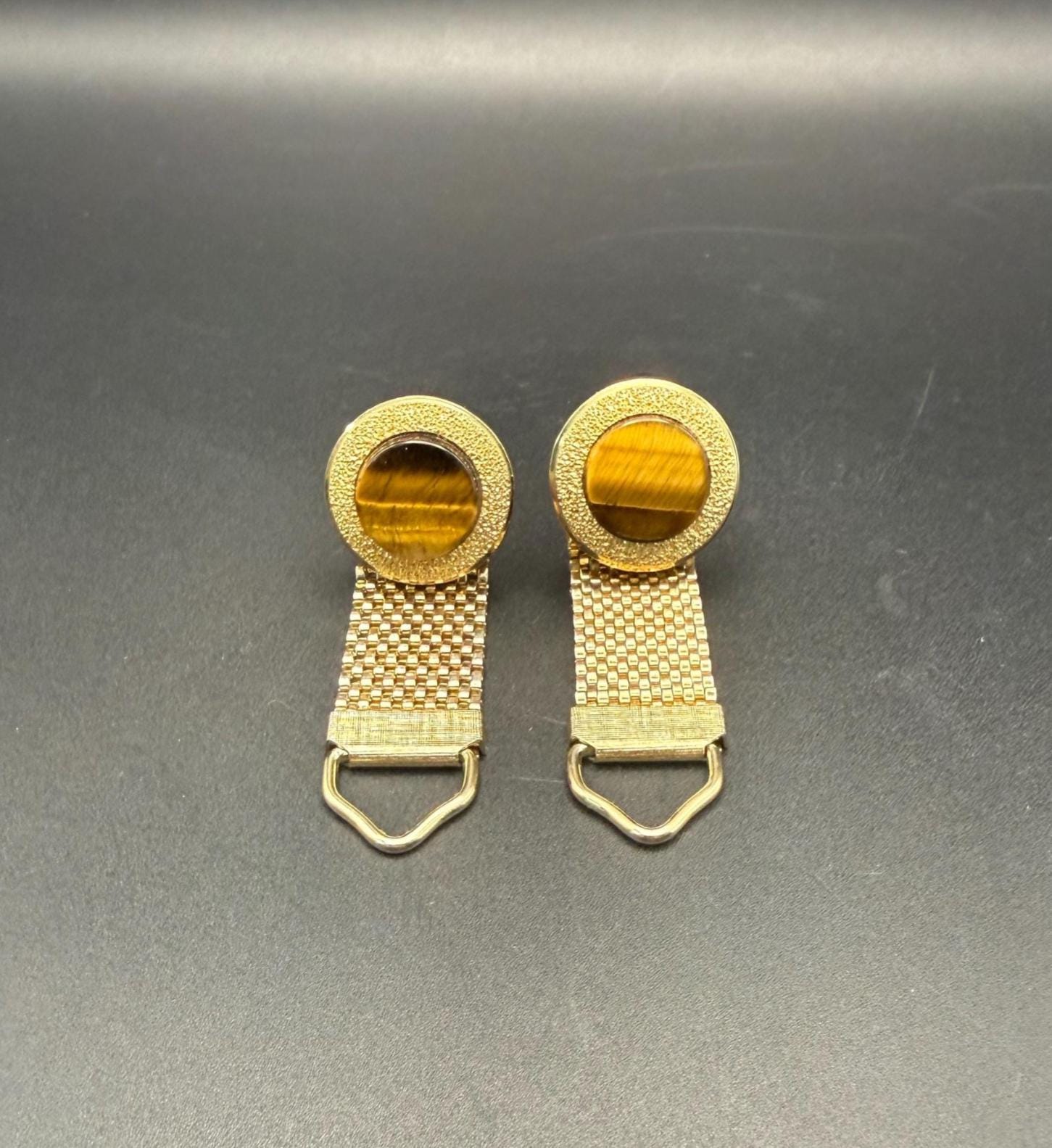 Vintage tiger’s eye cuff links in gold tone mesh wrap design, a timeless mid-century men’s accessory from the 1960s–1970s.