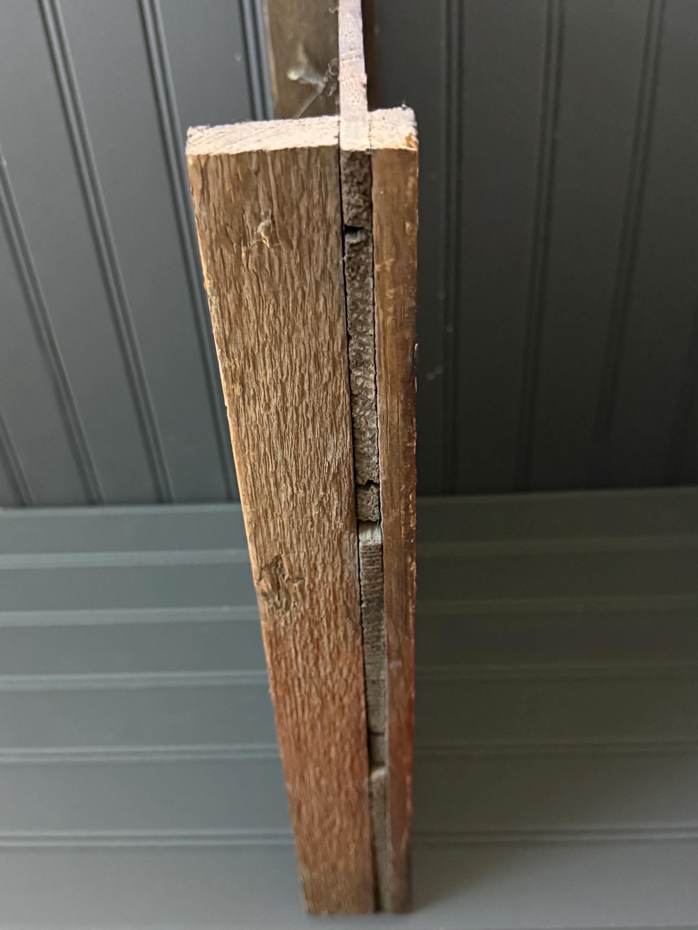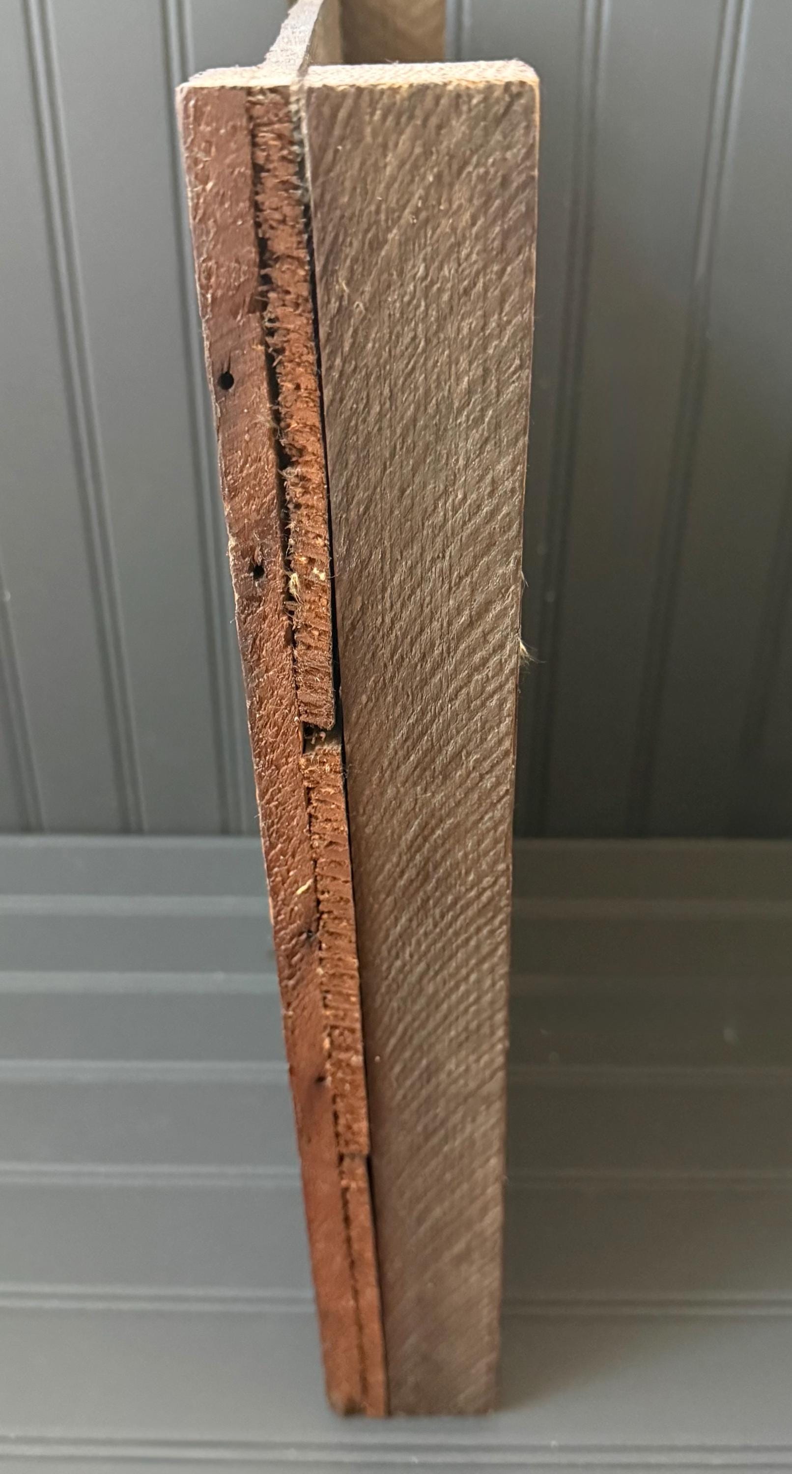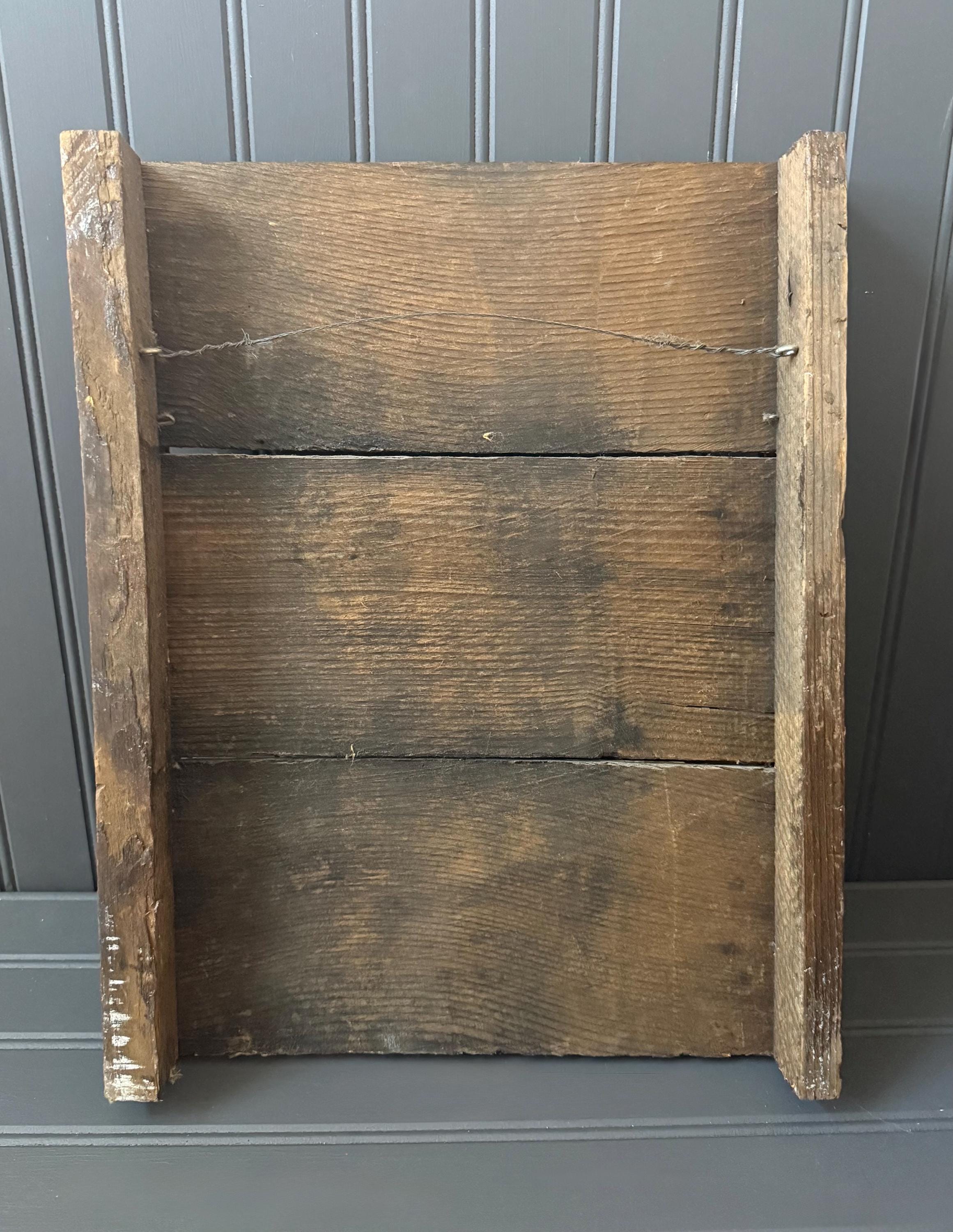 This sign is made of wood slats with an aged paper advertisement mounted on the front. It has a beautiful worn patina and displays wonderfully in a farmhouse kitchen, dairy bar, breakfast nook, barn wall, or vintage-inspired gallery display.