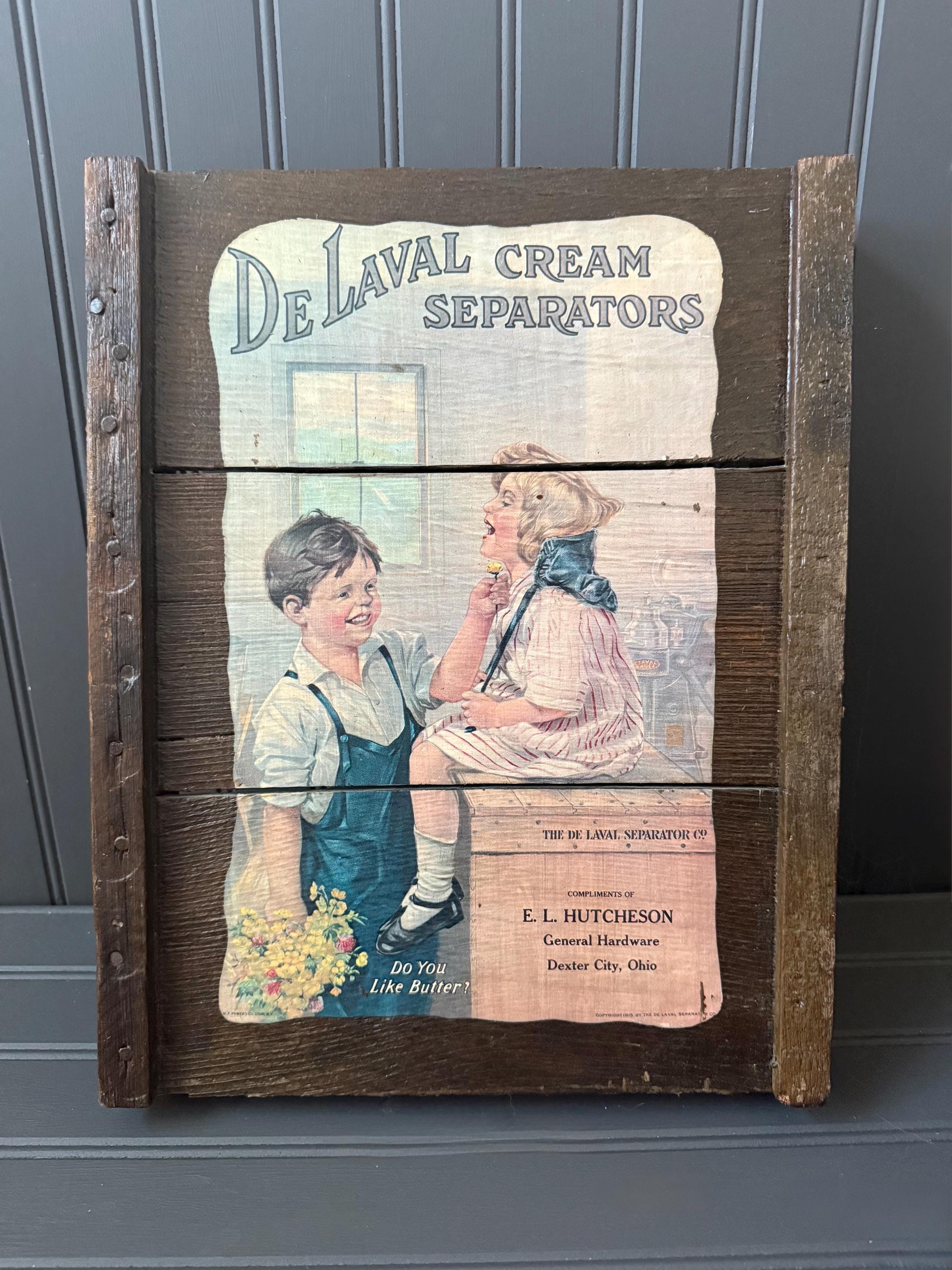 Bring authentic farmhouse character to your space with this vintage De Laval Cream Separators advertising sign. This rustic wood wall piece features charming early dairy artwork and the nostalgic slogan “Do You Like Butter?”. A wonderful piece of agricultural history and Americana décor.