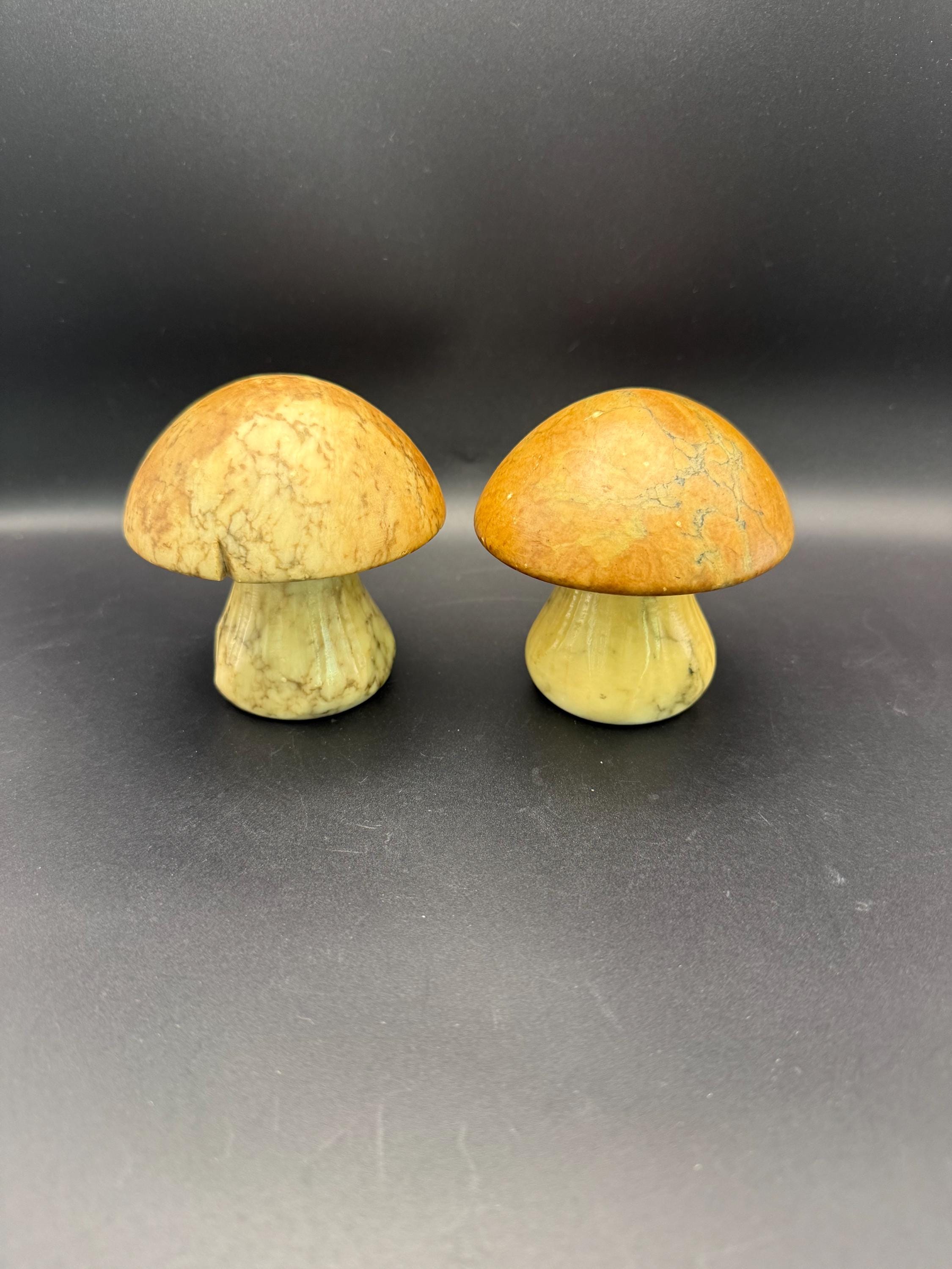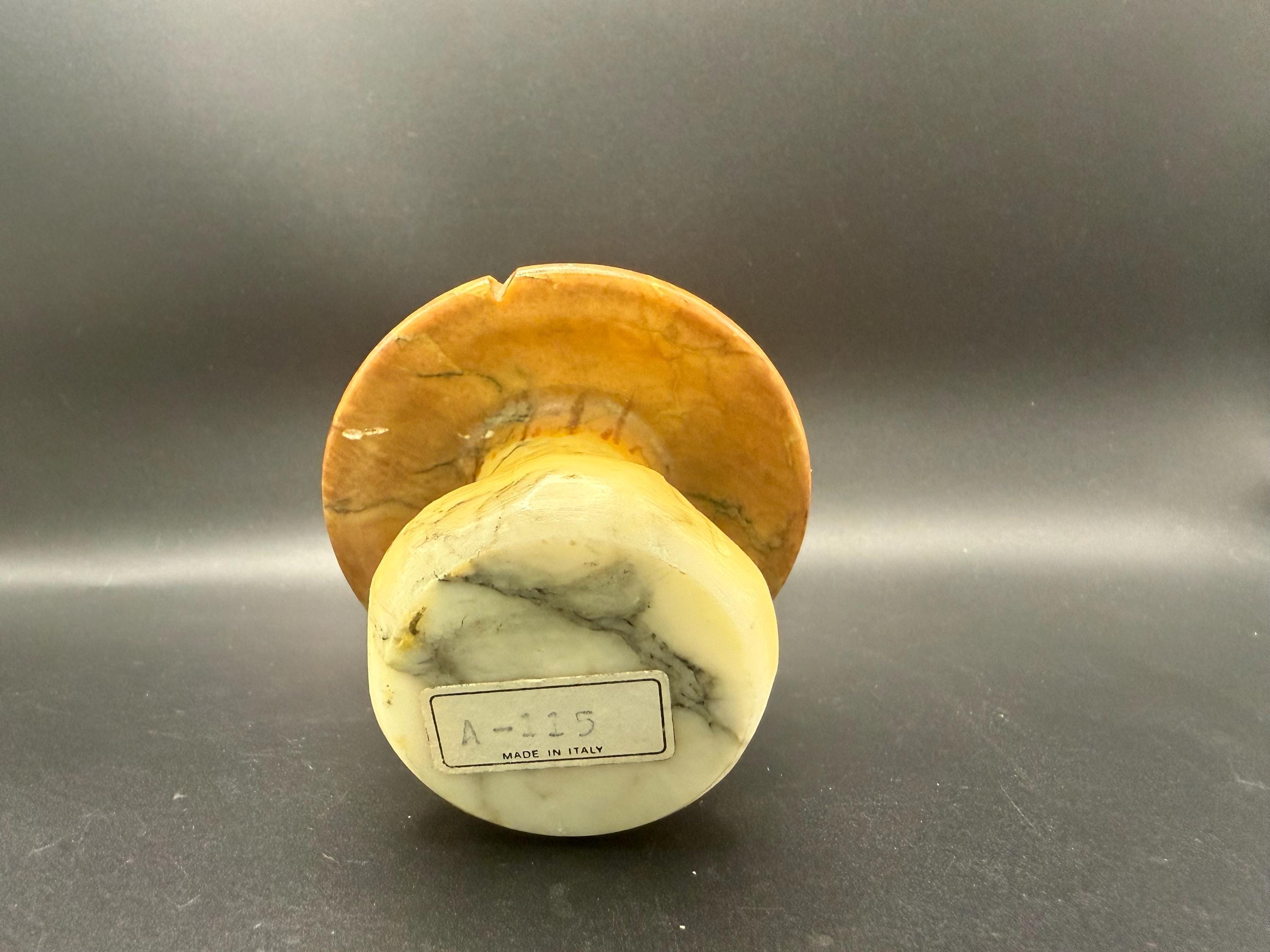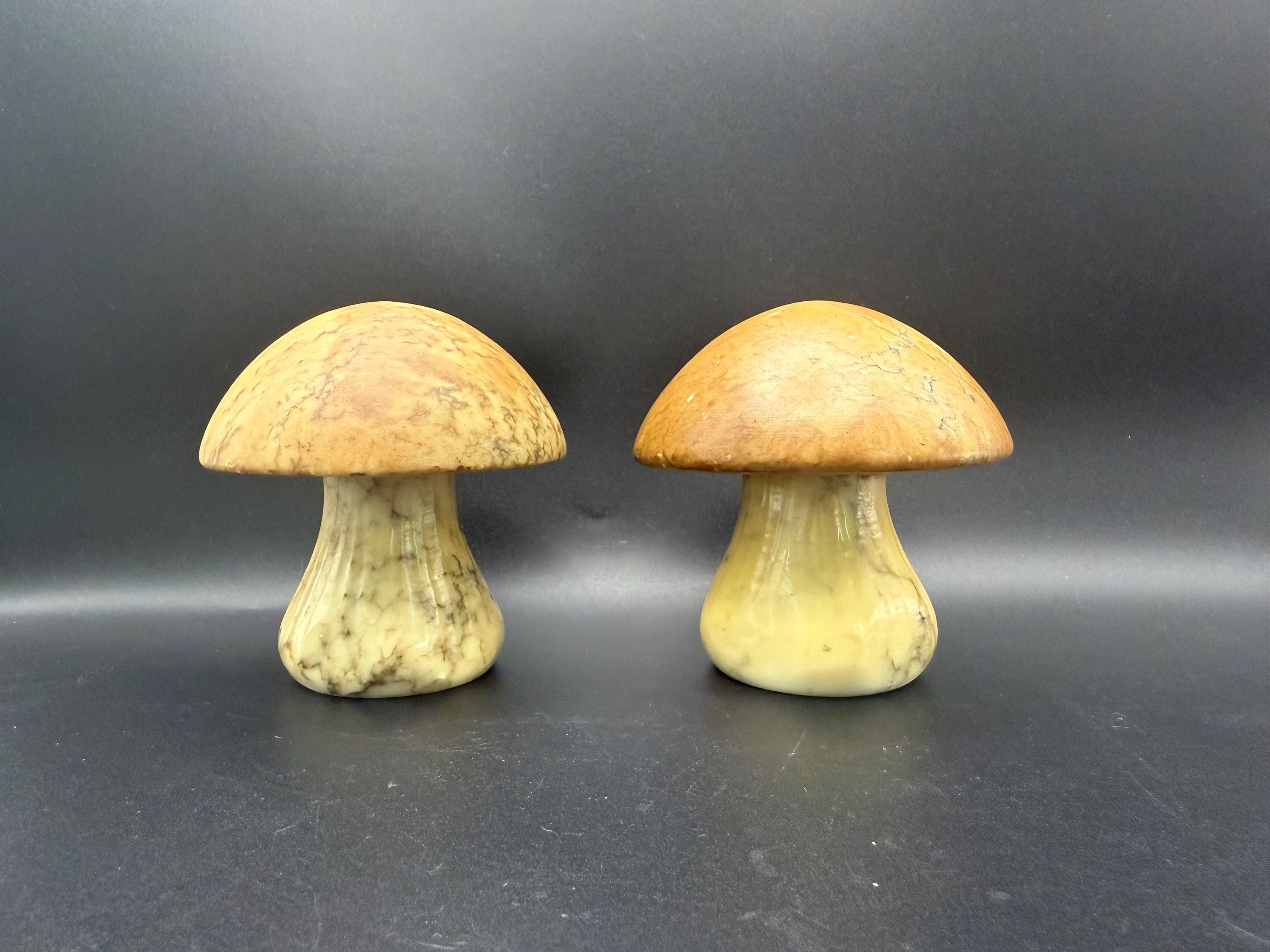 Bring a touch of European charm and earthy warmth into your home with this vintage pair of hand-carved alabaster mushrooms — made in Italy. Each piece is sculpted from natural stone with beautiful honey and cream veining, giving them a timeless organic look.