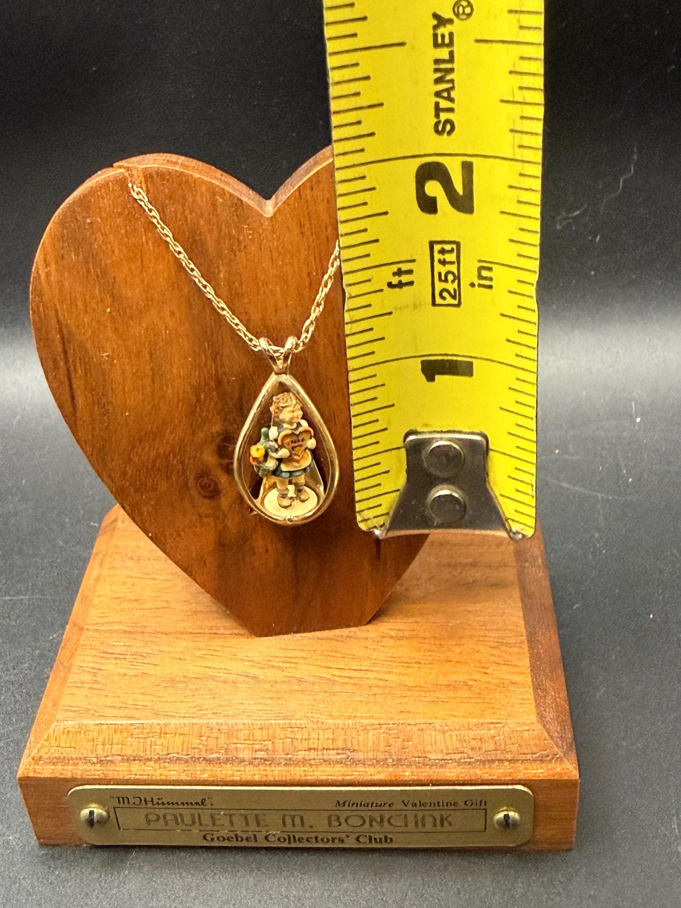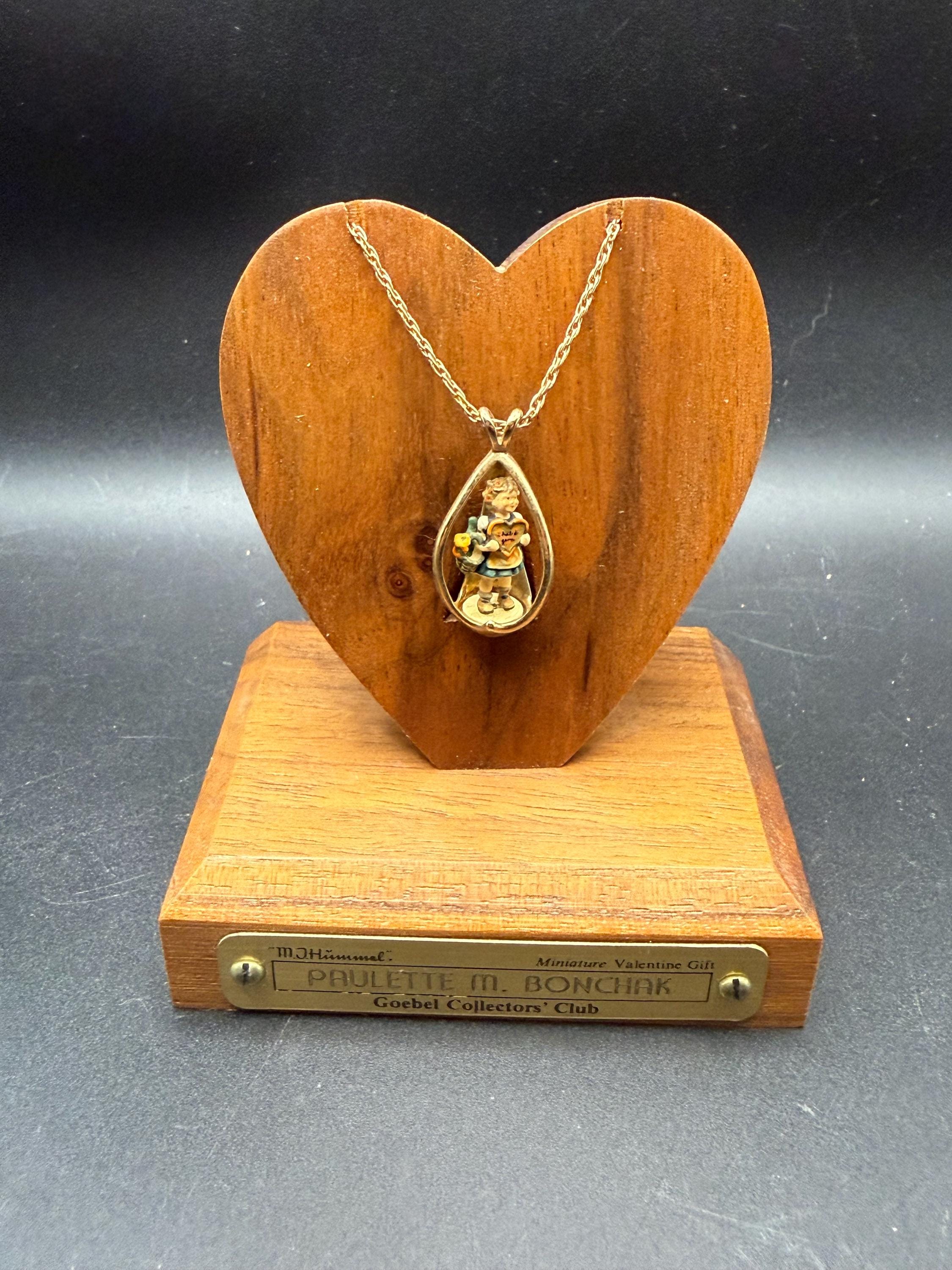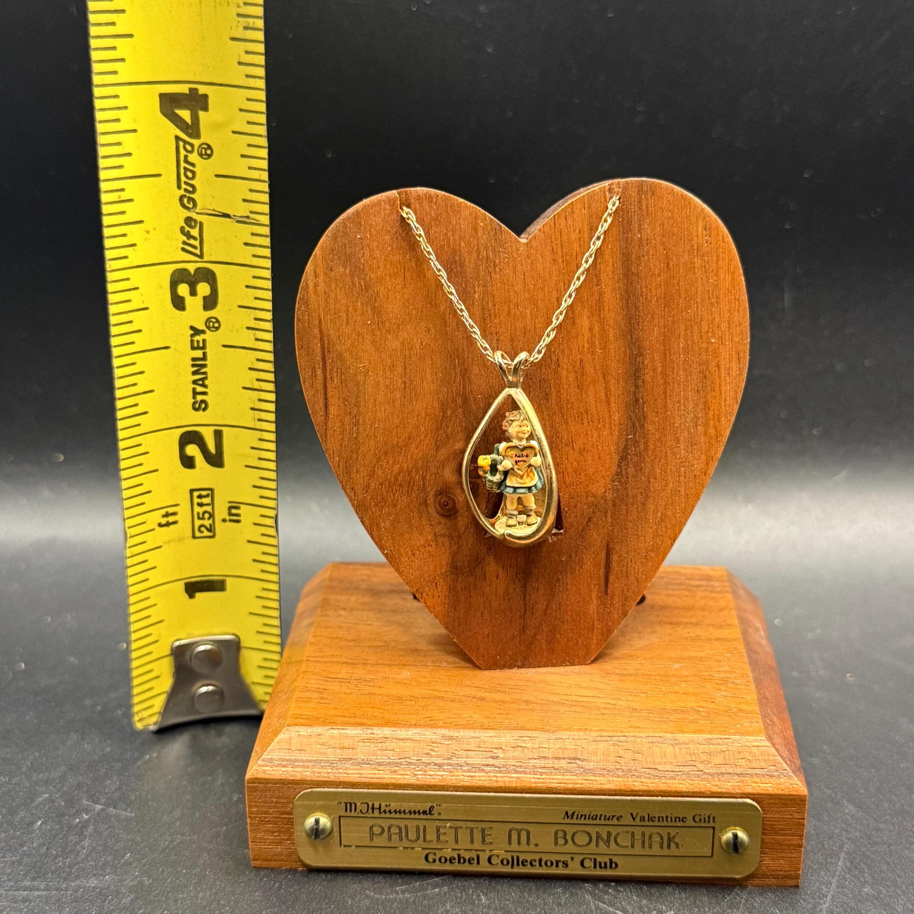 Vintage Goebel M.I. Hummel miniature Valentine necklace, presented on original wooden heart display from the Goebel Collectors’ Club. Features a tiny hand-painted Hummel girl holding a heart and flower inside a teardrop pendant frame. A rare collector piece and charming gift for any Hummel lover or vintage collector.