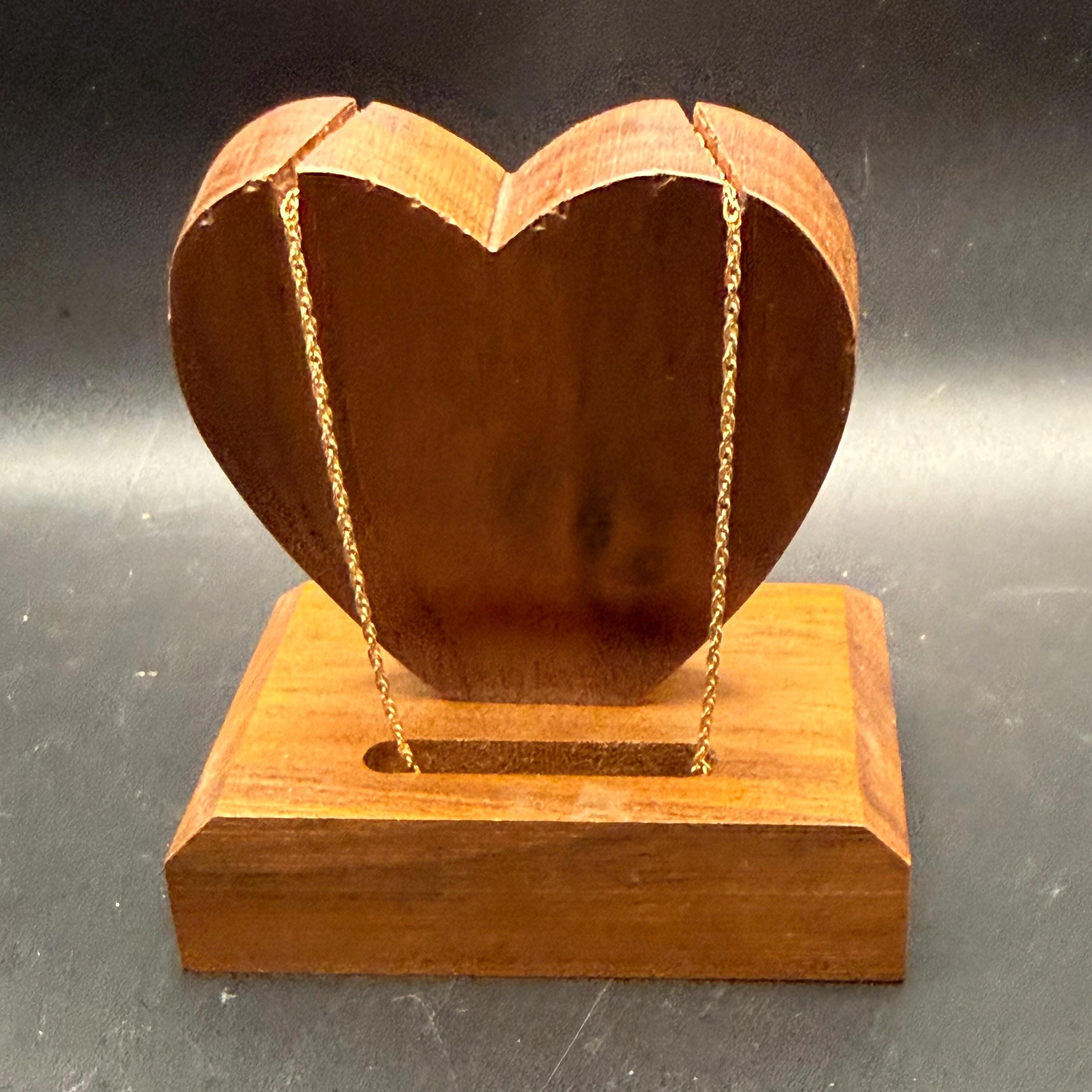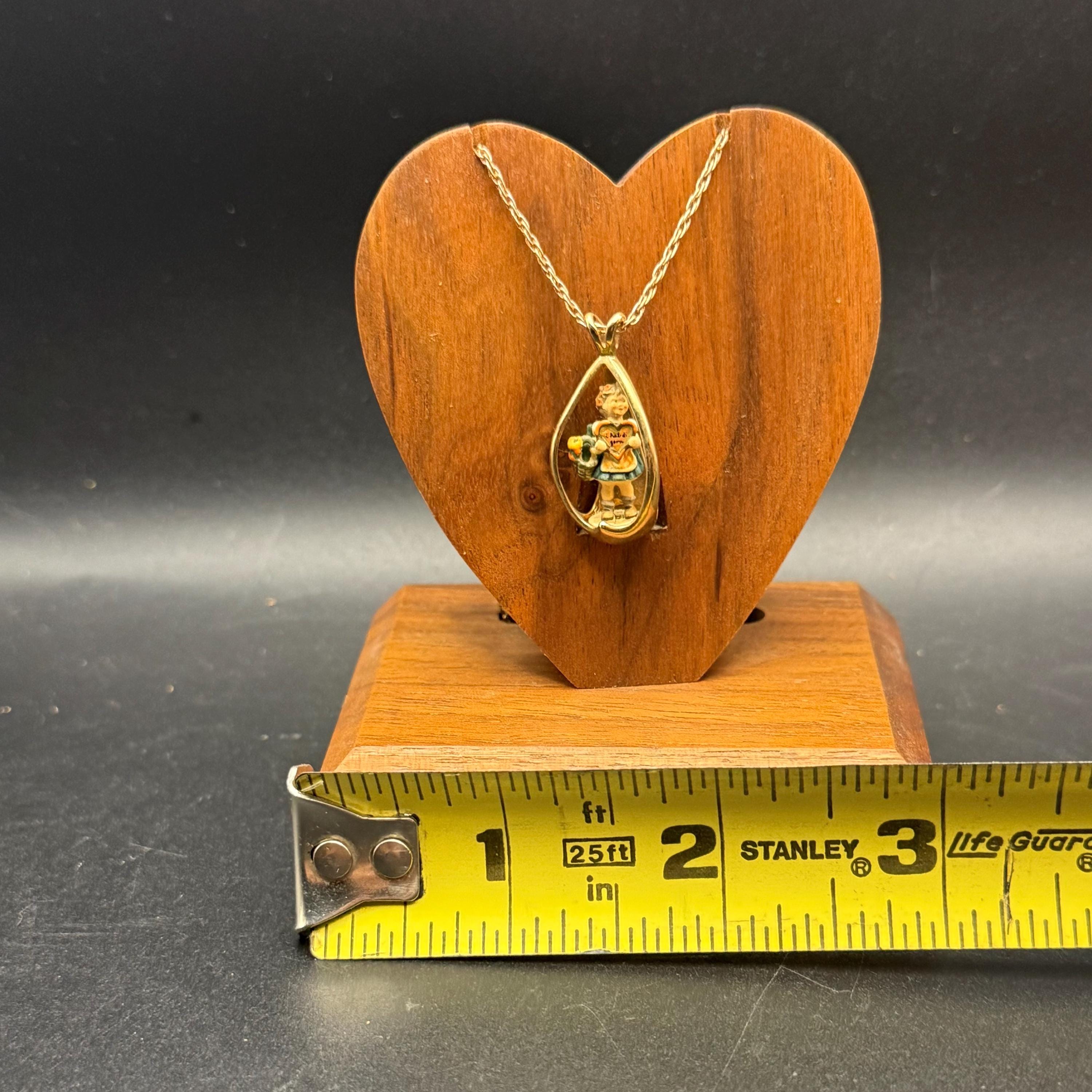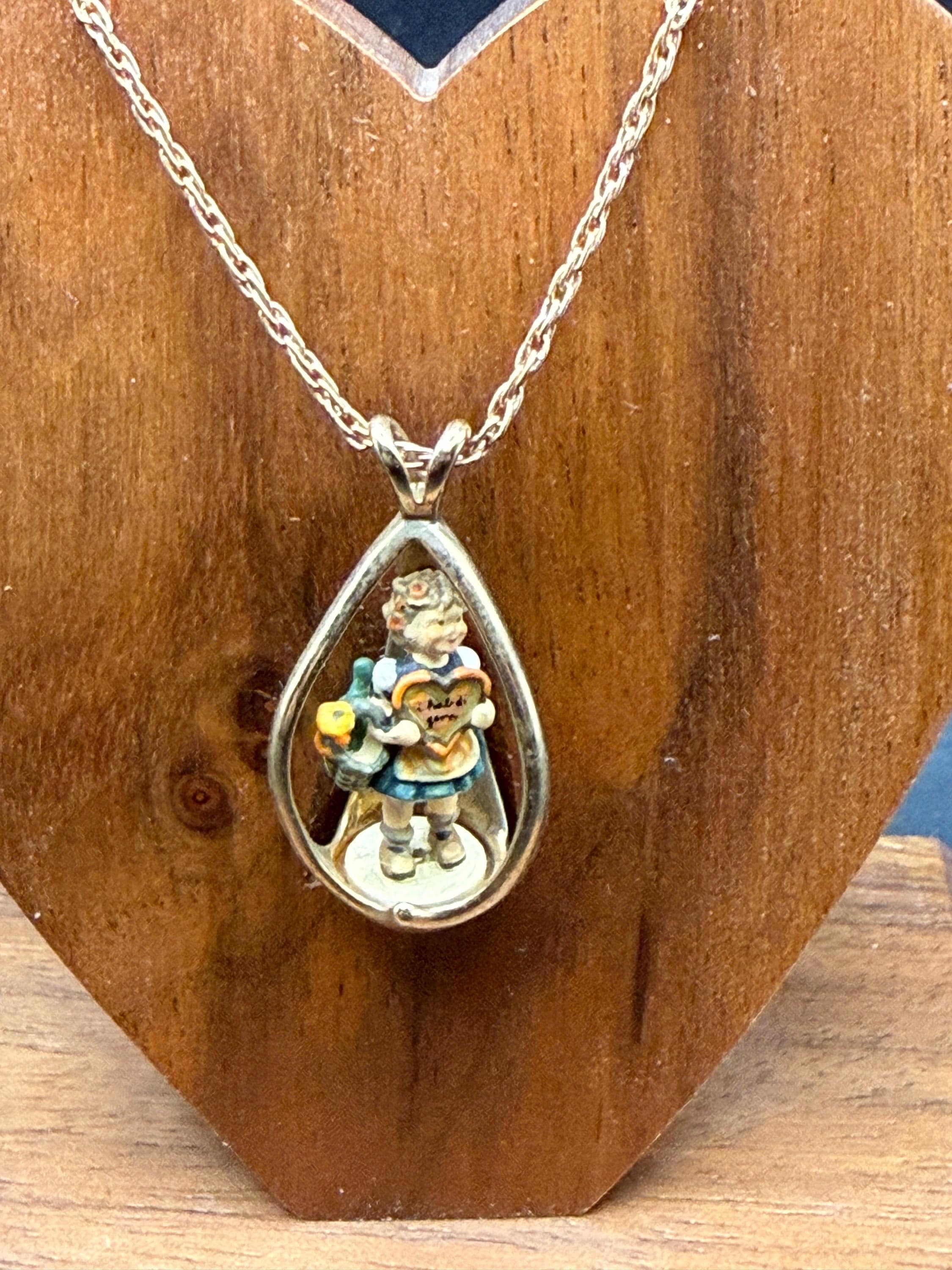 Vintage Goebel M.I. Hummel miniature Valentine necklace, presented on original wooden heart display from the Goebel Collectors’ Club. Features a tiny hand-painted Hummel girl holding a heart and flower inside a teardrop pendant frame. A rare collector piece and charming gift for any Hummel lover or vintage collector.