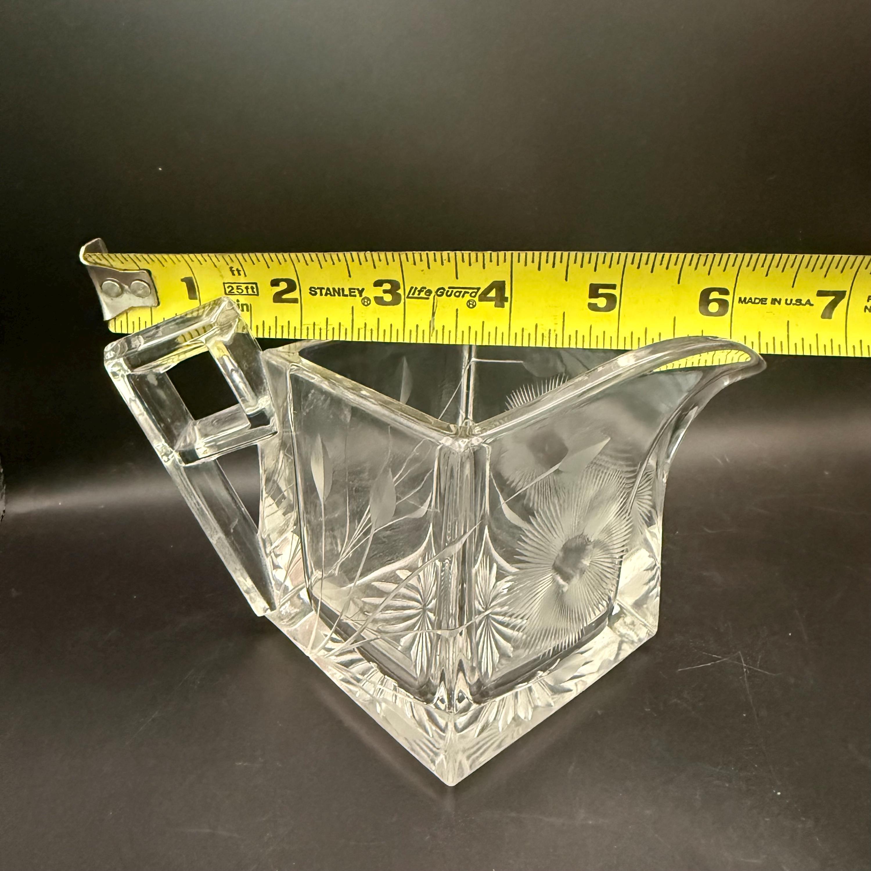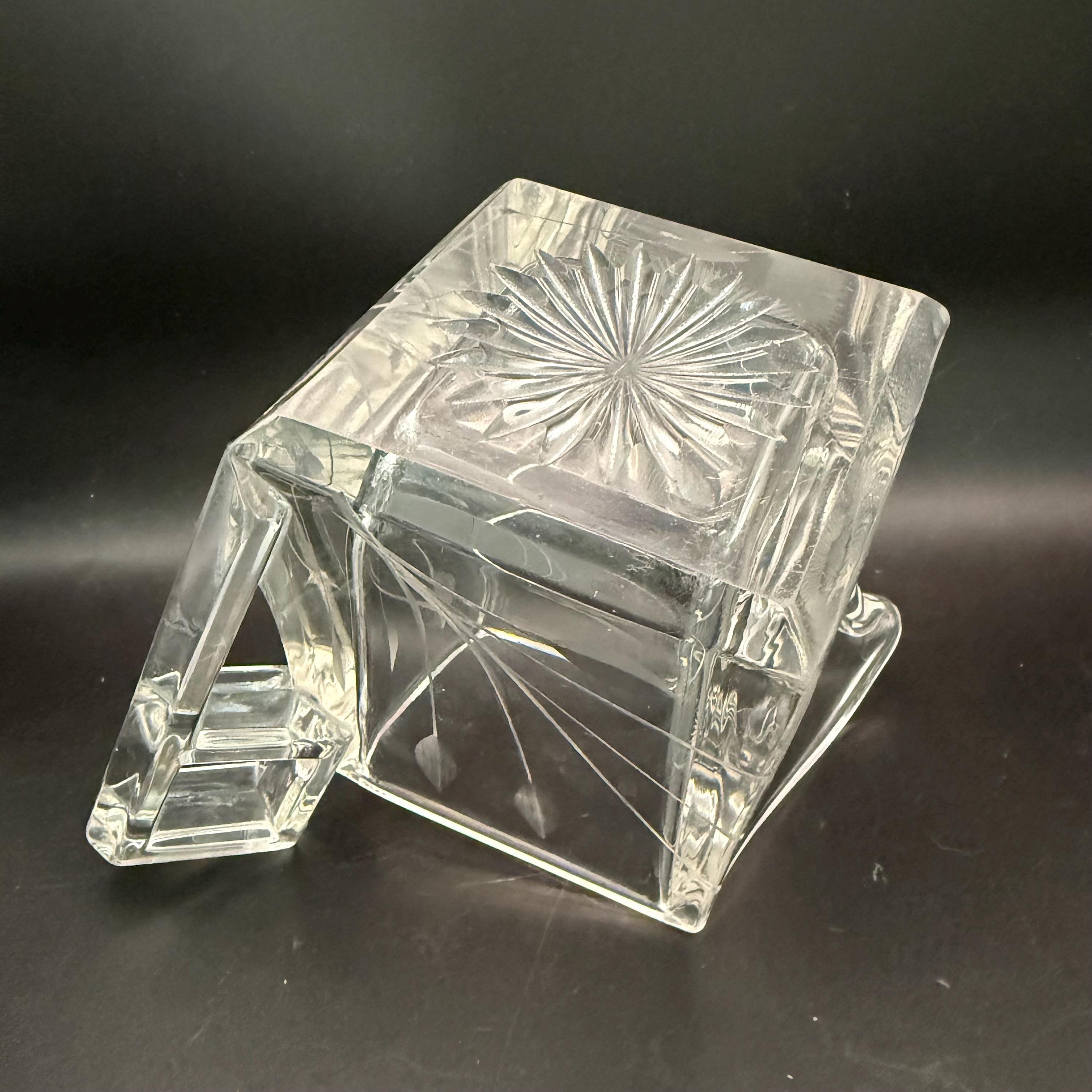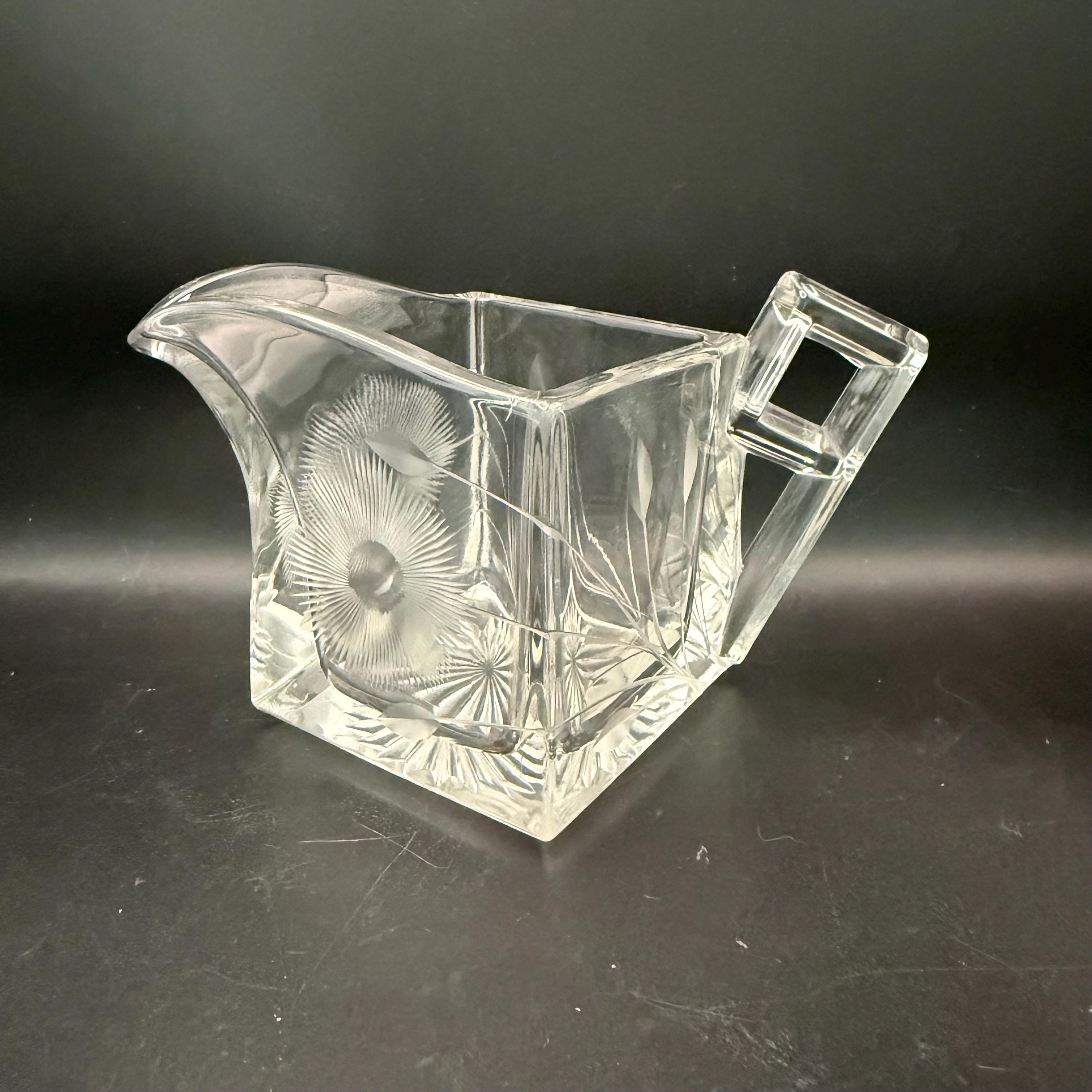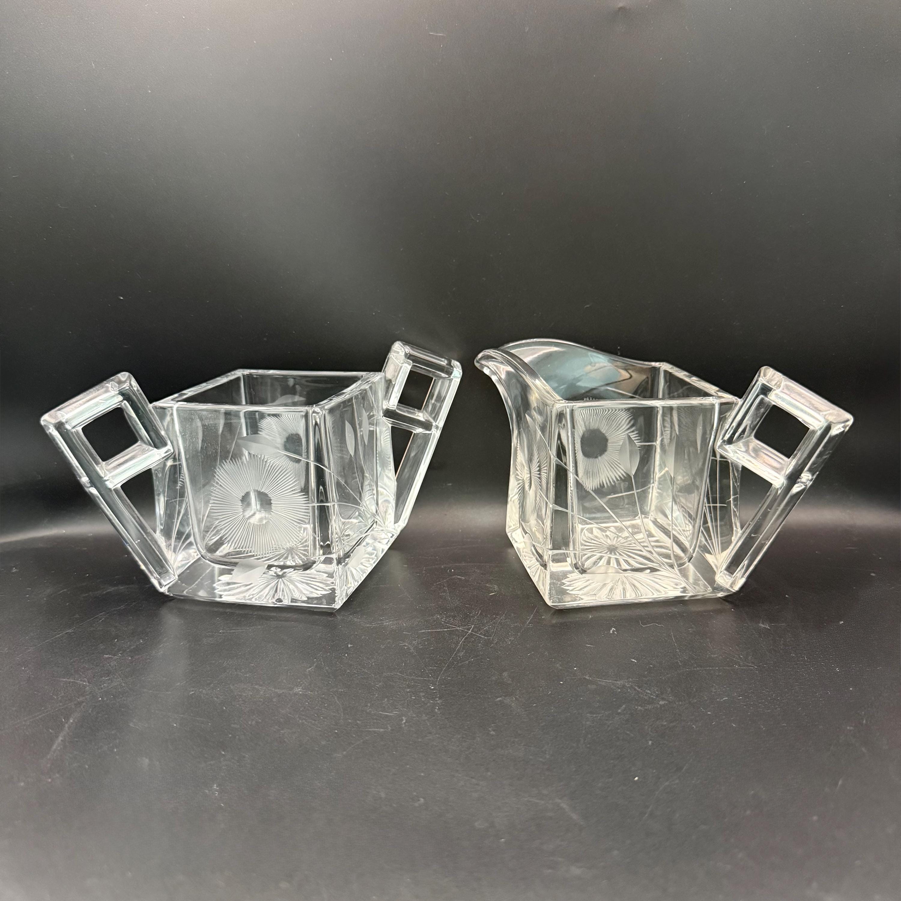 Elegant vintage Heisey style “Quator” etched glass creamer and sugar set featuring striking square Art Deco handles and wheel-etched floral panels. This set is made of bright, clear elegant glass with starburst bases and beautiful geometric lines that reflect light wonderfully.