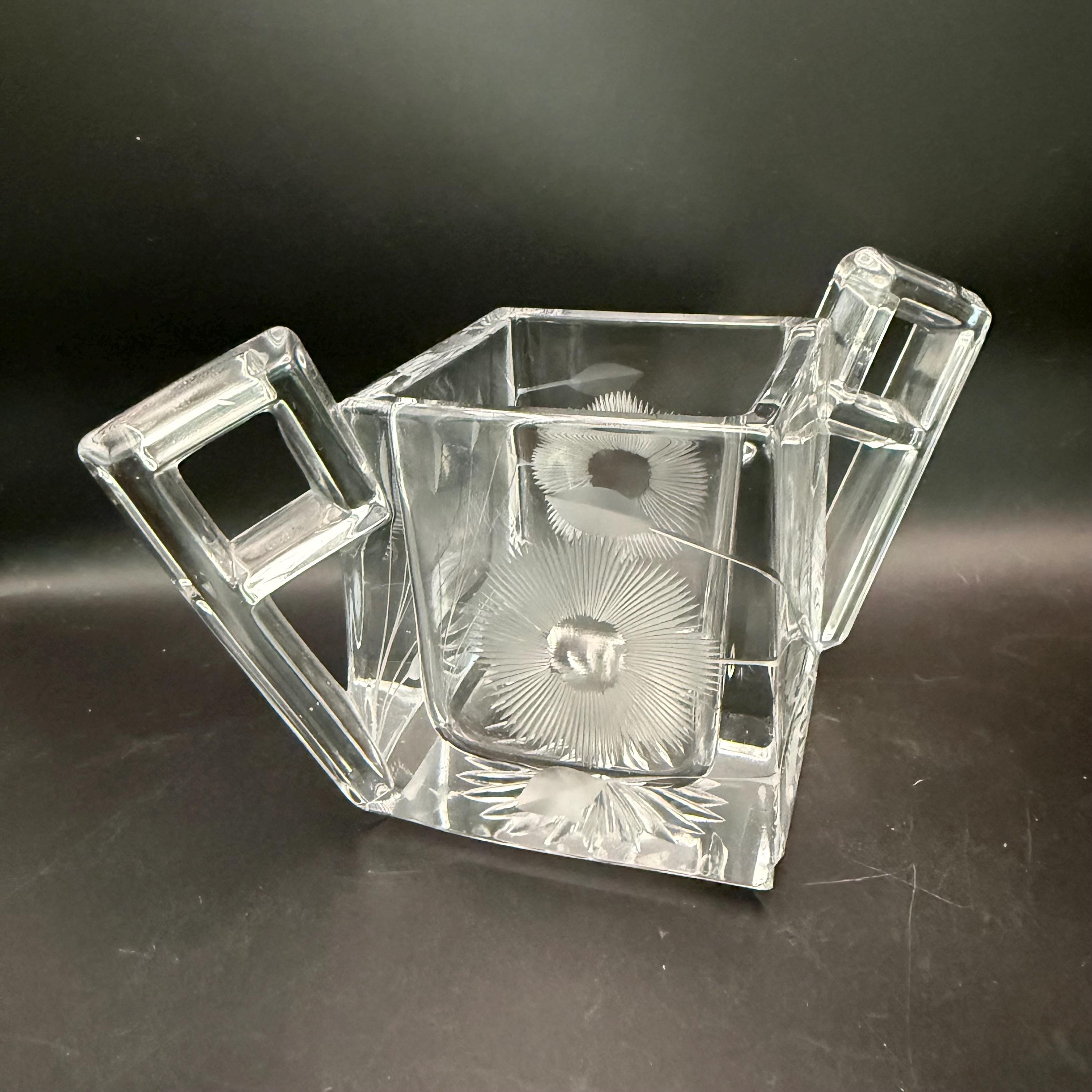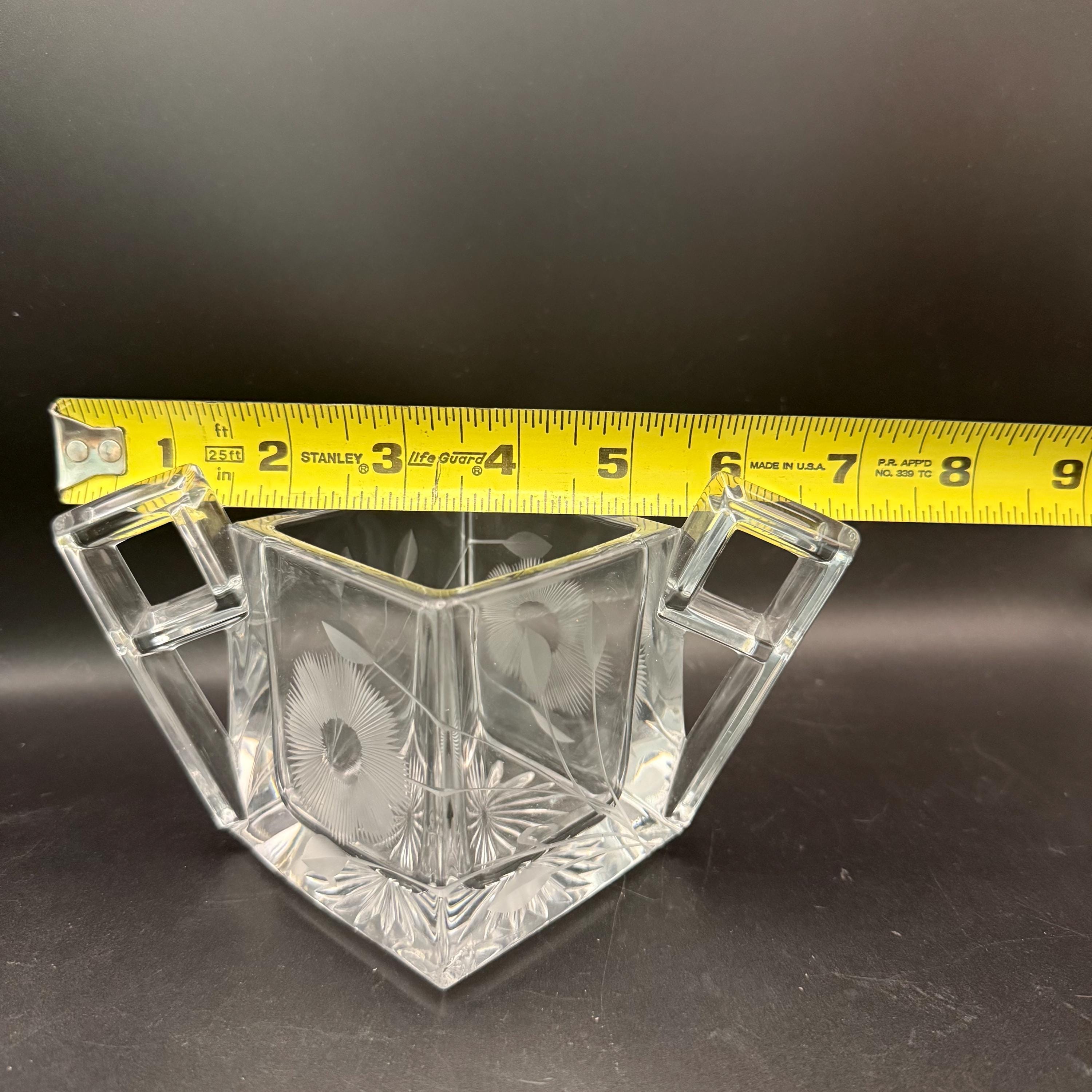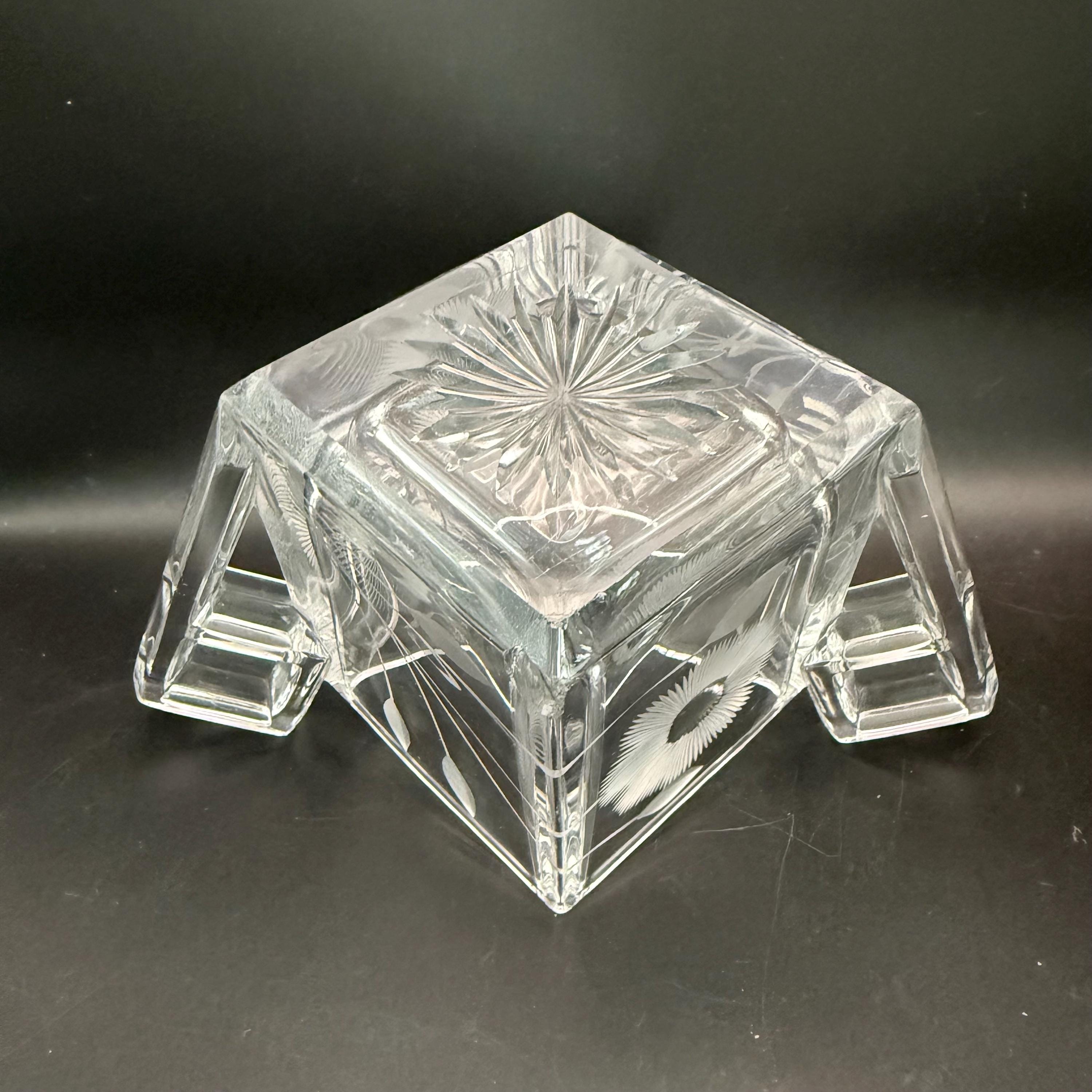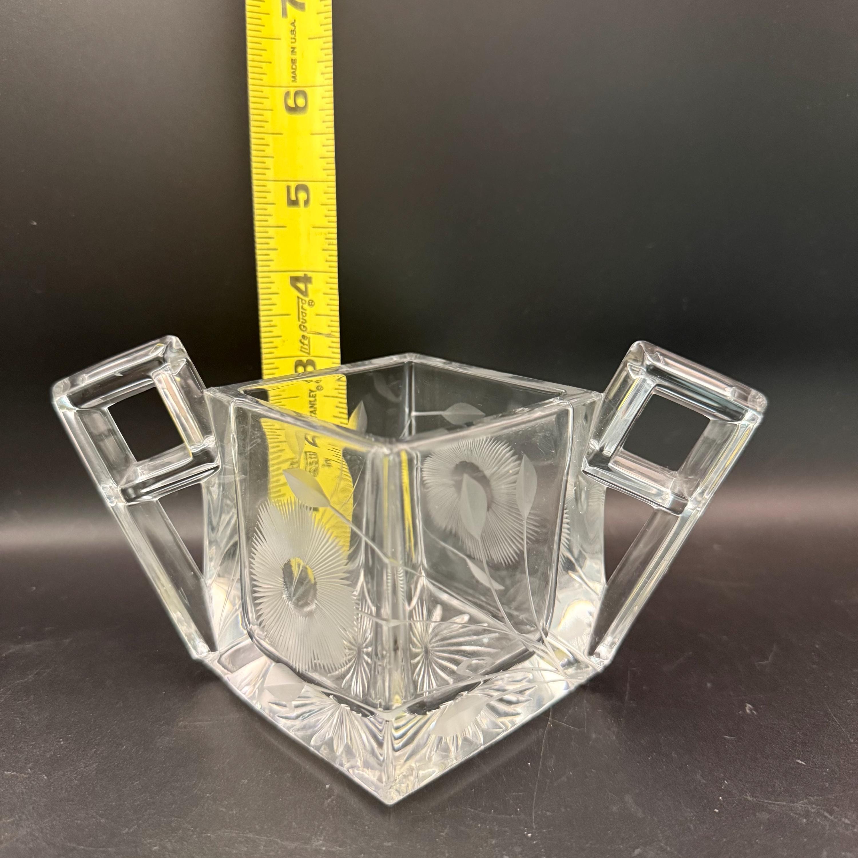 Elegant vintage Heisey style “Quator” etched glass creamer and sugar set featuring striking square Art Deco handles and wheel-etched floral panels. This set is made of bright, clear elegant glass with starburst bases and beautiful geometric lines that reflect light wonderfully.