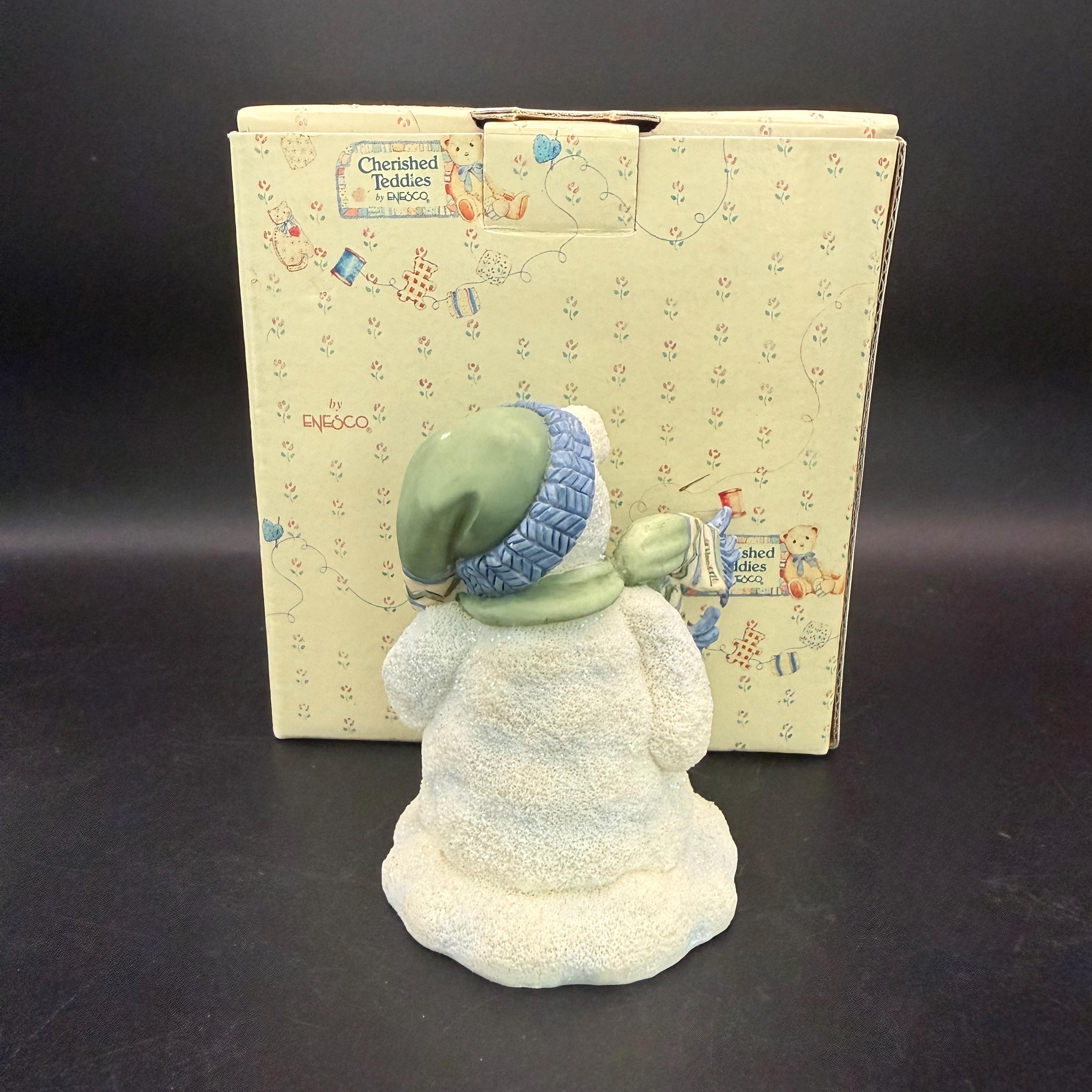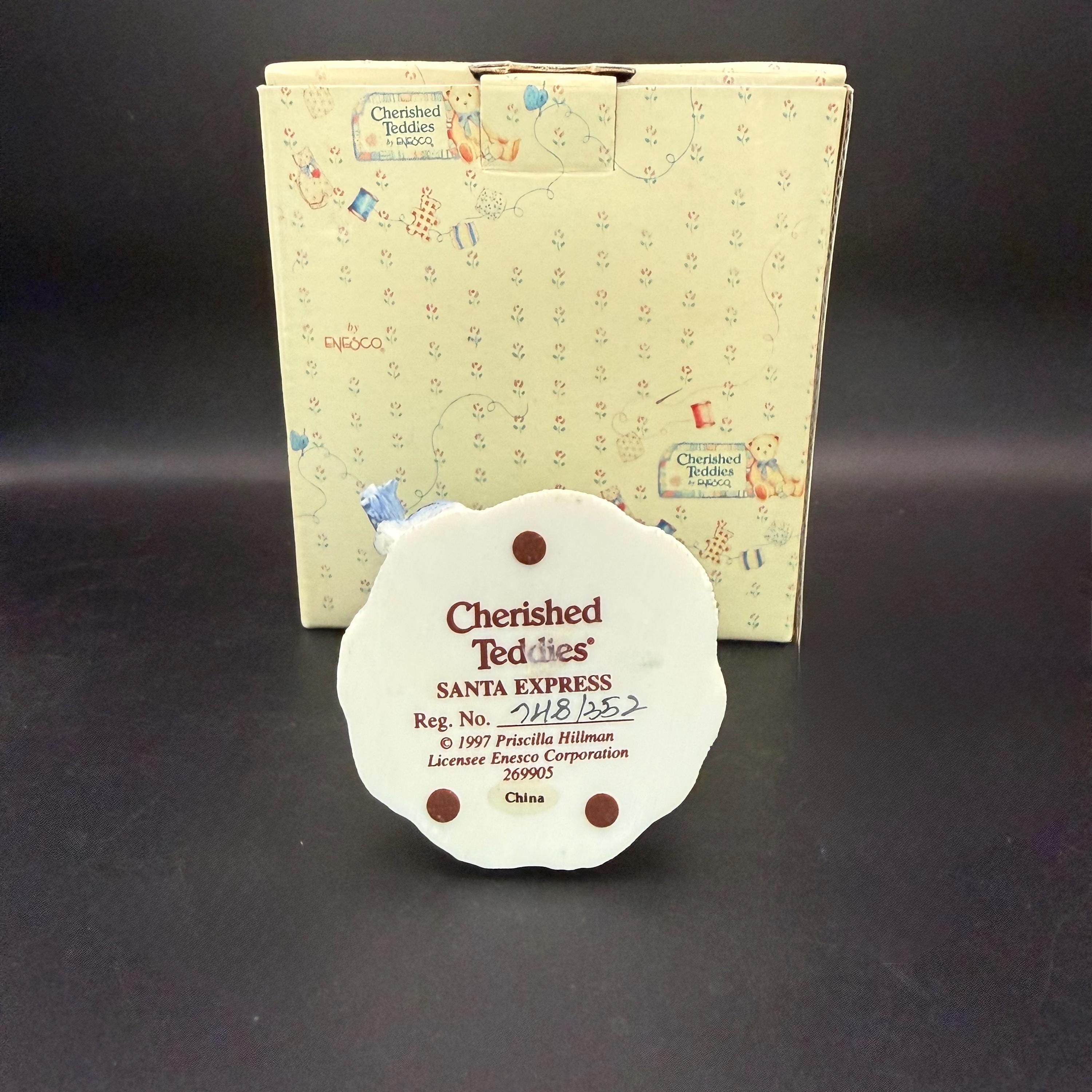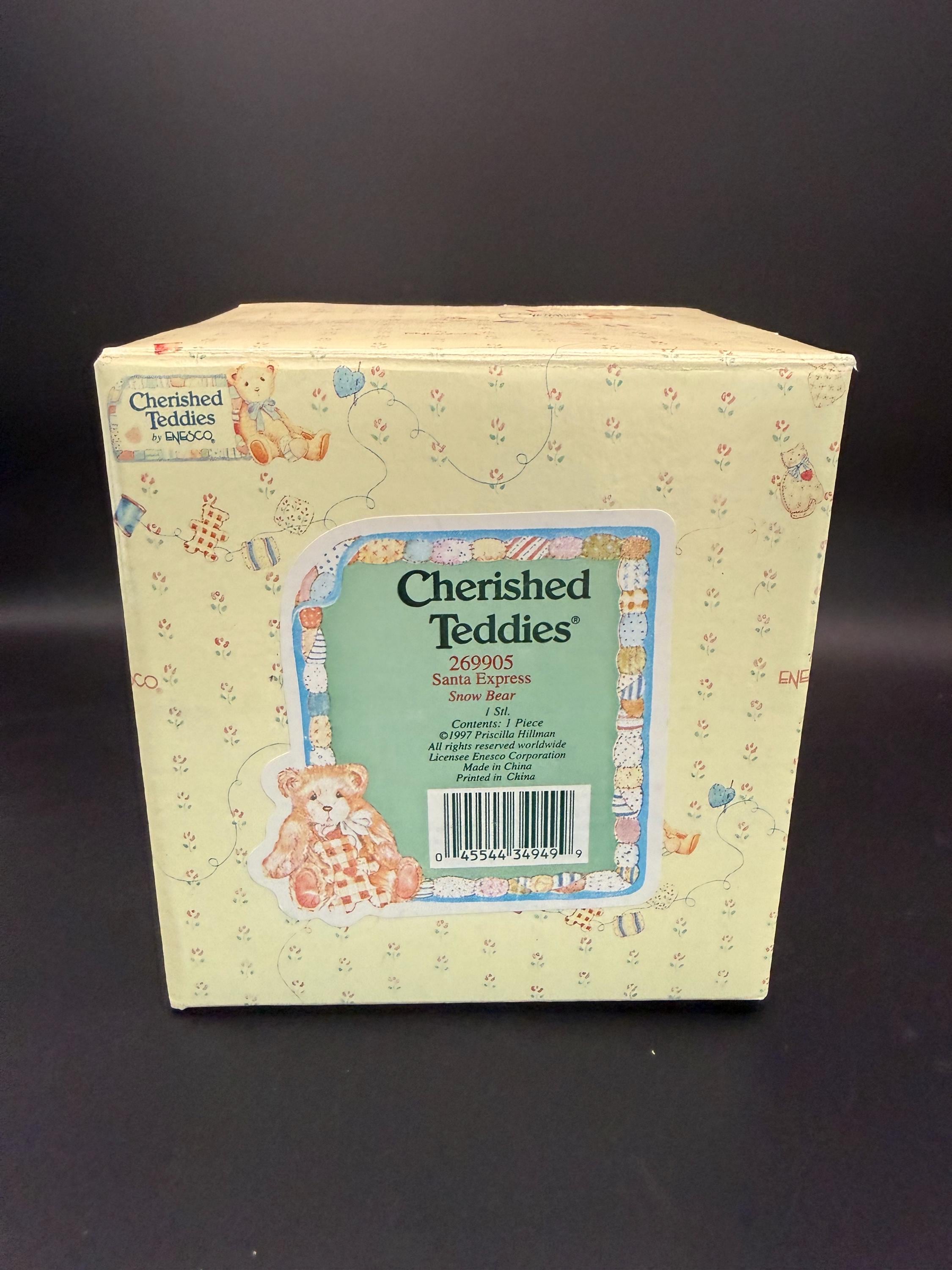 Sweet vintage Cherished Teddies figurine titled “Santa Express – Snow Bear” (Item #269905). Designed by Priscilla Hillman in 1997 and produced by Enesco. Comes with original box. Cozy holiday cottage style and perfect for Christmas decorating or collecting.