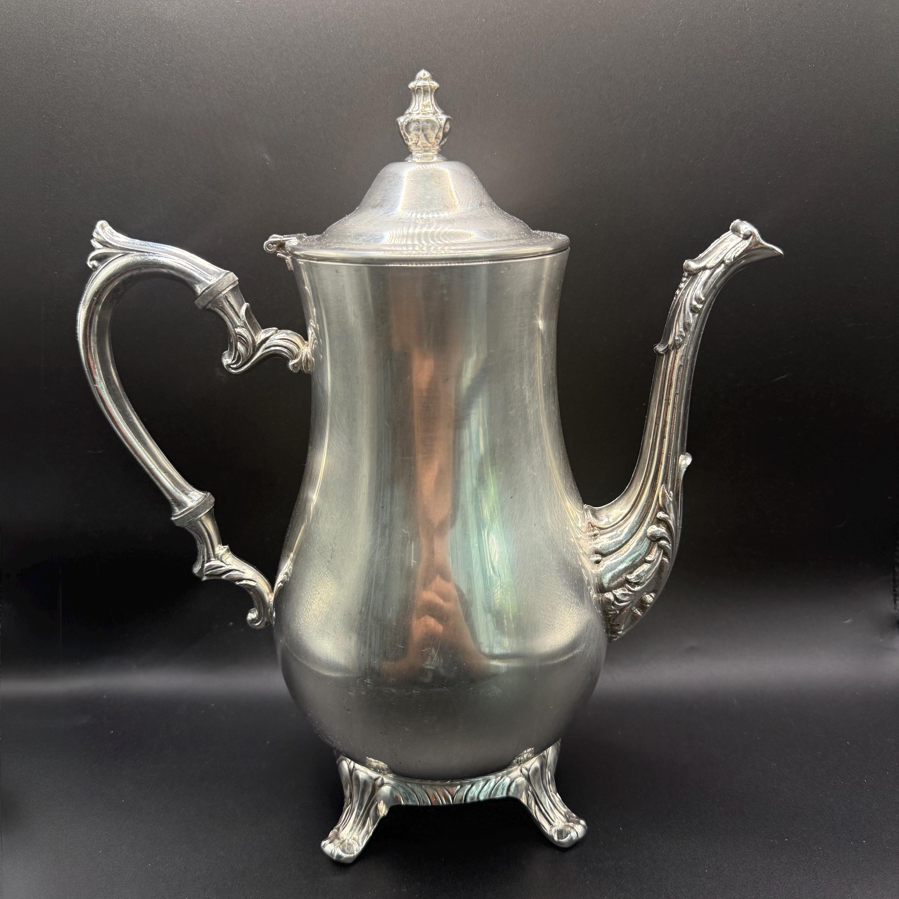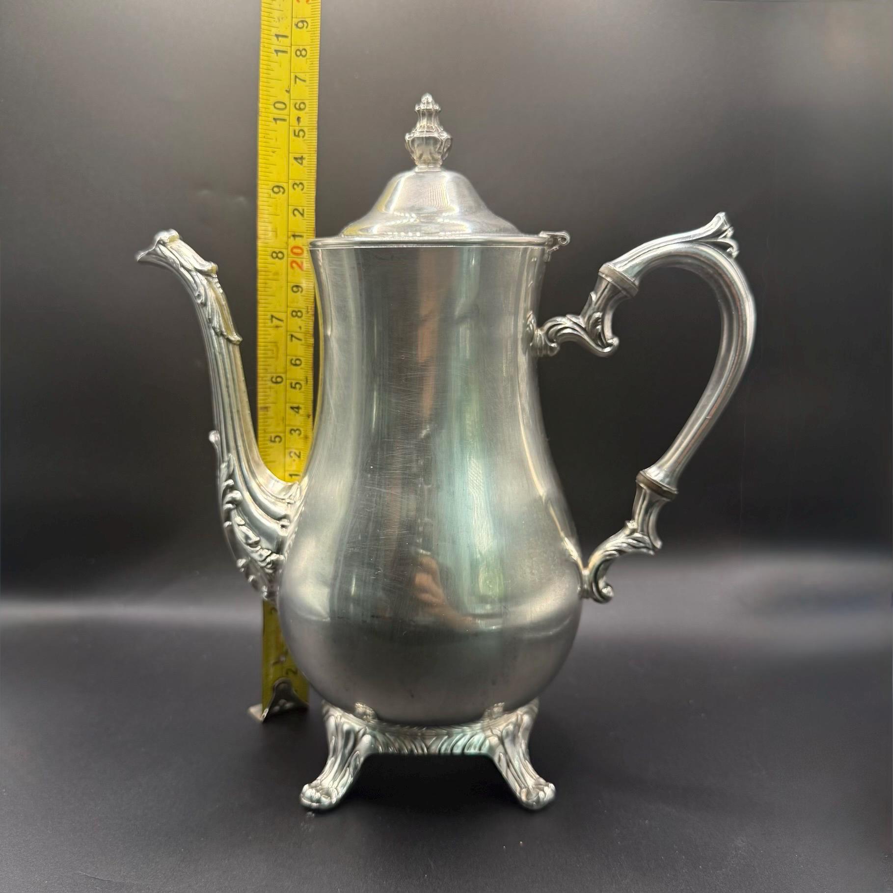• Coffee Pot – approx. 10–11” tall; ornate spout, sculpted handle, footed base