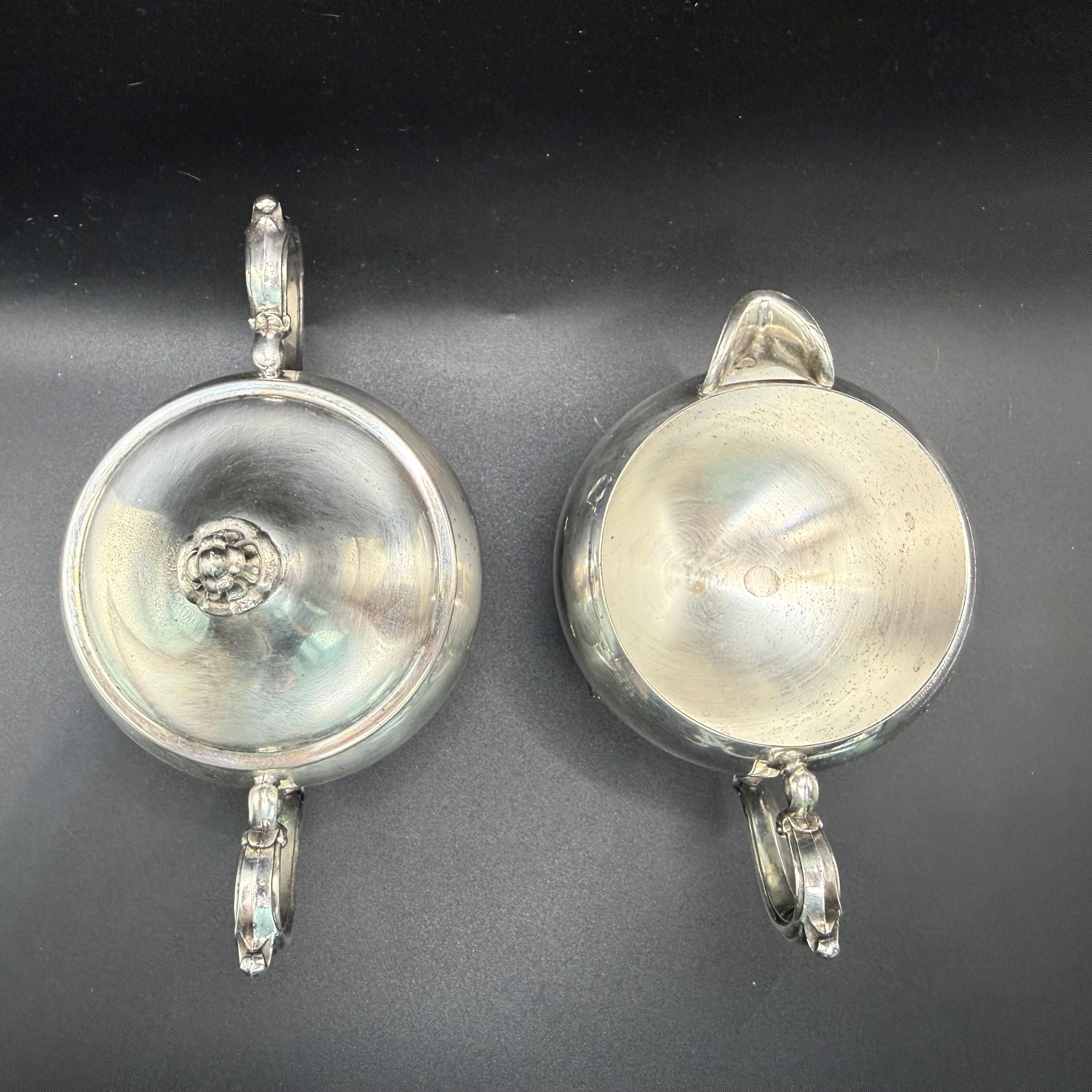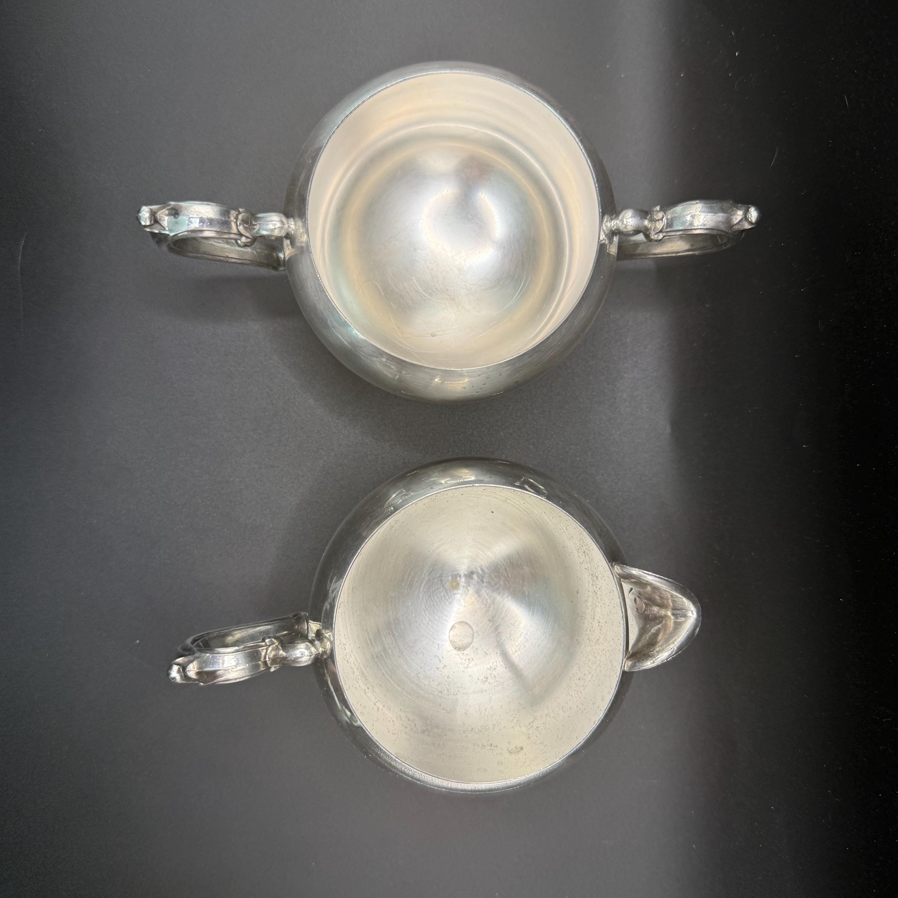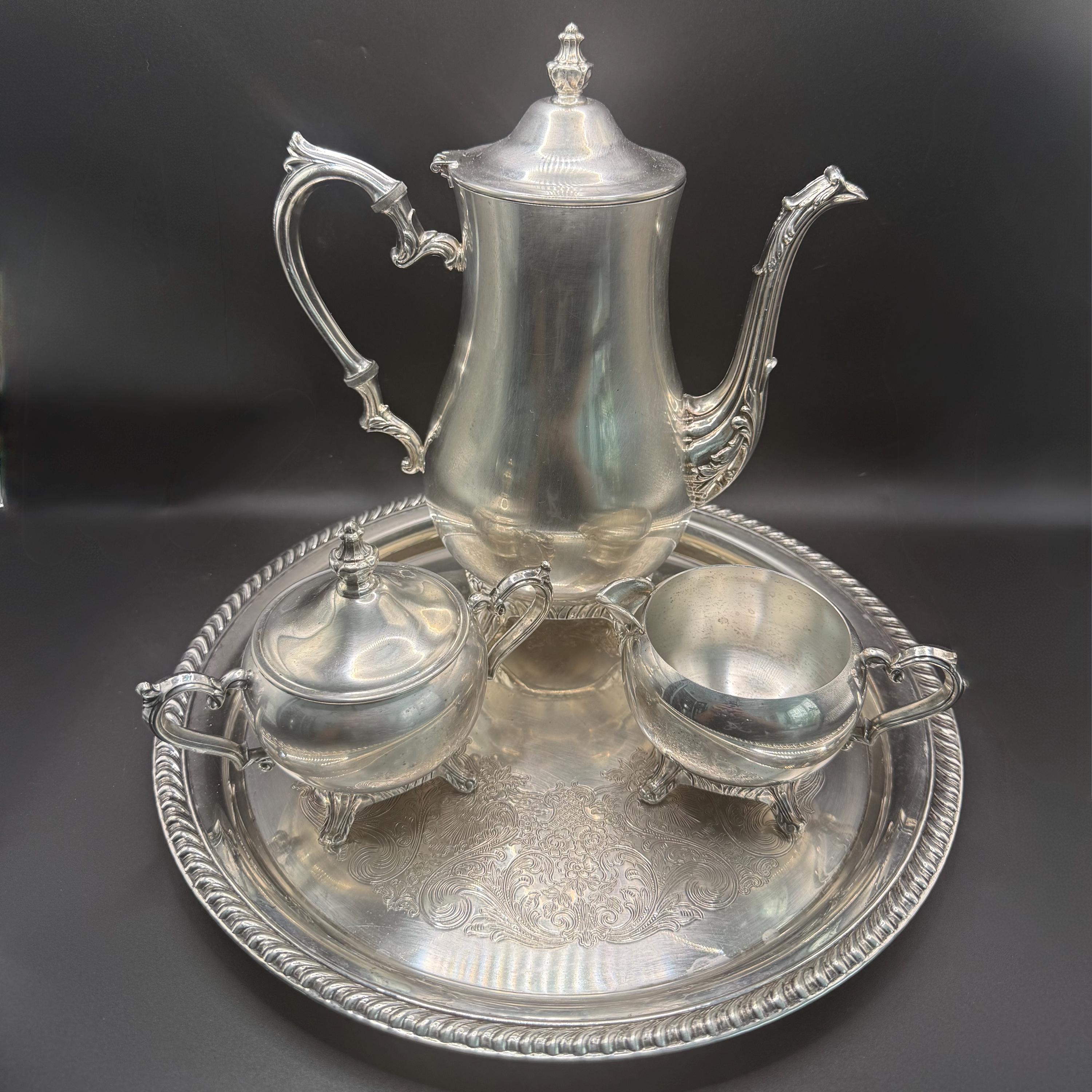 The matching set includes a tall coffee pot, a lidded sugar bowl, a creamer, and a coordinating serving tray with a rope-twist border and ornate engraved center. Whether styled on a sideboard, used for special gatherings, or displayed as part of a vintage collection, this set adds a touch of classic charm to any room.