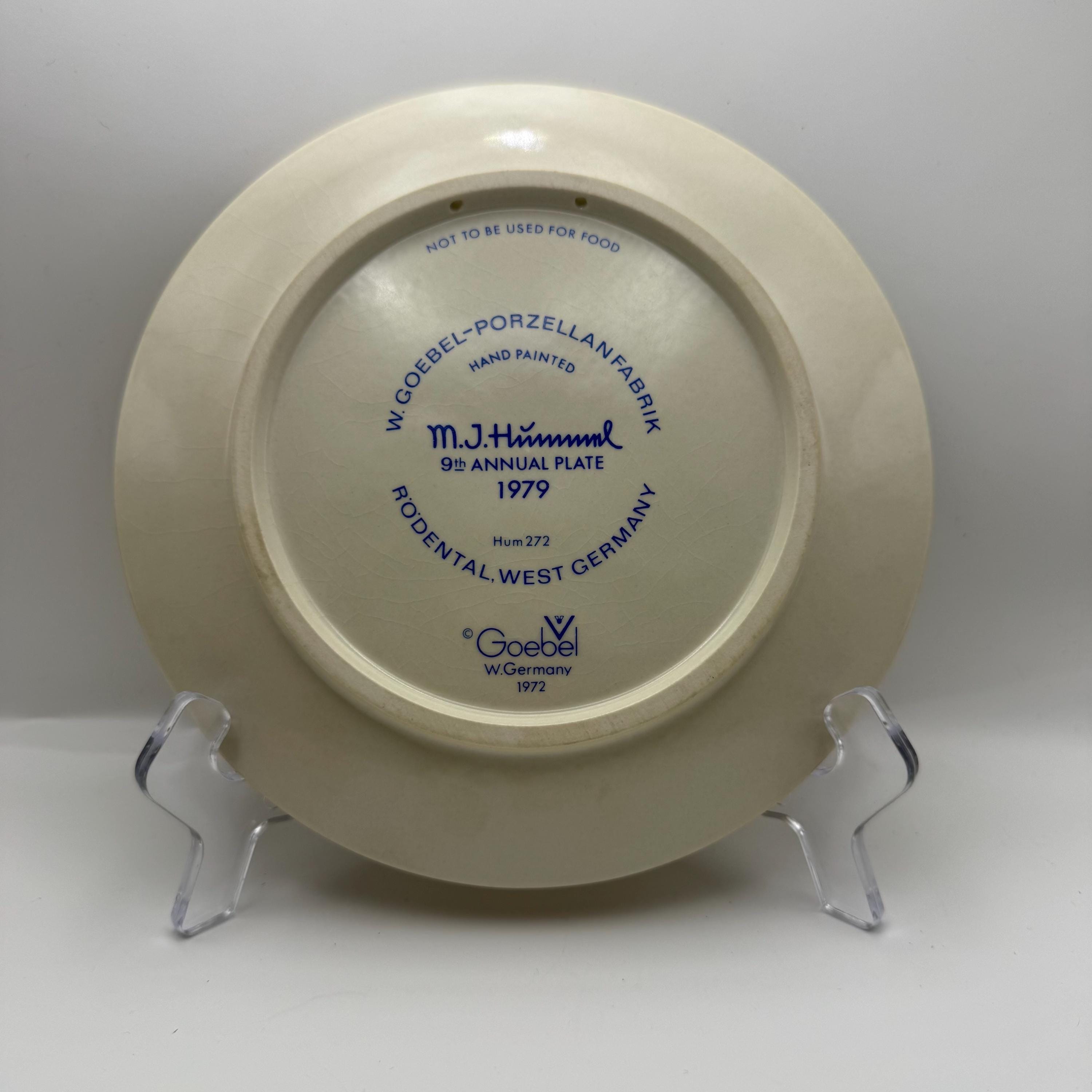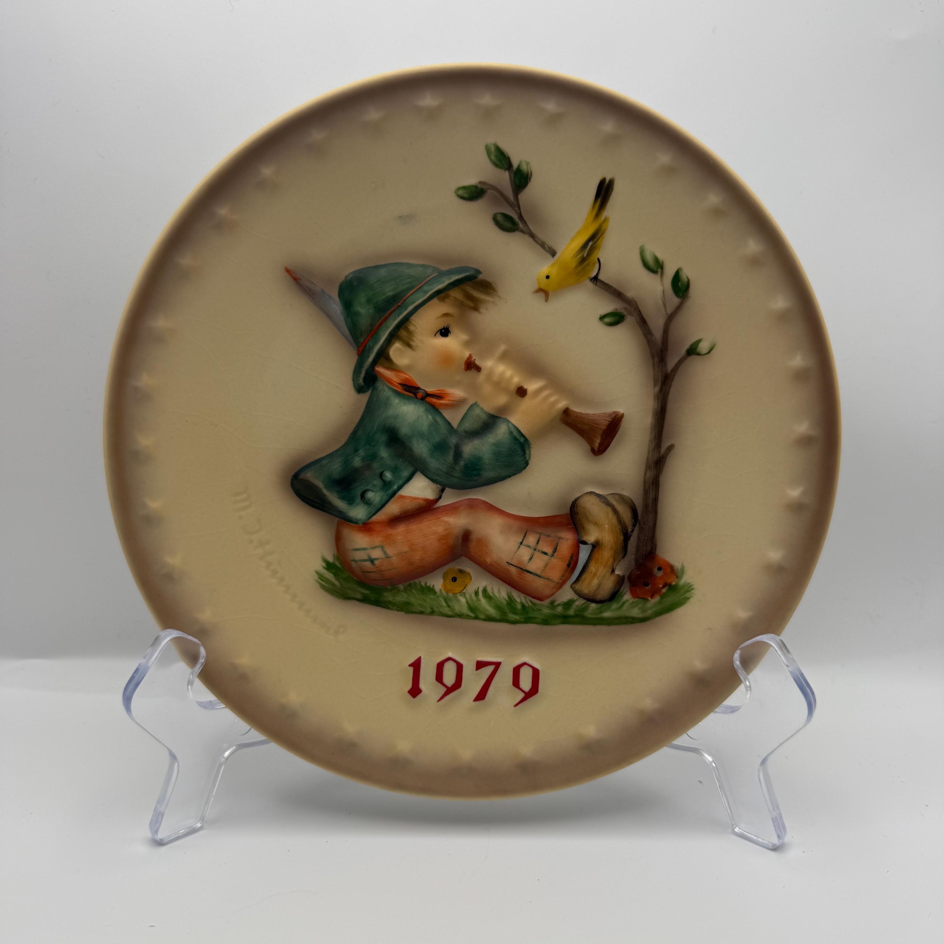 Bring classic charm to your collection with this 1979 Goebel Hummel 9th Annual Plate, featuring a sweet young boy playing a flute beneath a yellow bird. This raised-relief design is full of color, movement, and all the nostalgic details Hummel collectors love.