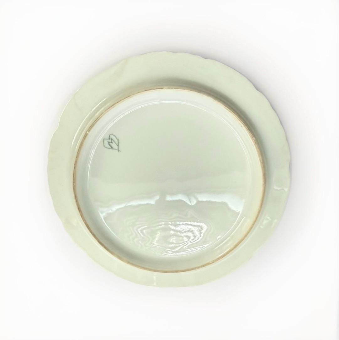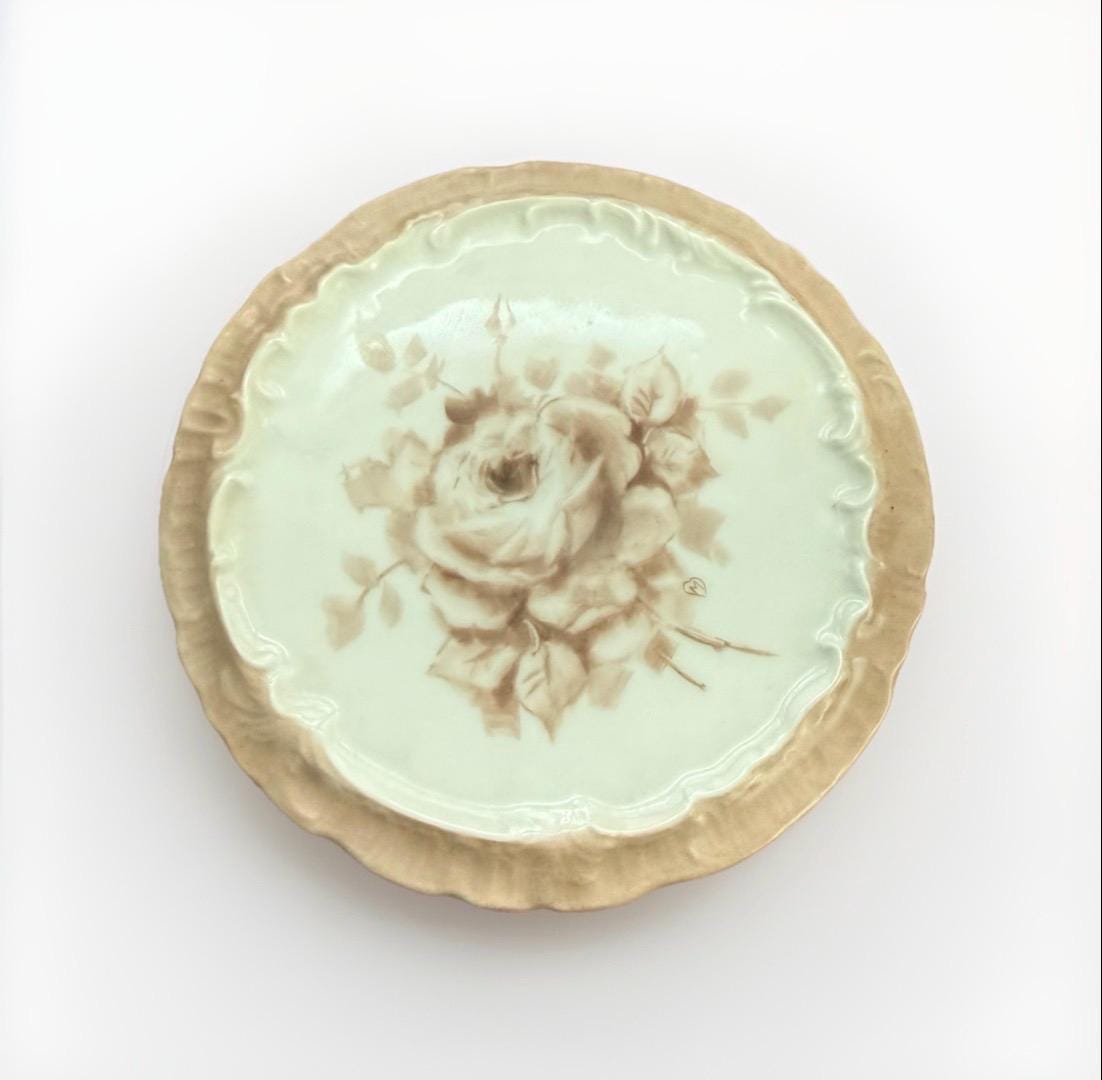 A lovely antique hand-painted porcelain plate featuring a soft sepia rose at the center and a scalloped blush-toned rim. This 6.5-inch plate is studio-decorated with artist initials on the back, a style commonly seen in early 1900s German or Austrian porcelain blanks. Beautiful for cottage décor, wall displays, or cabinet styling.