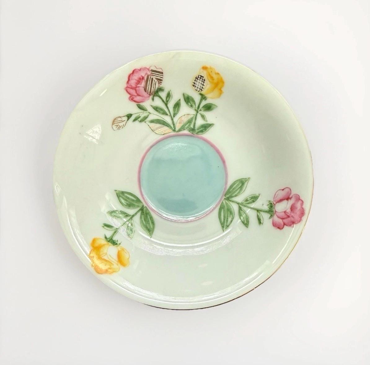 A charming vintage Mocco Made in Occupied Japan porcelain saucer featuring hand-painted floral accents in pink, yellow, and green with a soft aqua center. This 4.75-inch dish dates between 1945–1952, during the Occupied Japan production era, making it desirable for collectors.