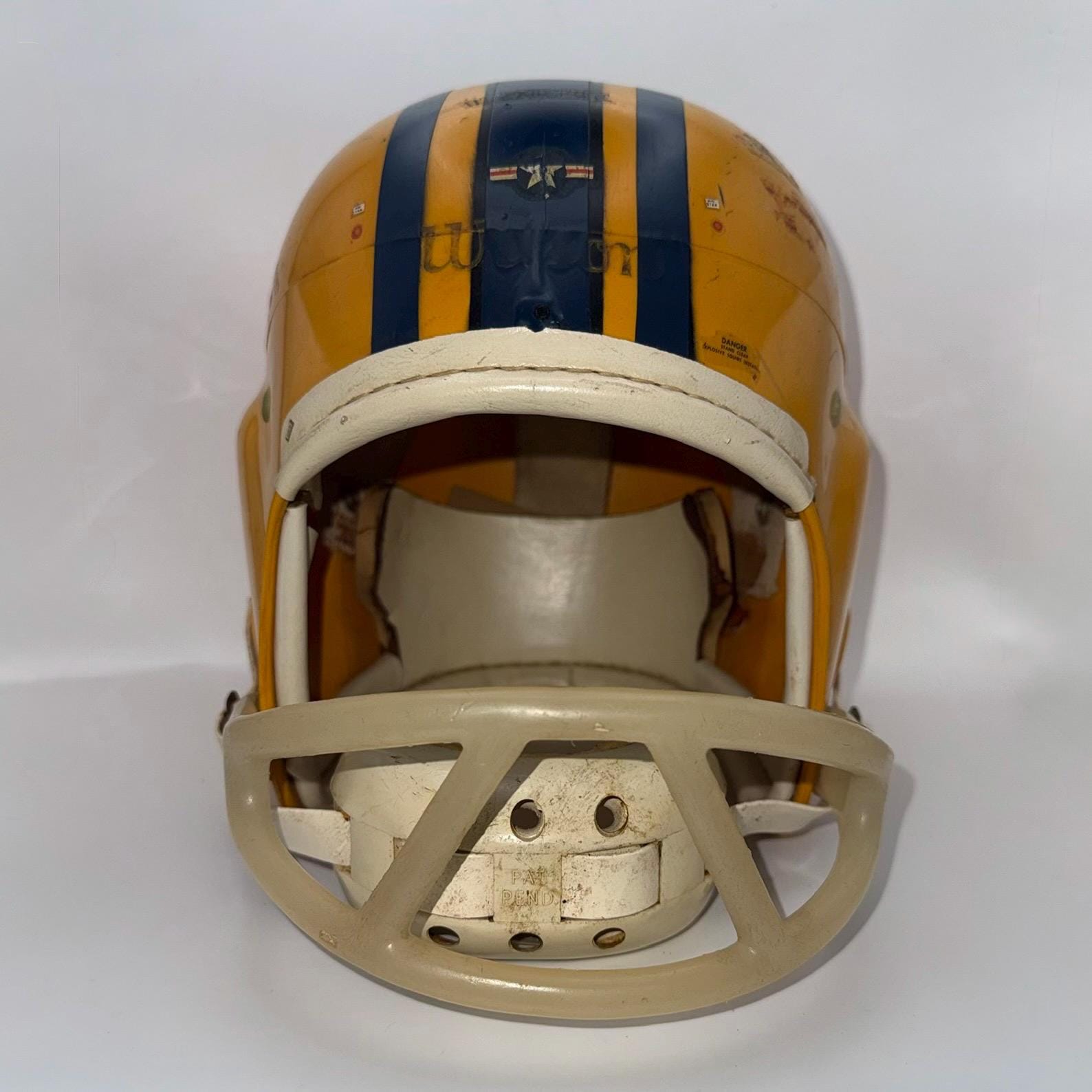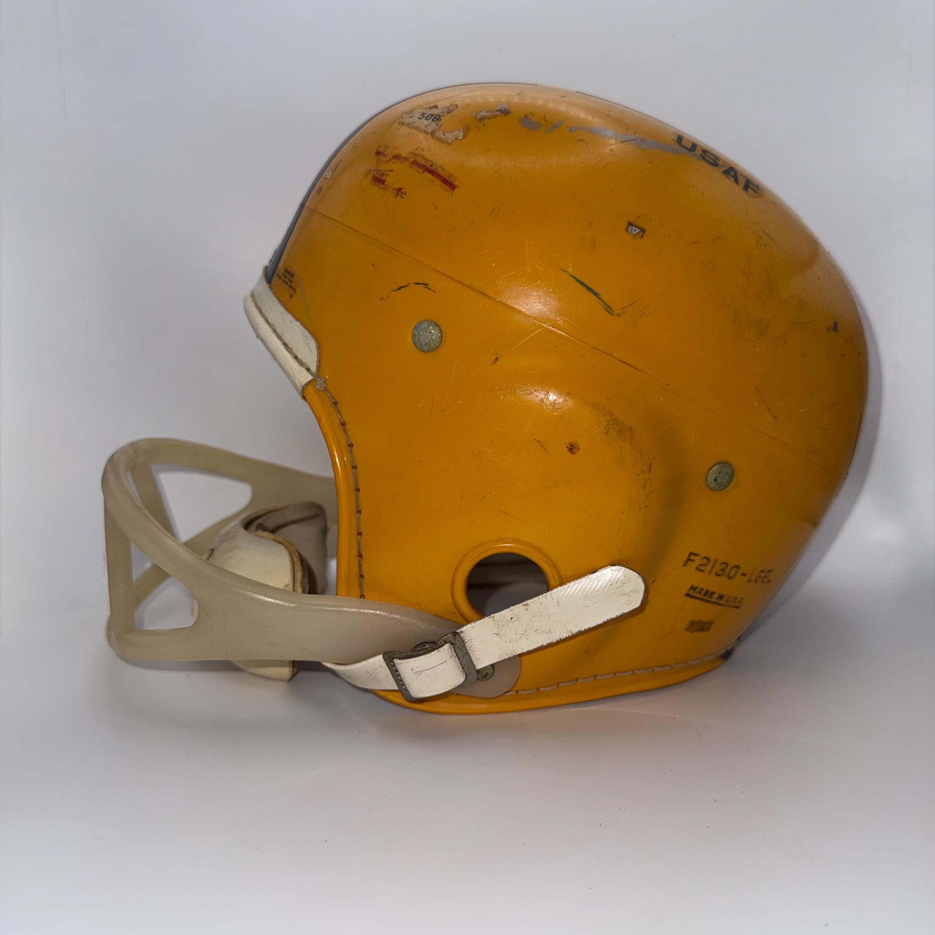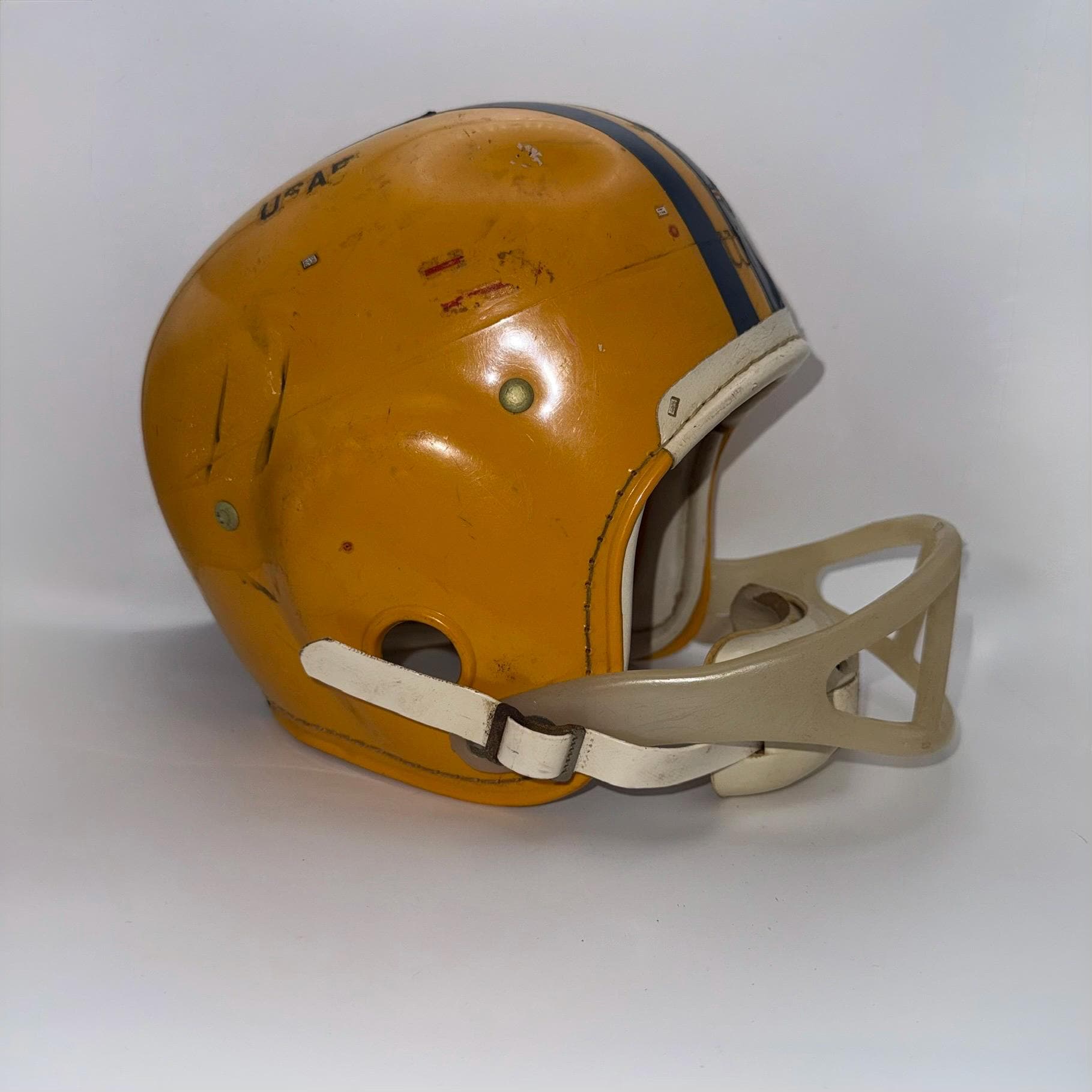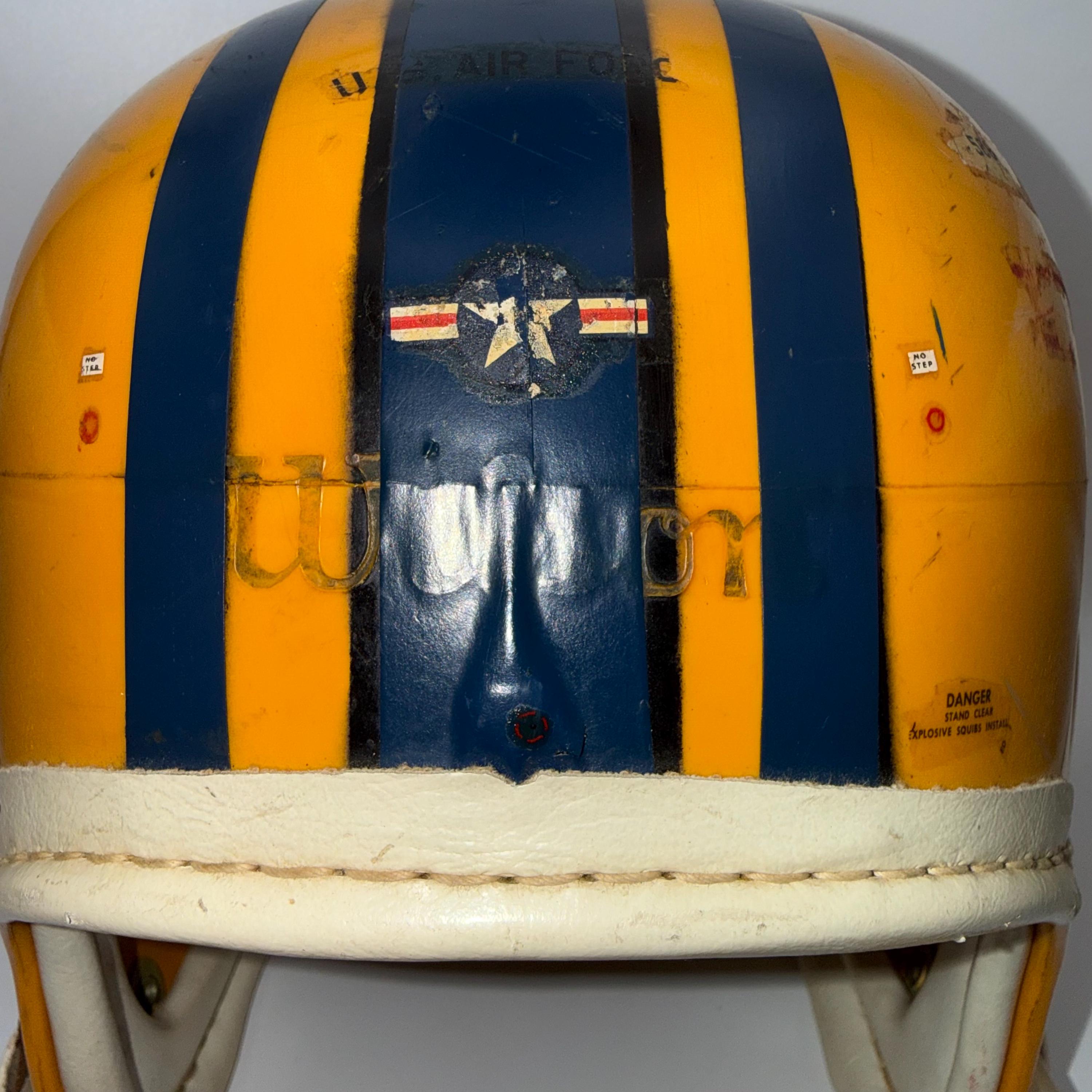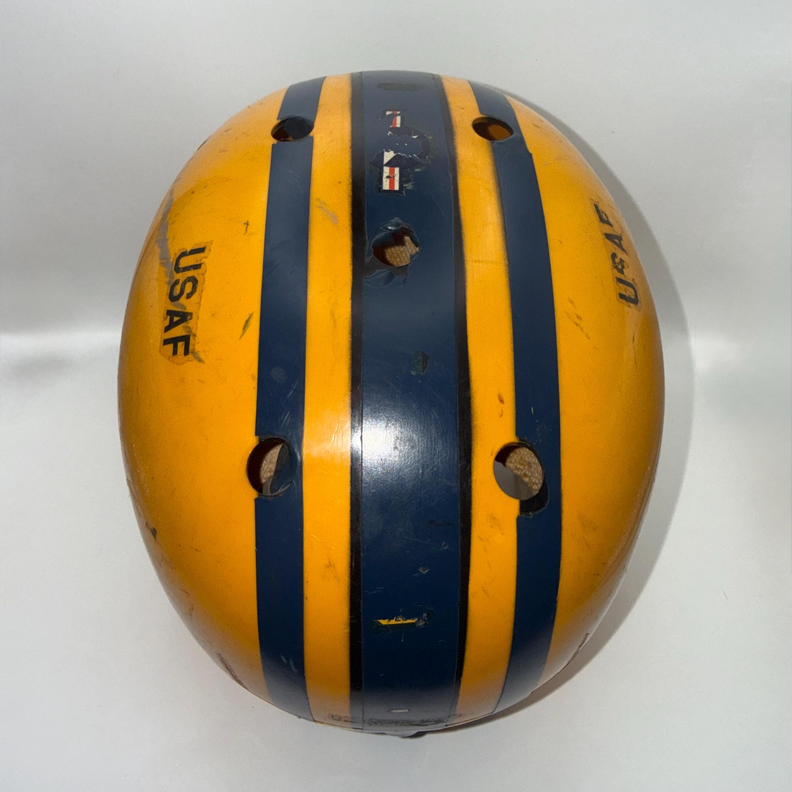 This vintage Wilson youth football helmet comes from the late 1960s to 1970s and features a bold blue-and-gold design with U.S. Air Force–inspired decals. These themed helmets were sold for youth football, backyard play, and sporting goods stores as patriotic team gear.