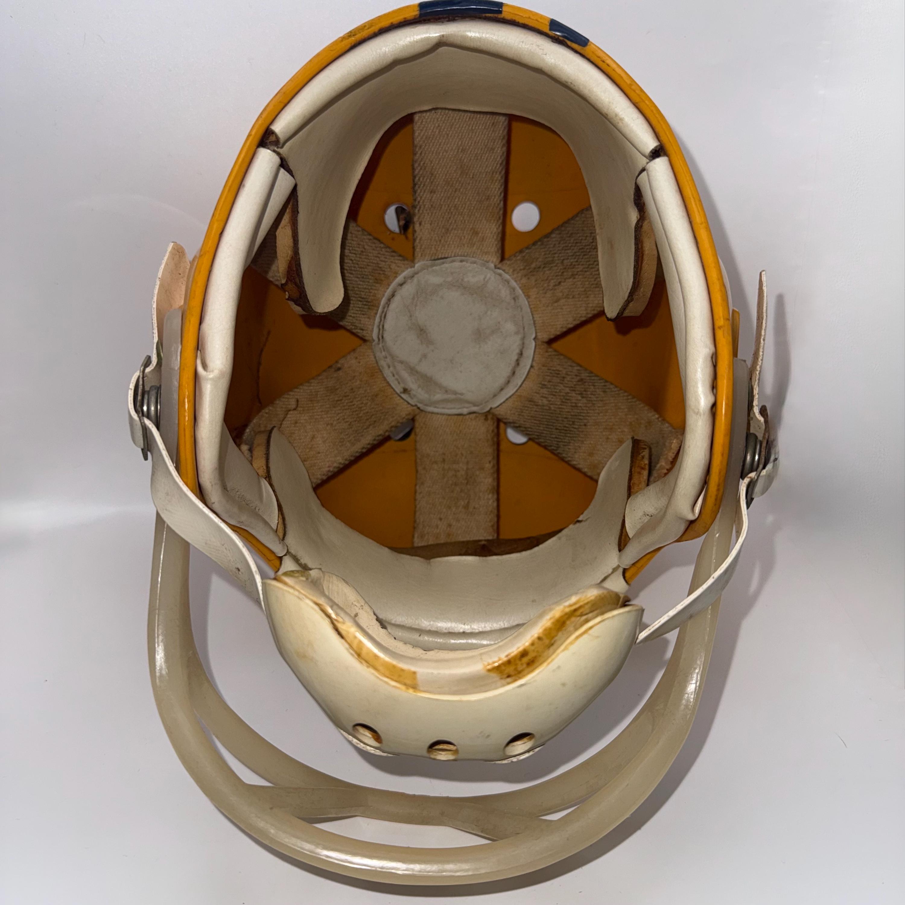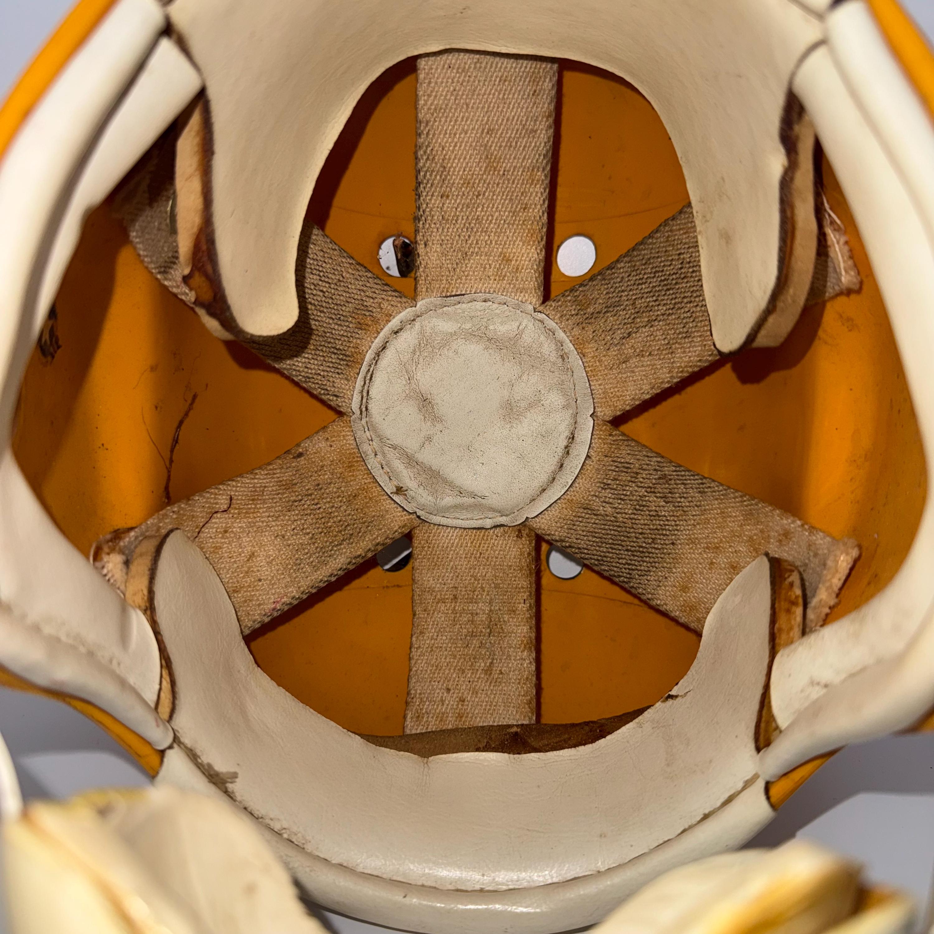 The helmet includes its original faceguard, leather-trimmed chin area, and early suspension interior. Fantastic patina and a classic vintage sports aesthetic make it ideal for display.