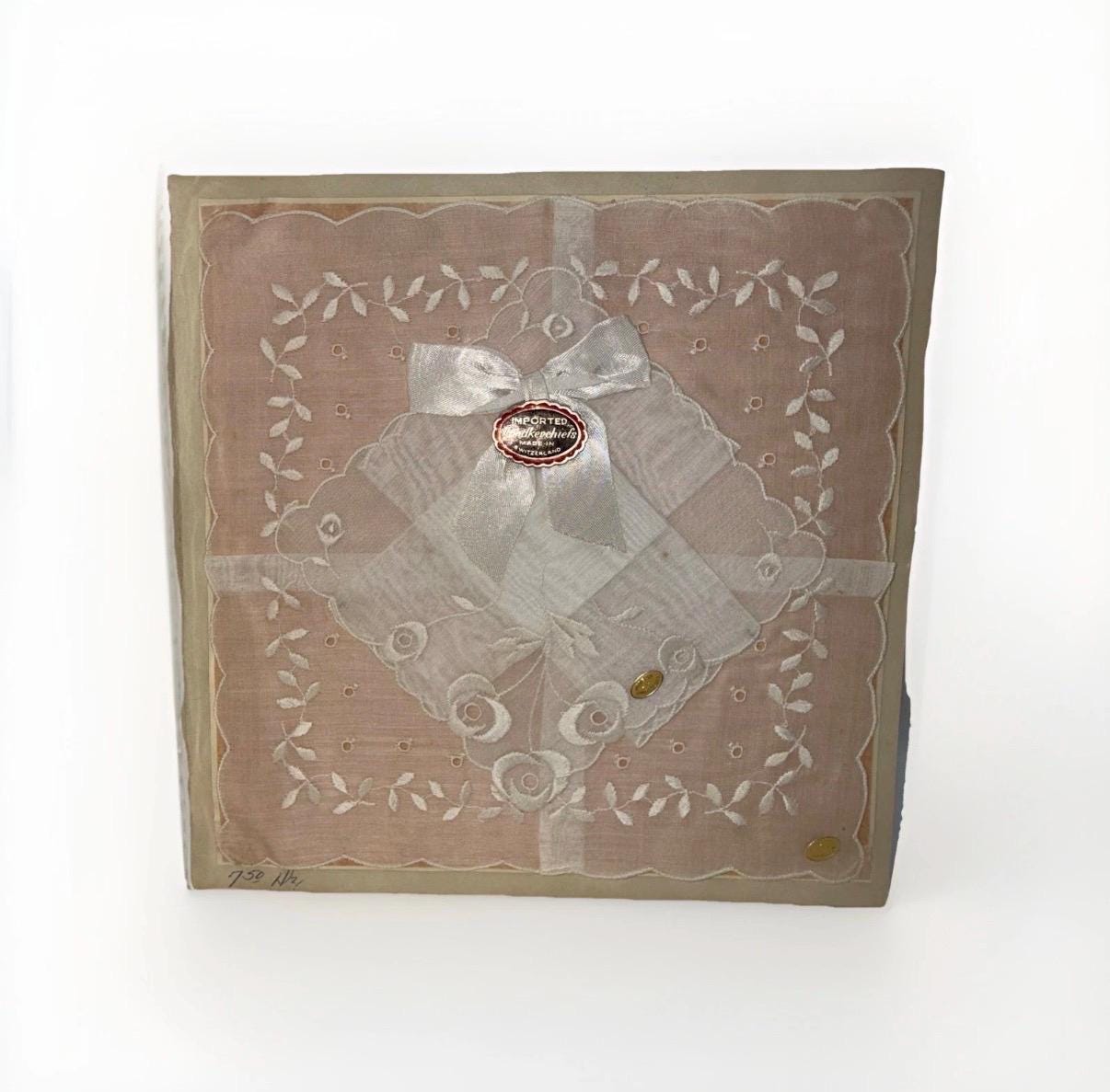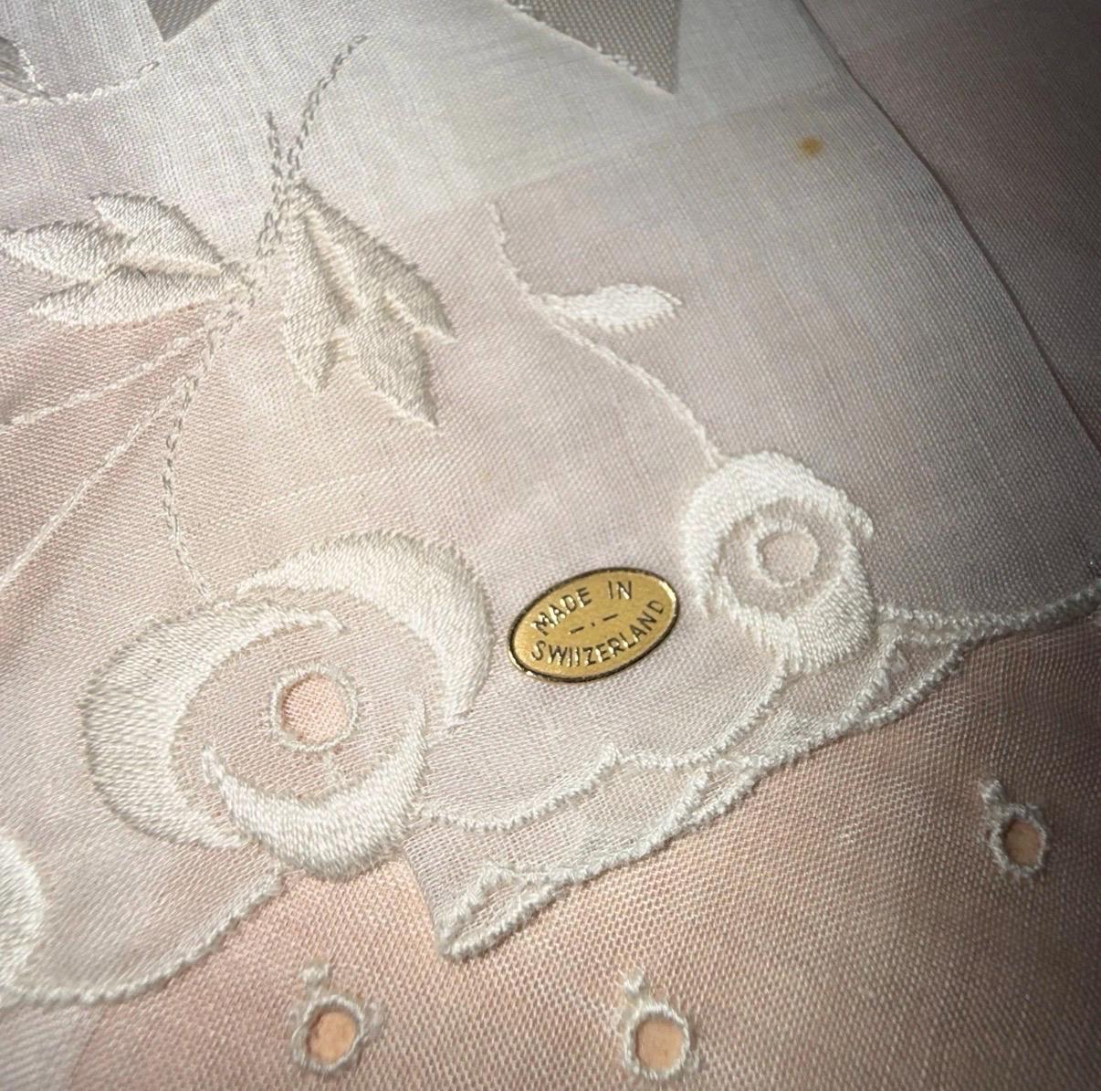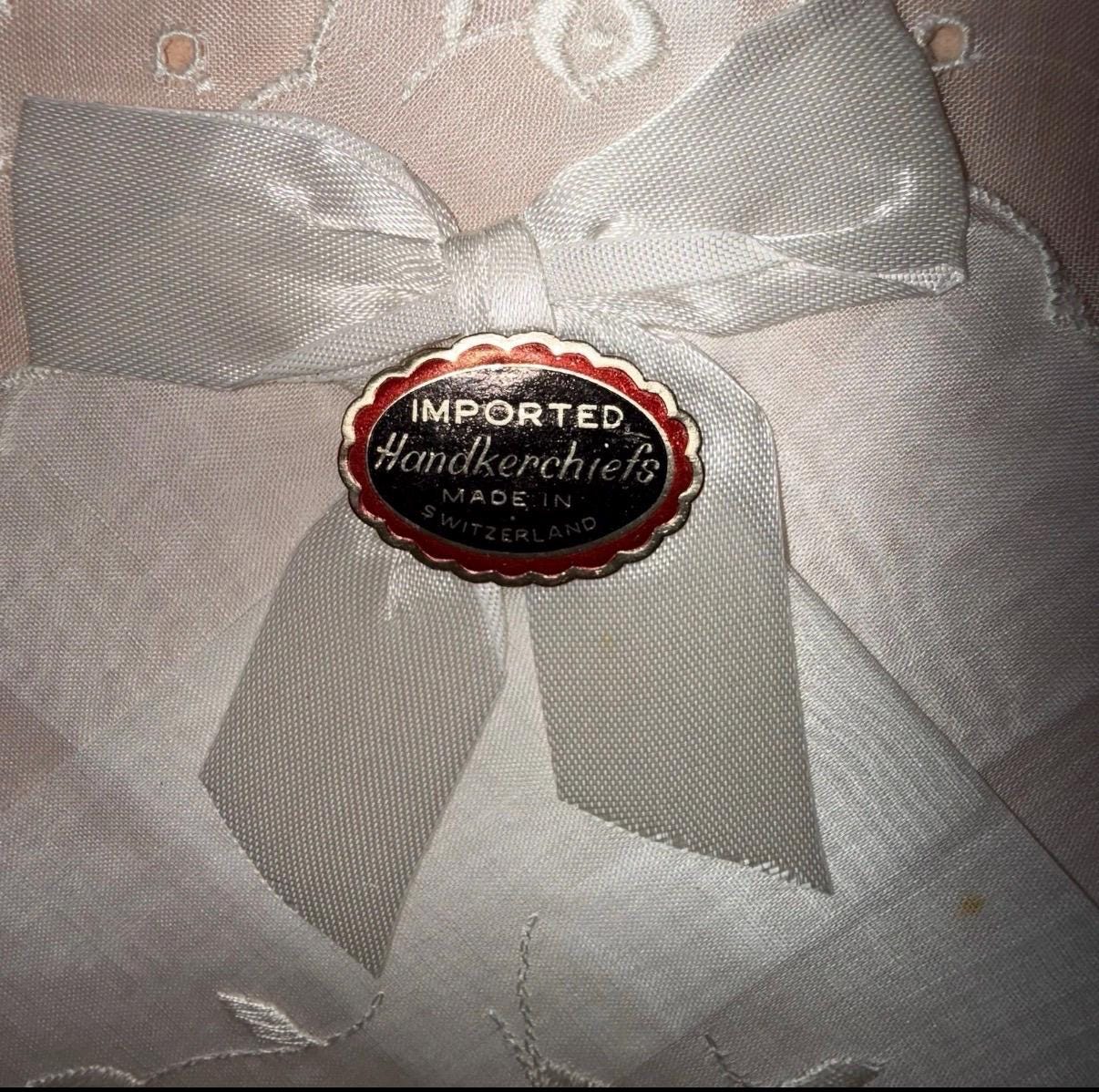 A beautifully preserved vintage Swiss ladies handkerchief set, complete with the original boxed presentation. The delicate embroidery, scalloped edges, and sheer white linen/cotton handkerchiefs showcase the quality of Swiss craftsmanship.