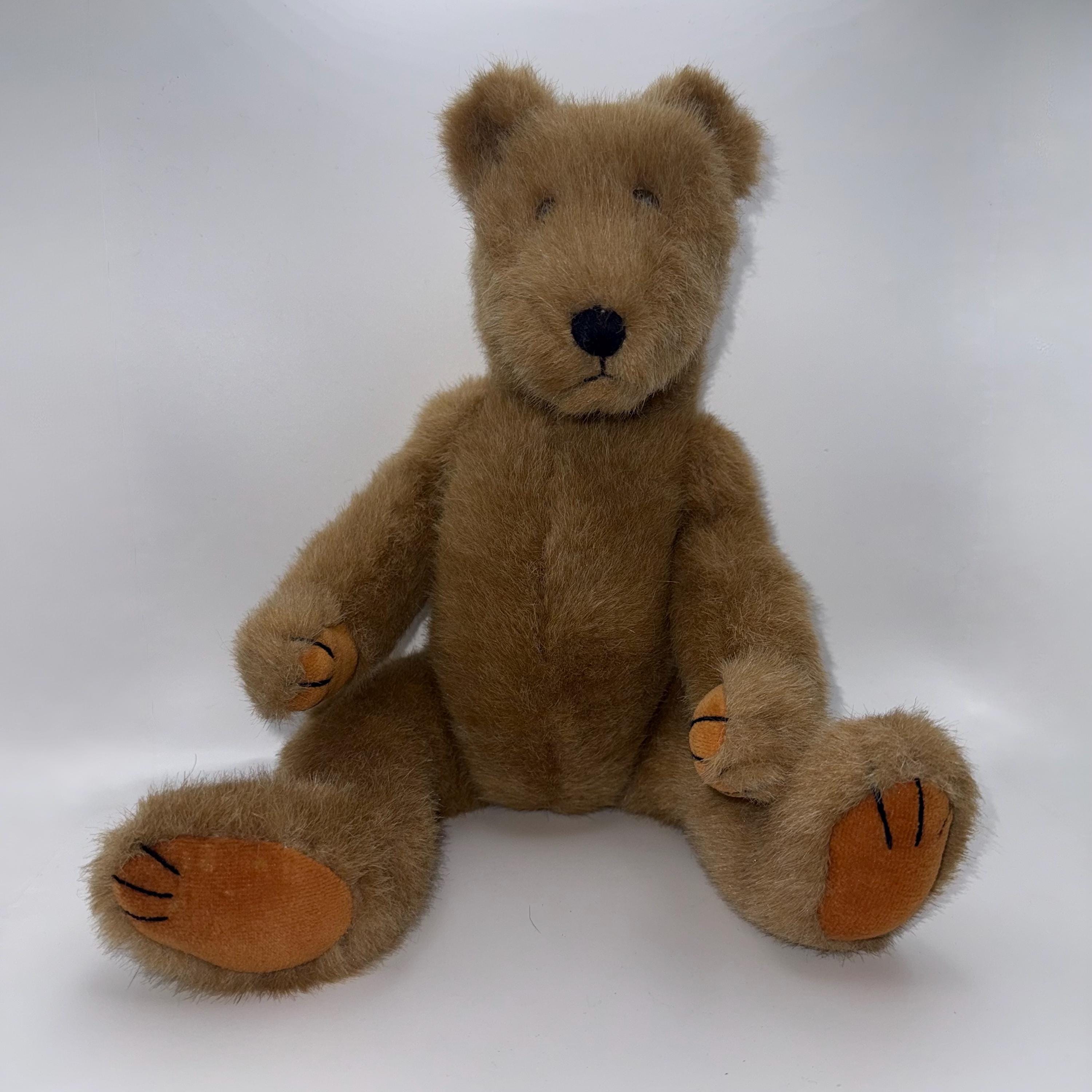This charming vintage Boyds Archive Series teddy bear dates to the early–mid 1980s and stands 16 inches tall. Made by The Boyds Collection Ltd. of Gettysburg, Pennsylvania, this bear features the classic early Boyds design: a long muzzle, stitched nose, felt paw pads, and soft brown plush that mimics antique mohair.