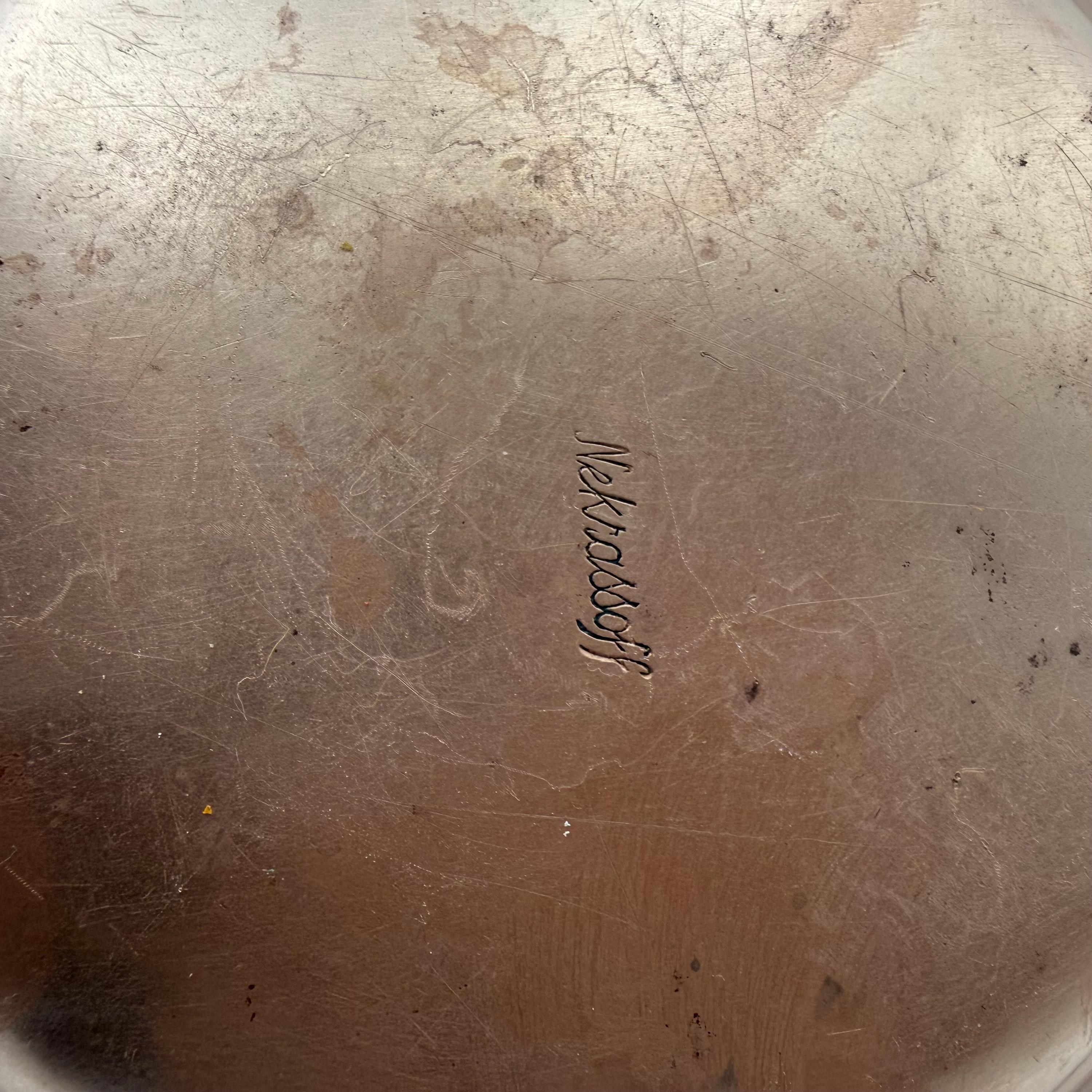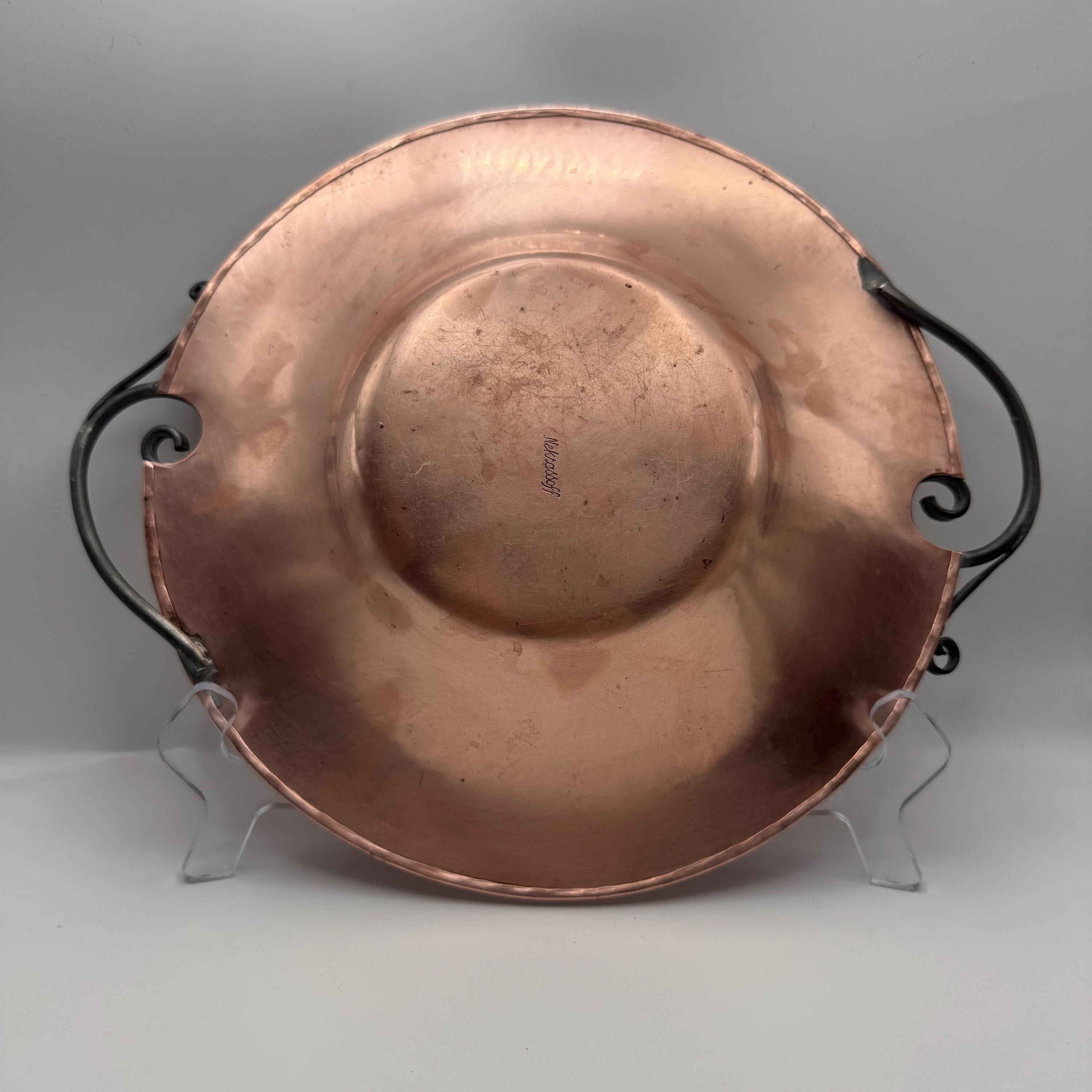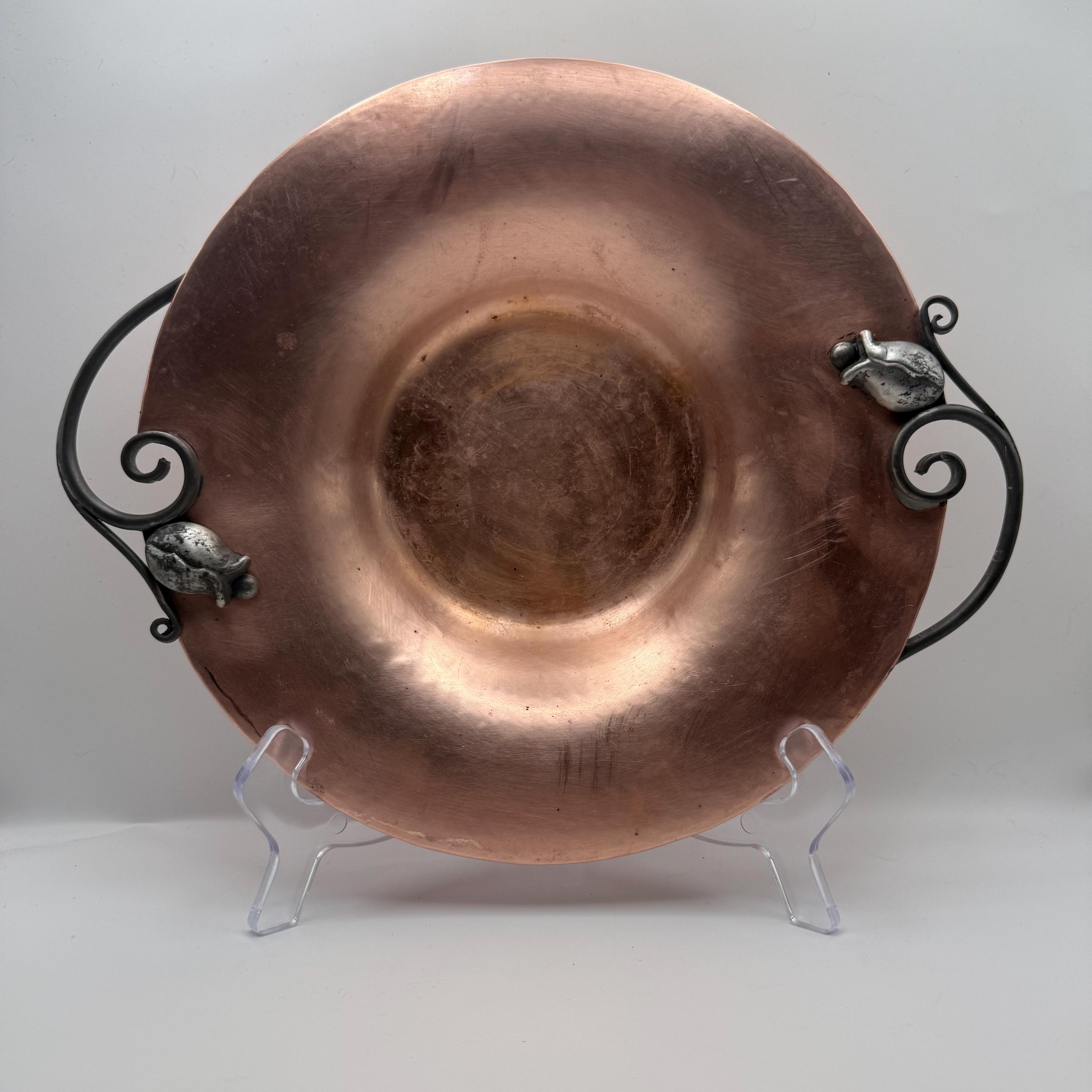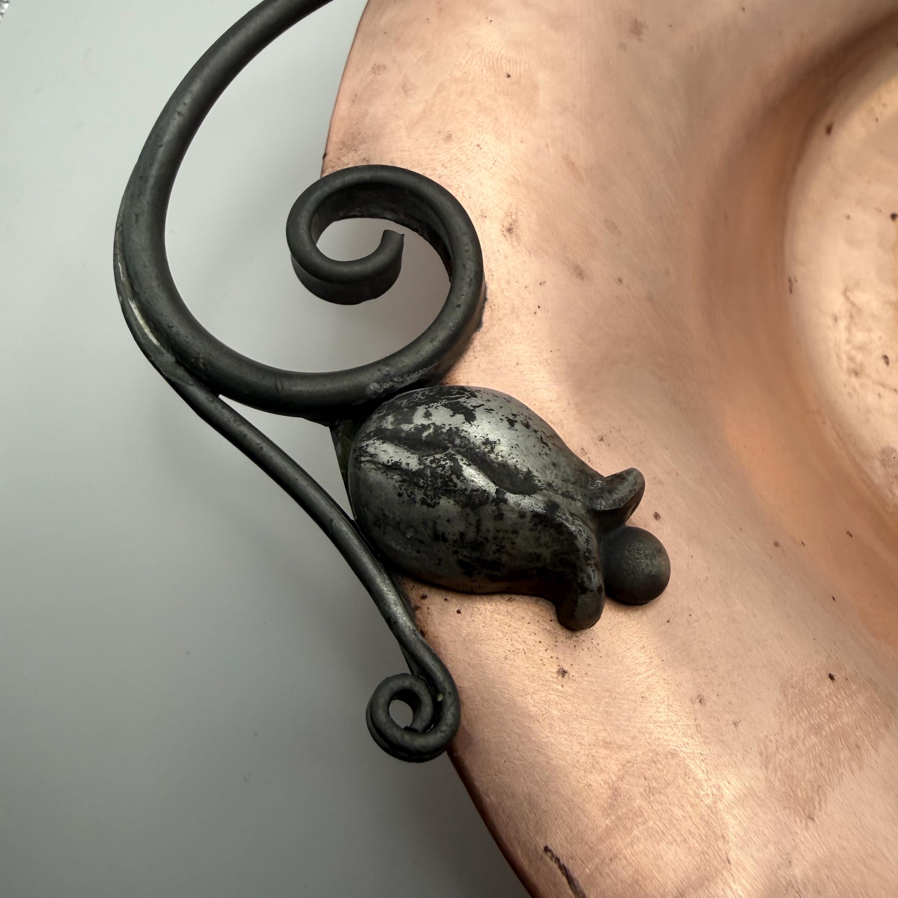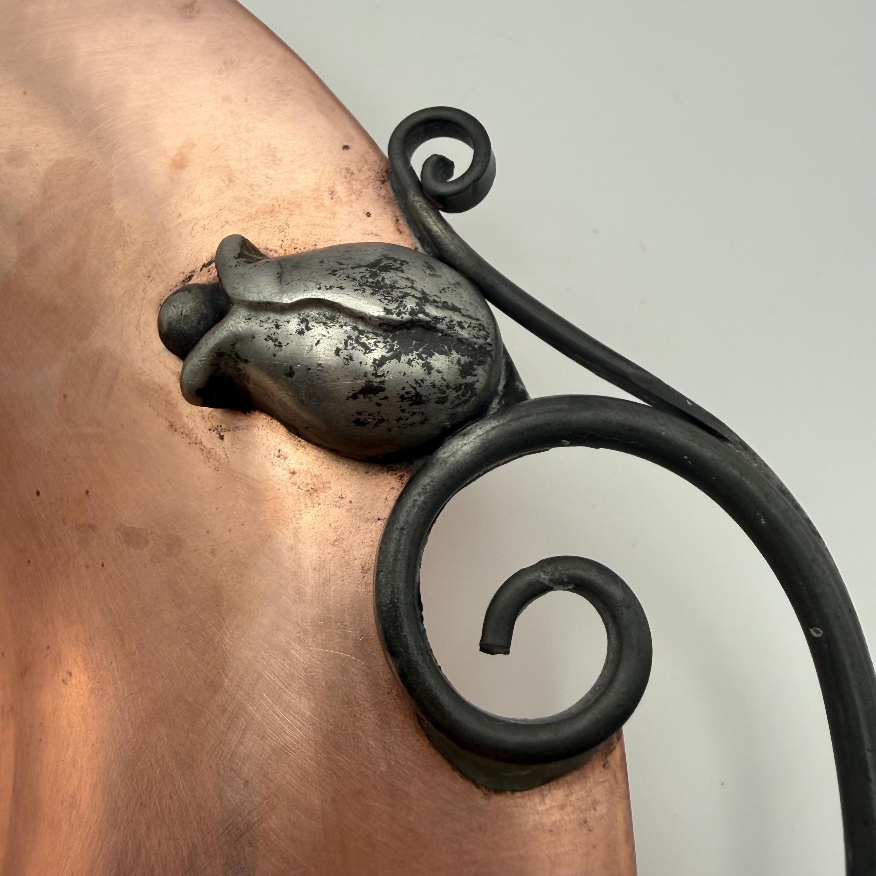 This stunning hand-wrought copper bowl was made by Nekrassoff, a well-known American studio metalsmith active during the 1930s–1950s. The piece features warm hammered copper paired with forged iron scroll handles and two applied sculptural bud/fruit forms—classic elements of Nekrassoff workshop design.