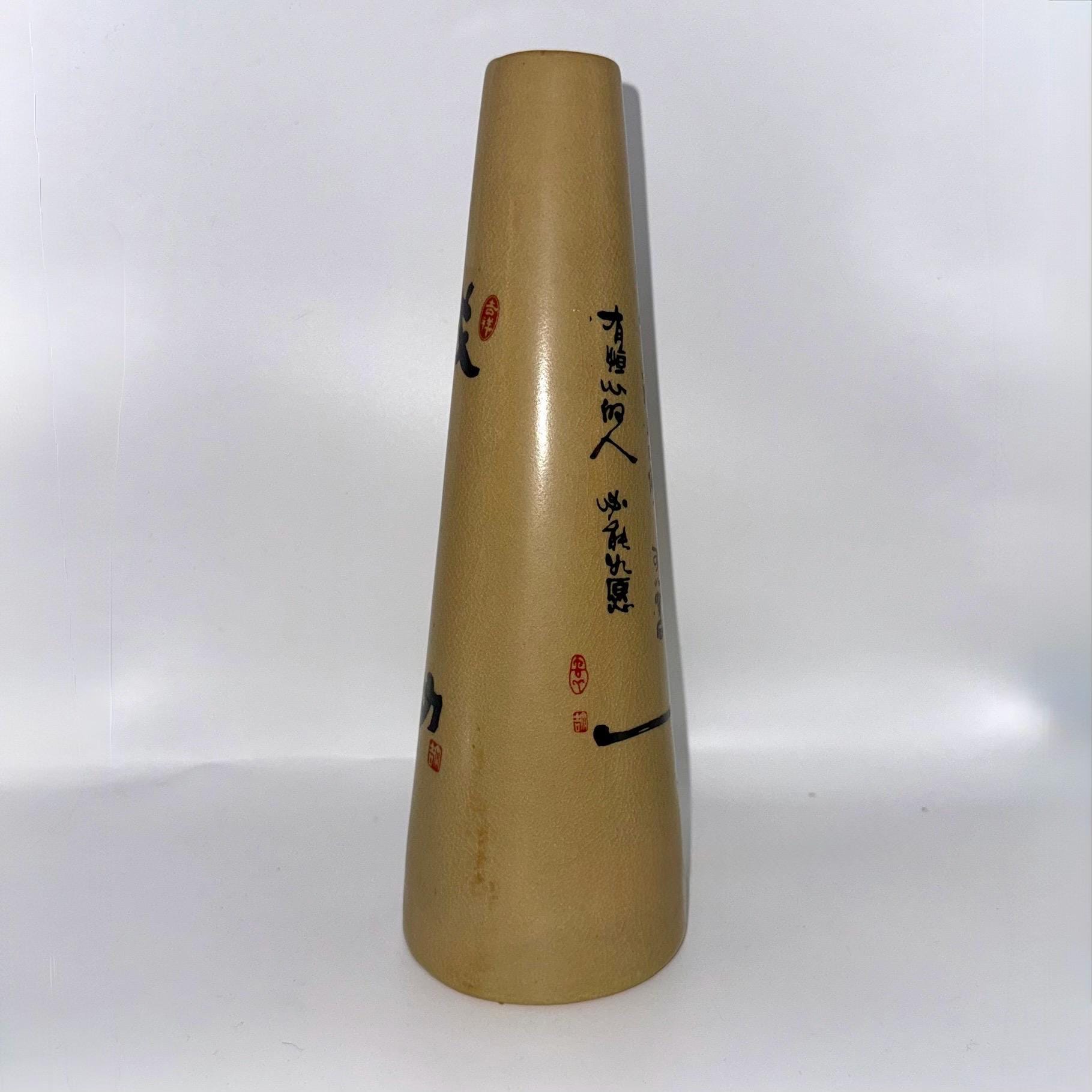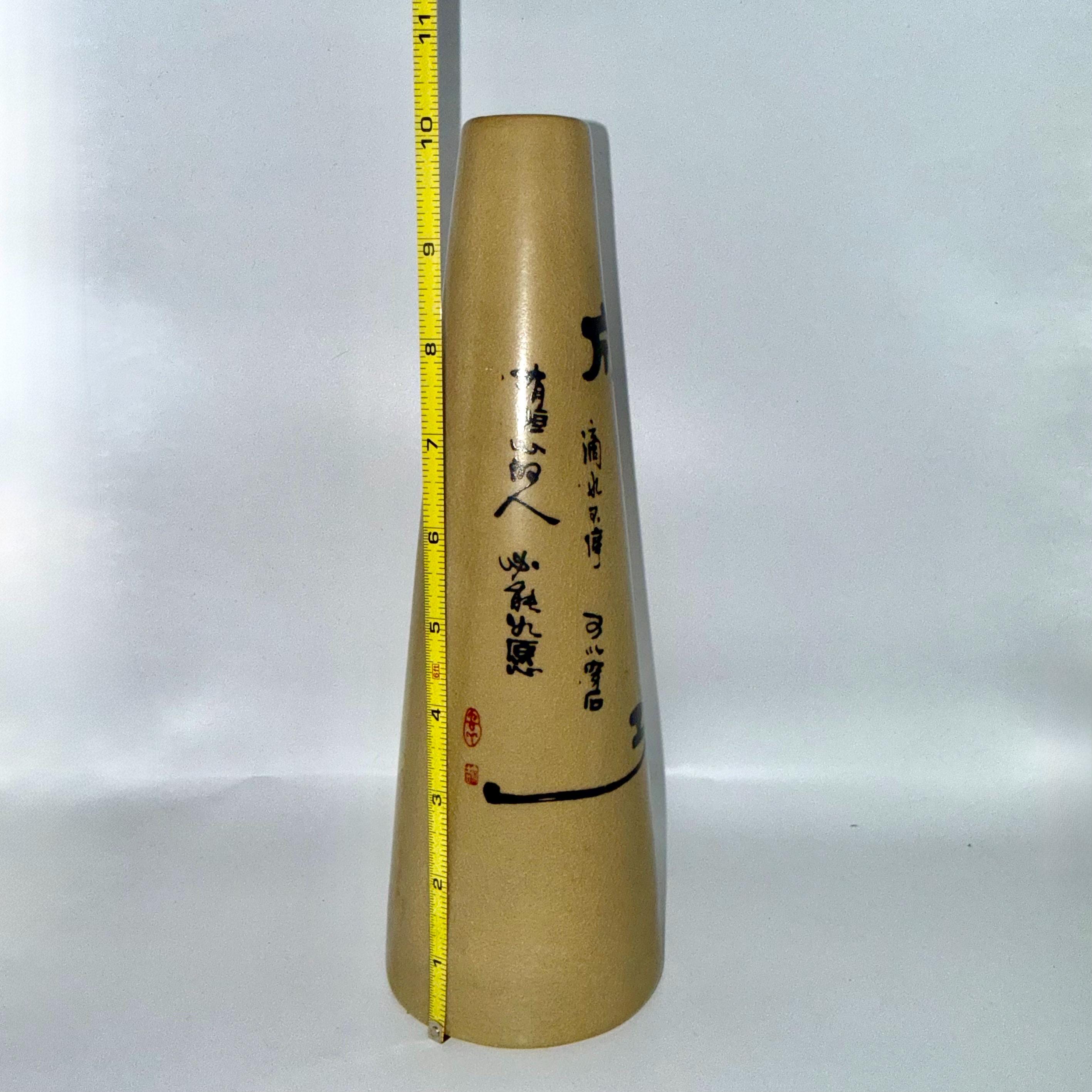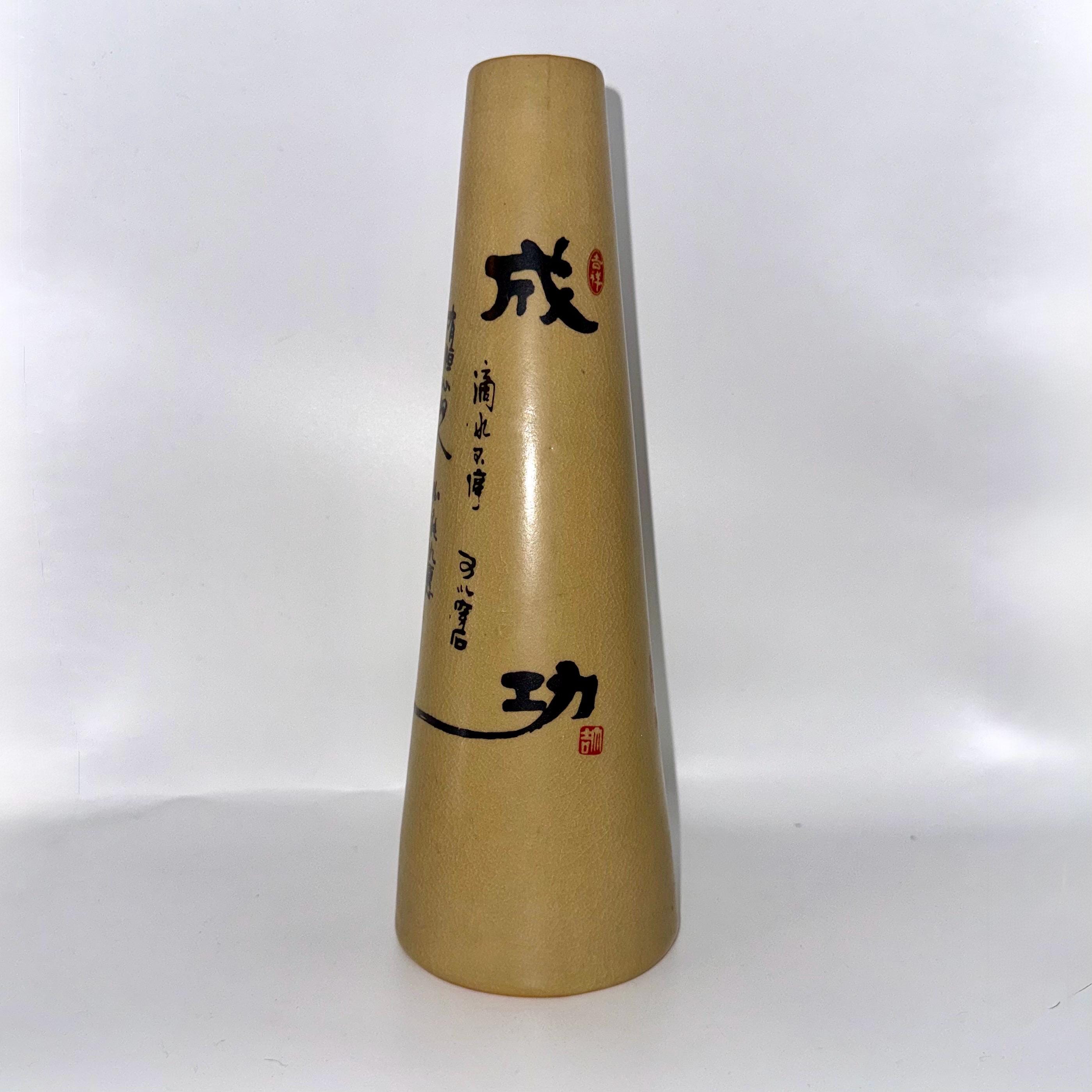 A vintage Chinese ceramic bottle featuring the calligraphy symbol 成功 (“Success”) and decorative proverb writing. This tall cone-shaped stoneware bottle was originally used for baijiu or rice wine and now makes a beautiful décor accent for shelves, minimalist styling, or Asian-inspired interiors.