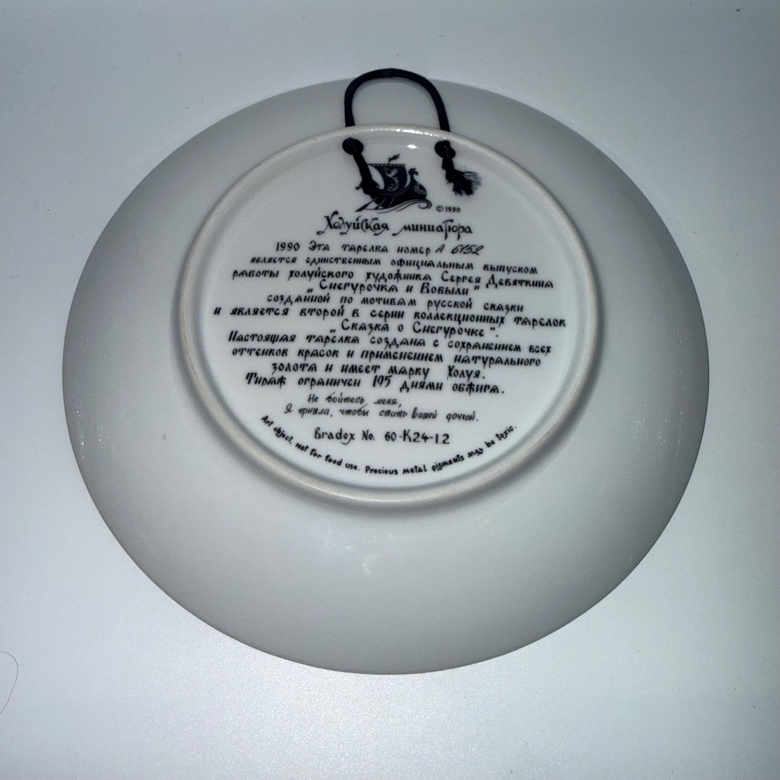 “1990. Plate number 1852 B is the only official release of Sergey Detsyn’s work ‘The Snow Maiden and Lel,’ inspired by Russian fairy-tale motifs. Second plate in the ‘Tales of the Snow Maiden’ series. Made with preserved original colors and natural gold. Limited to 105 firing days. Bradex 60-K22-1.2.”