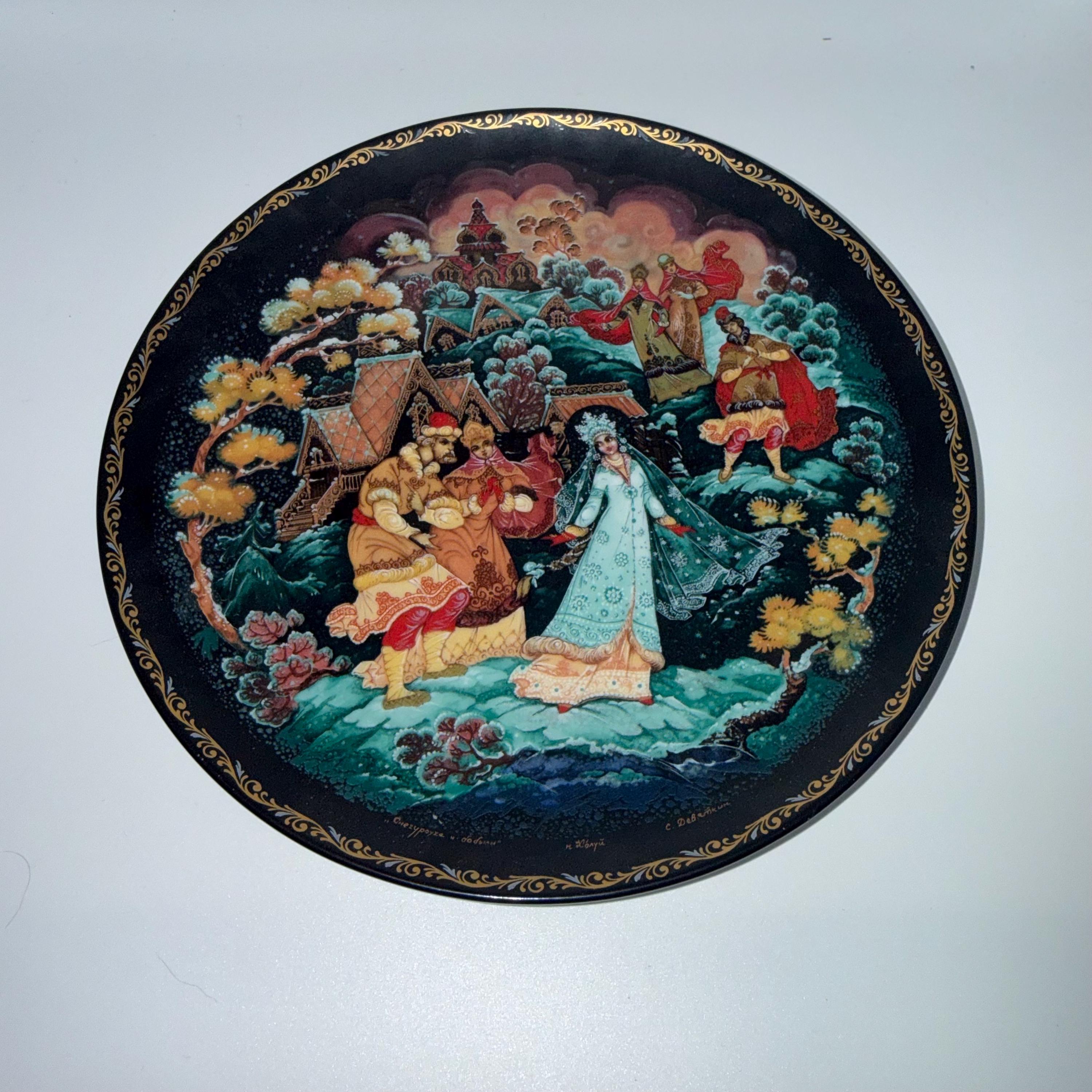 Vintage 1990 Palekh miniature porcelain collector plate titled “The Snow Maiden and Lel,” created by Sergey Detsyn. This is the second plate in the “Tales of the Snow Maiden” limited-edition series. Features detailed Palekh miniature artwork with natural gold accents on a black background. Measures 7.75 inches.