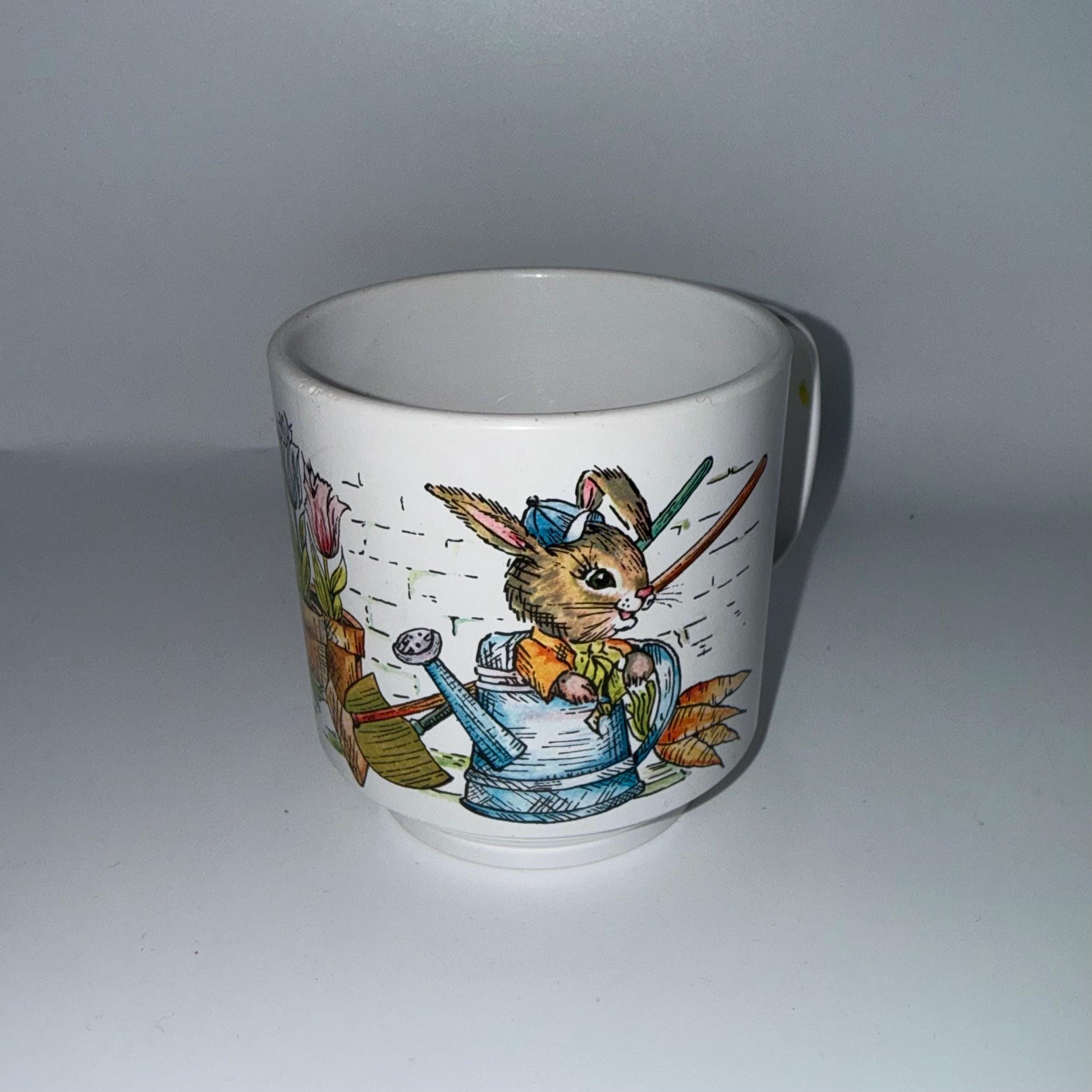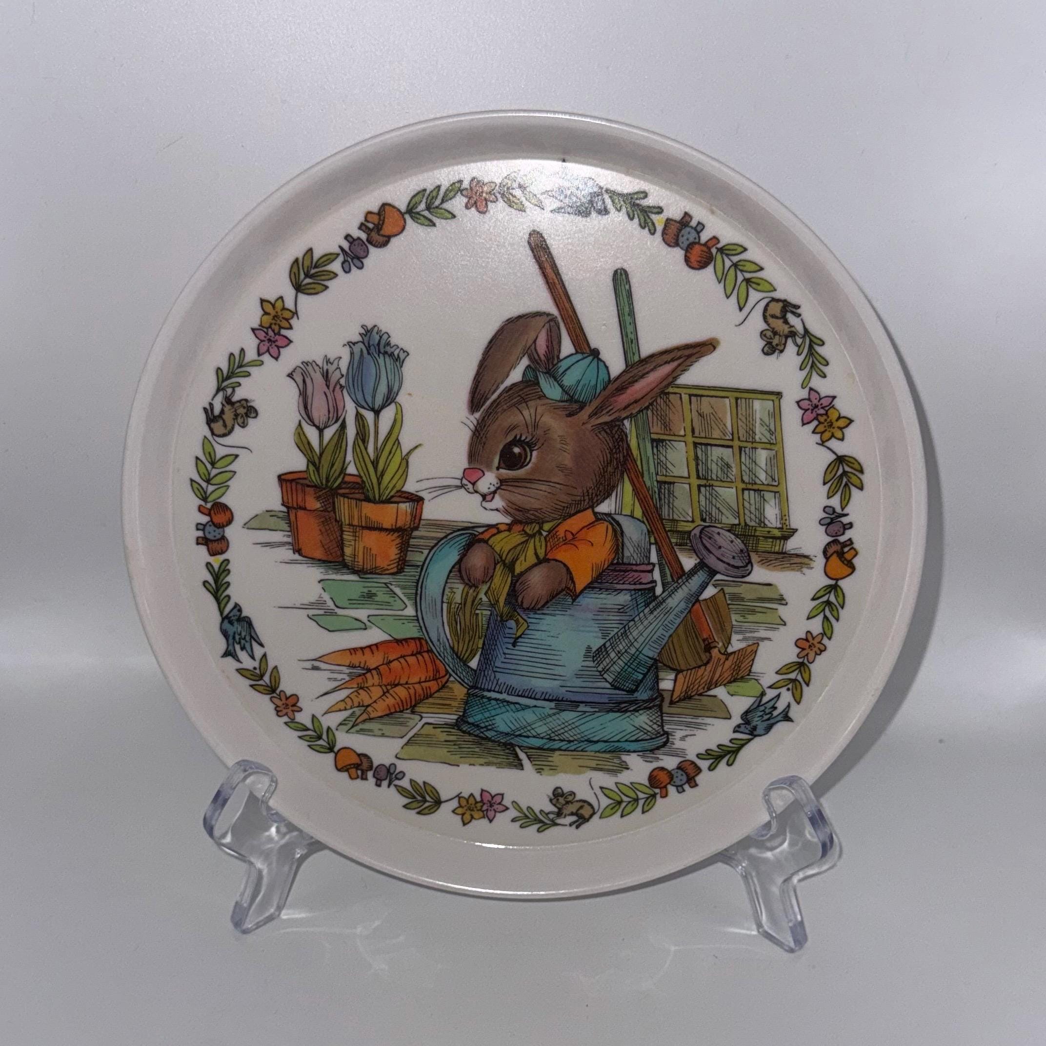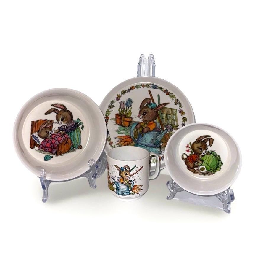 Vintage 1980s Oneida Deluxe Peter Rabbit melamine child’s dish set featuring four coordinated pieces: a plate, cereal bowl, small bowl, and mug. Each piece displays colorful, storybook-style rabbit illustrations from Oneida’s Deluxe melamine children’s line, produced approximately 1982–1986.