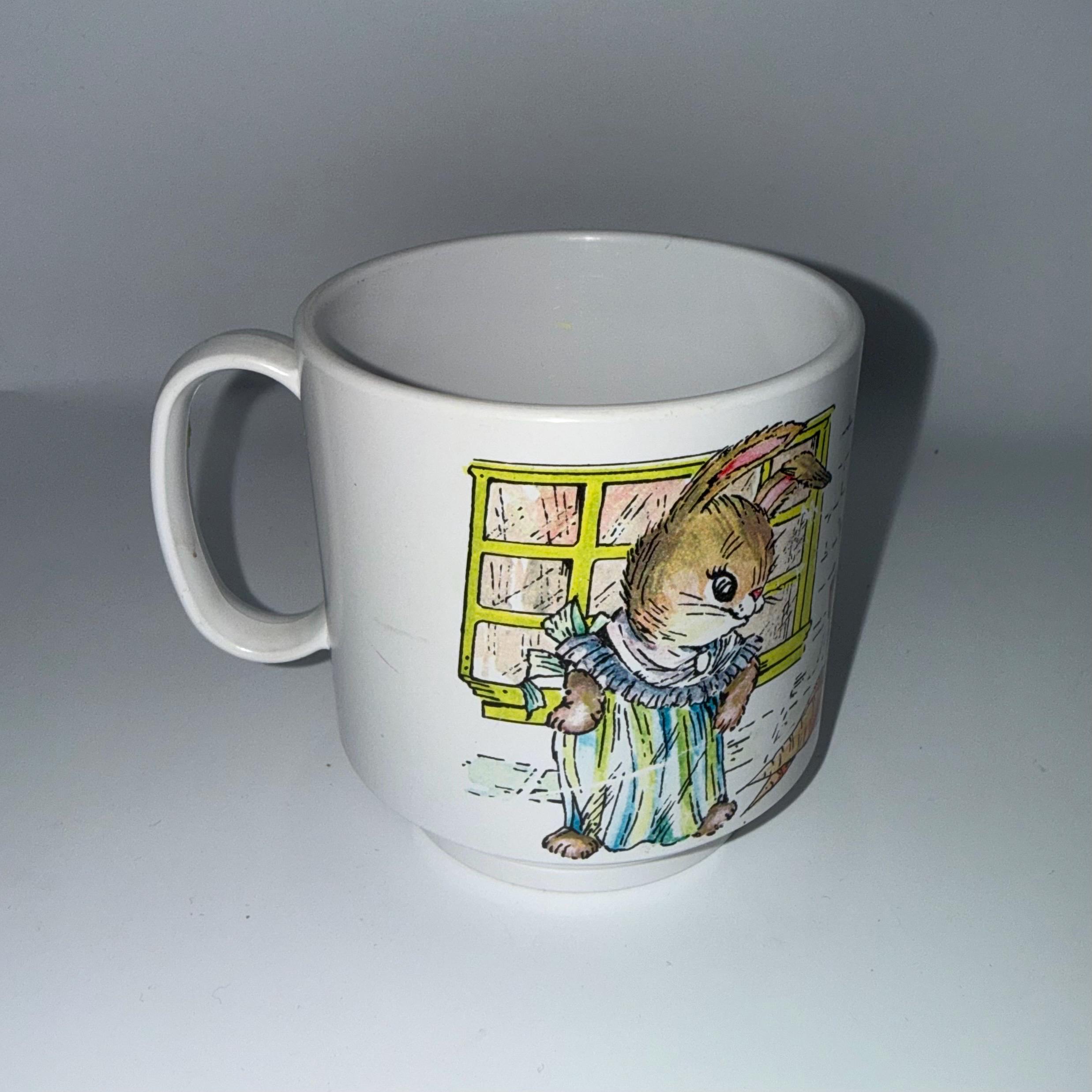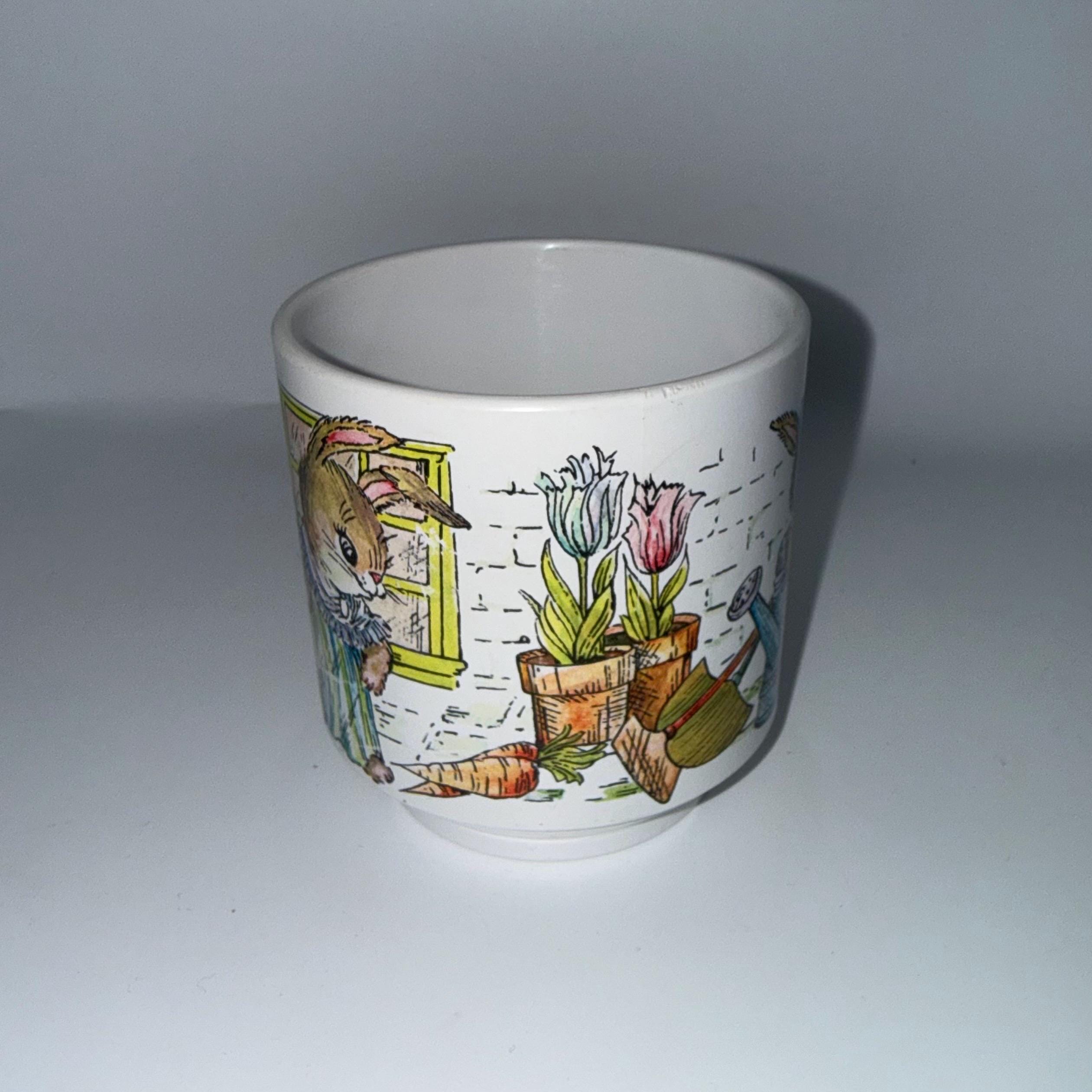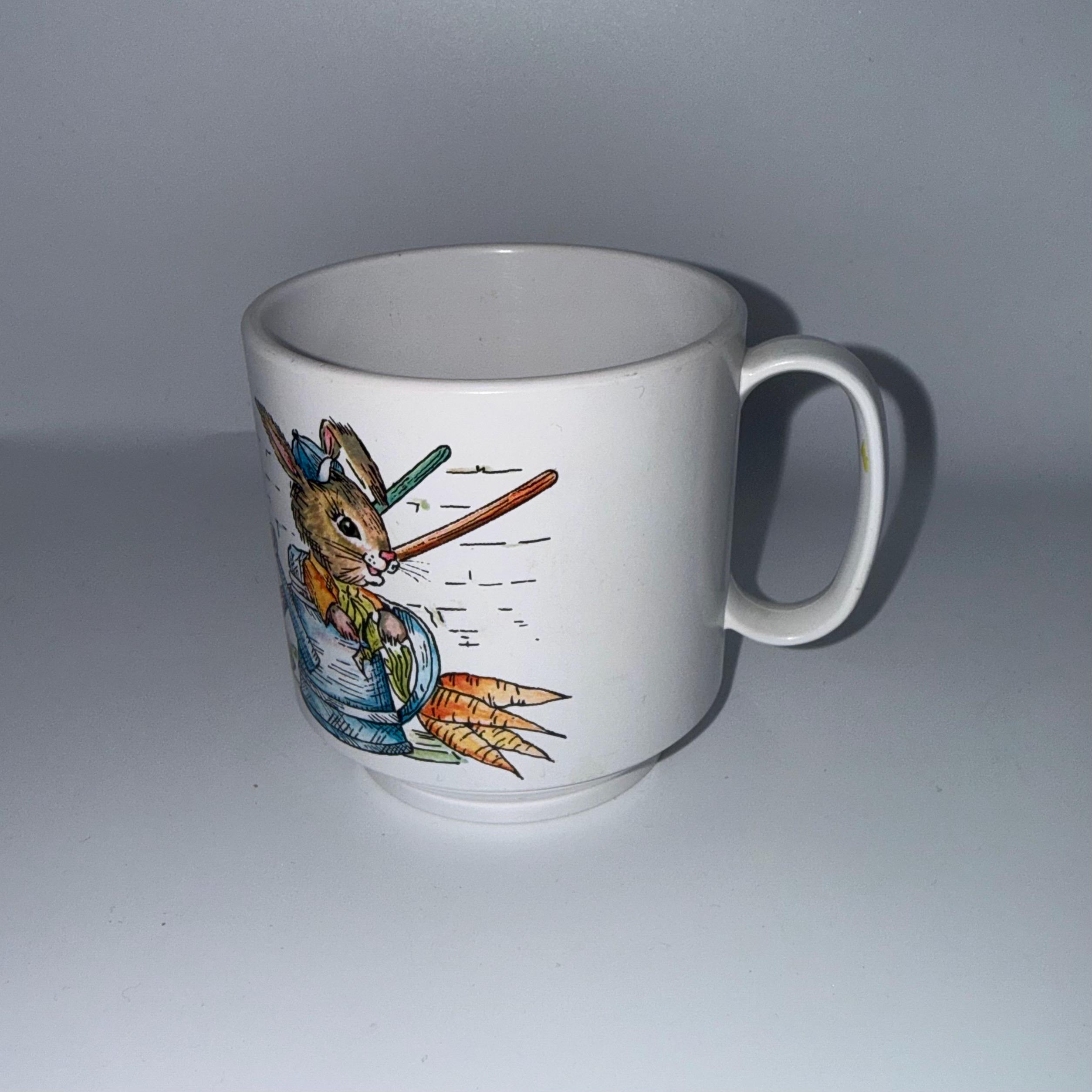 Vintage 1980s Oneida Deluxe Peter Rabbit melamine child’s dish set featuring four coordinated pieces: a plate, cereal bowl, small bowl, and mug. Each piece displays colorful, storybook-style rabbit illustrations from Oneida’s Deluxe melamine children’s line, produced approximately 1982–1986.
