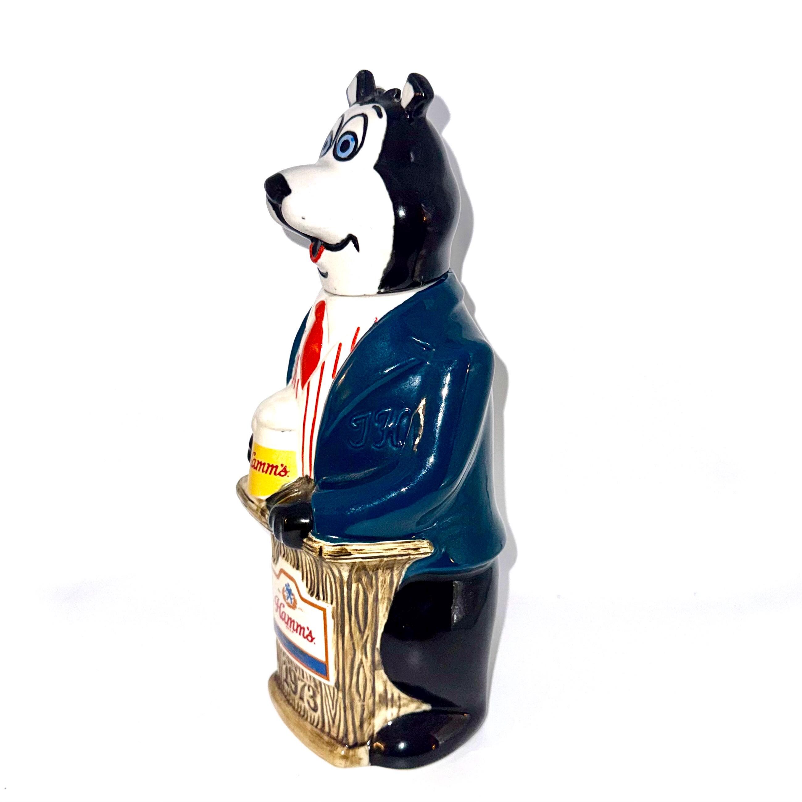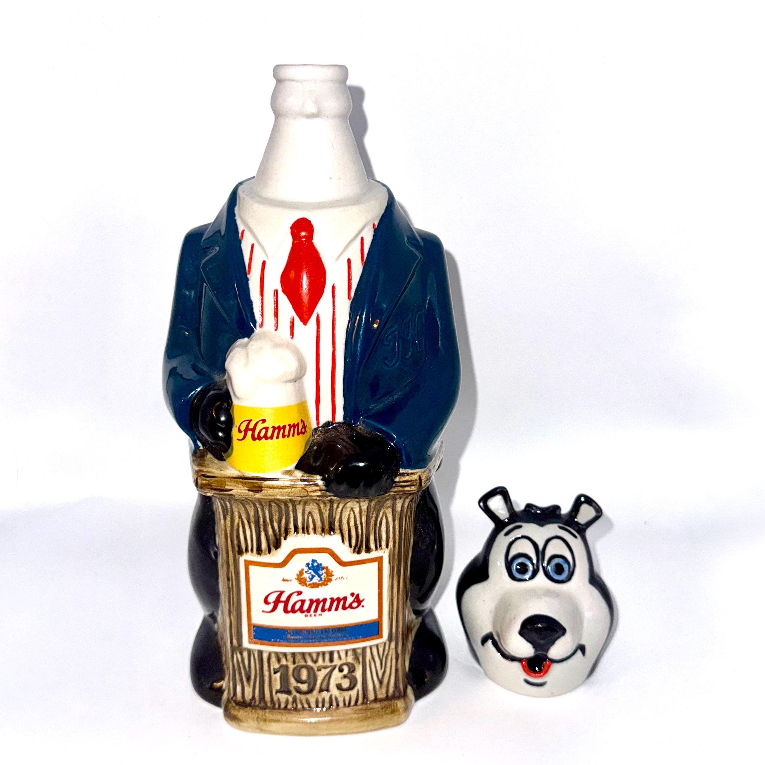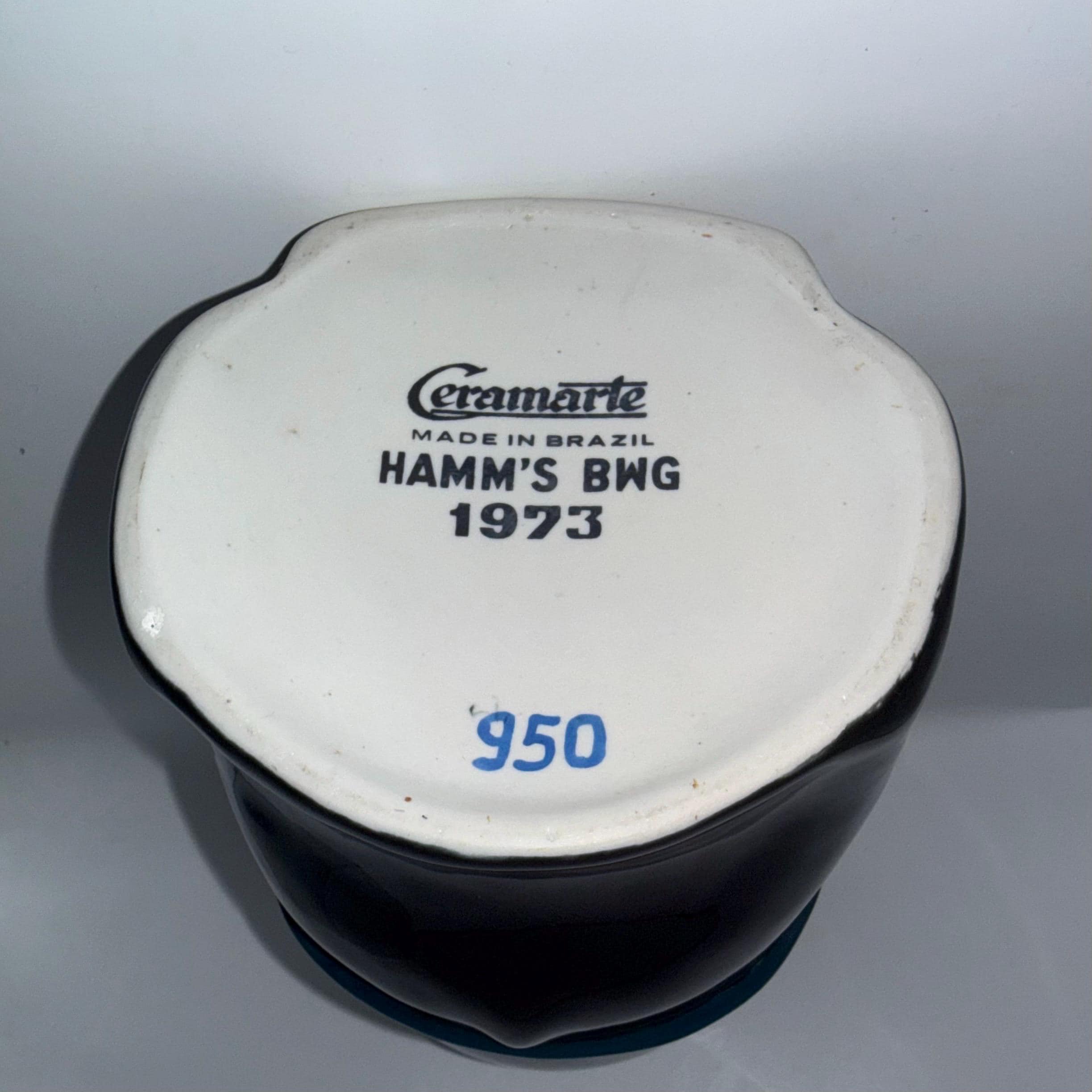 Vintage 1973 Hamm’s Bear decanter produced by Ceramarte in Brazil. This ceramic advertising decanter features the Hamm’s Bear in a suit holding a beer mug, standing behind a barrel marked “Hamm’s 1973.” Includes the original removable bear head stopper. Bottom is marked “Ceramarte • Made in Brazil • Hamm’s BWG 1973” with number 950.