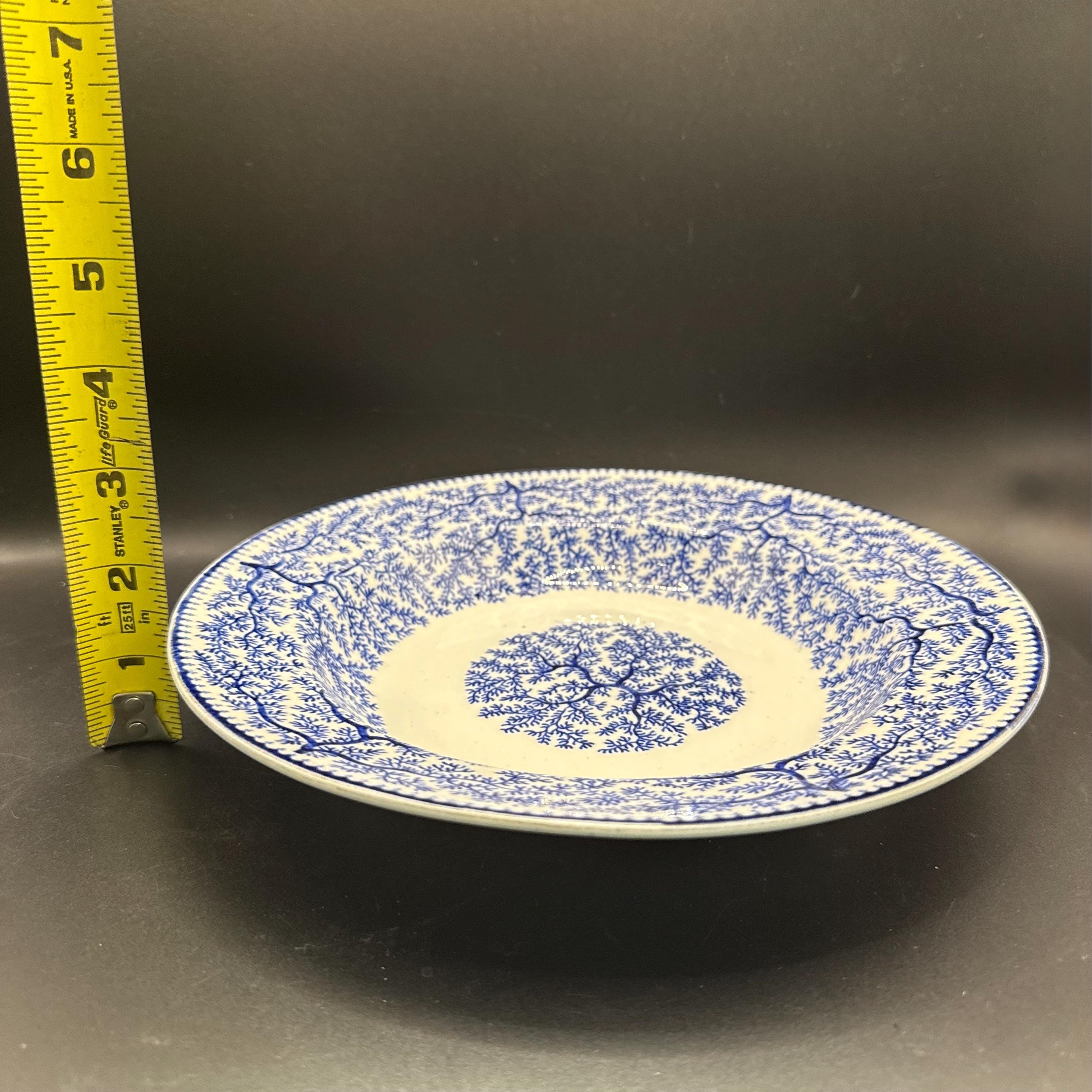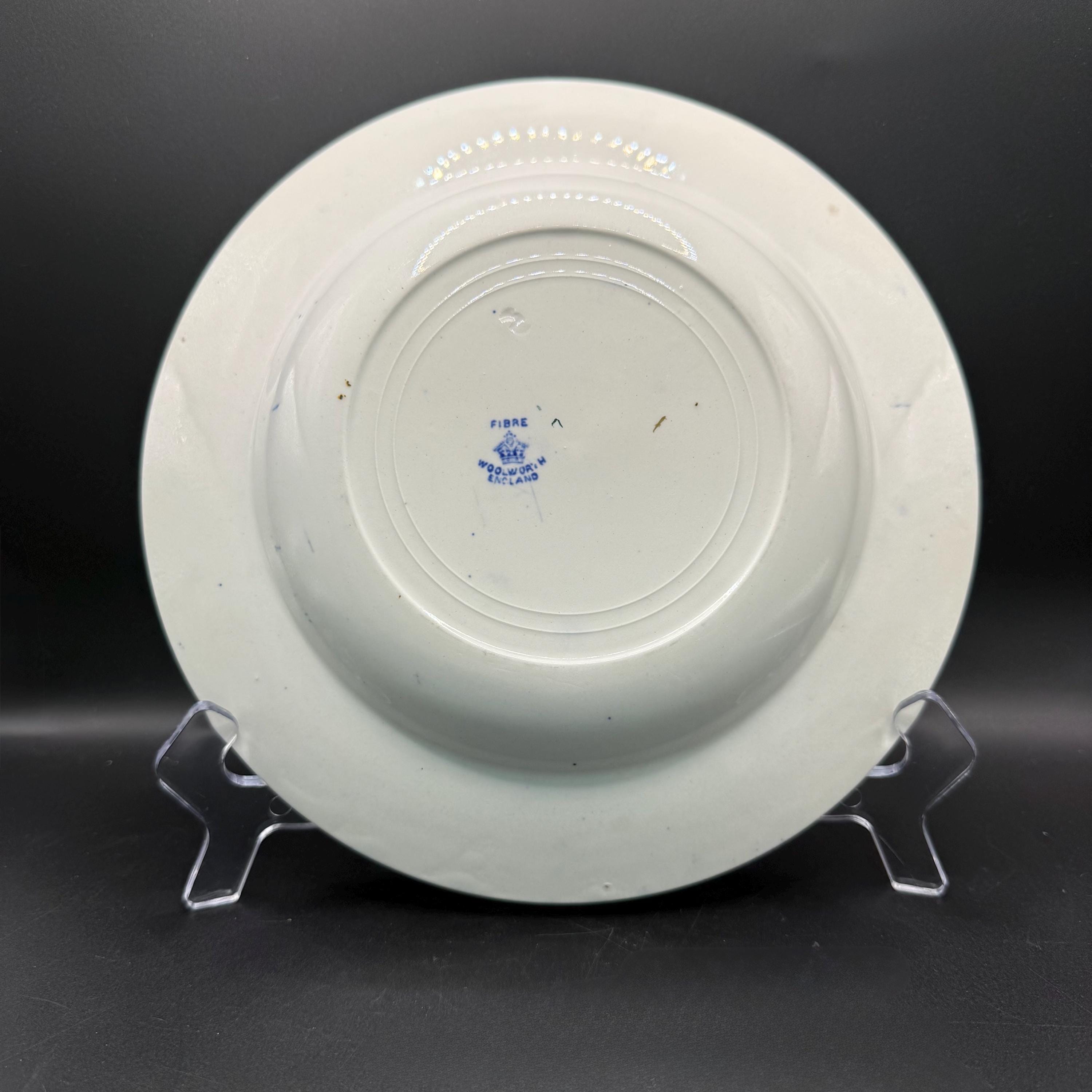 This beautiful vintage soup plate features an intricate blue transferware design with a calico-style foliage pattern. Made in England for Woolworth and stamped FIBRE – Woolworth England with the crown hallmark, this piece dates to approximately the 1920s–1930s.