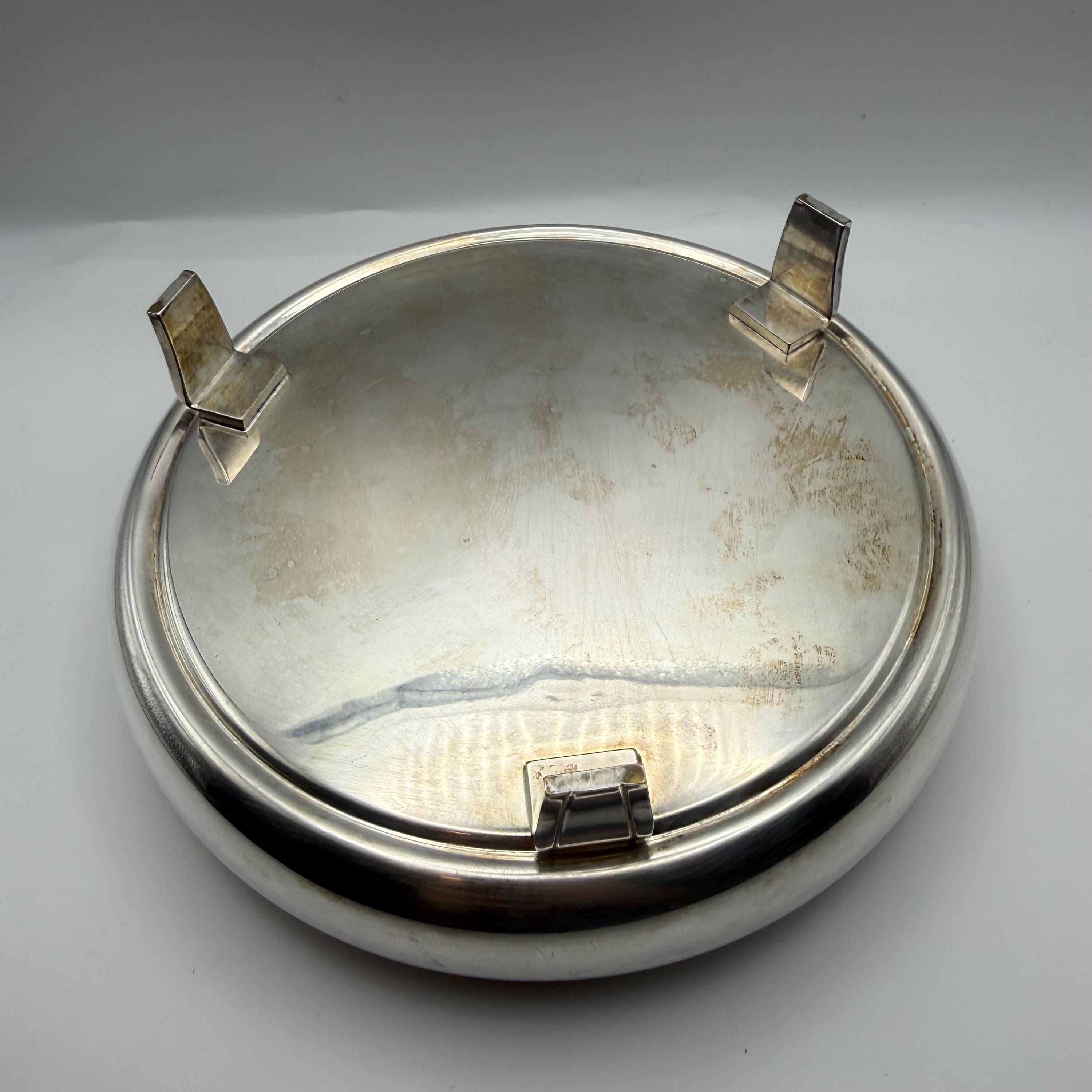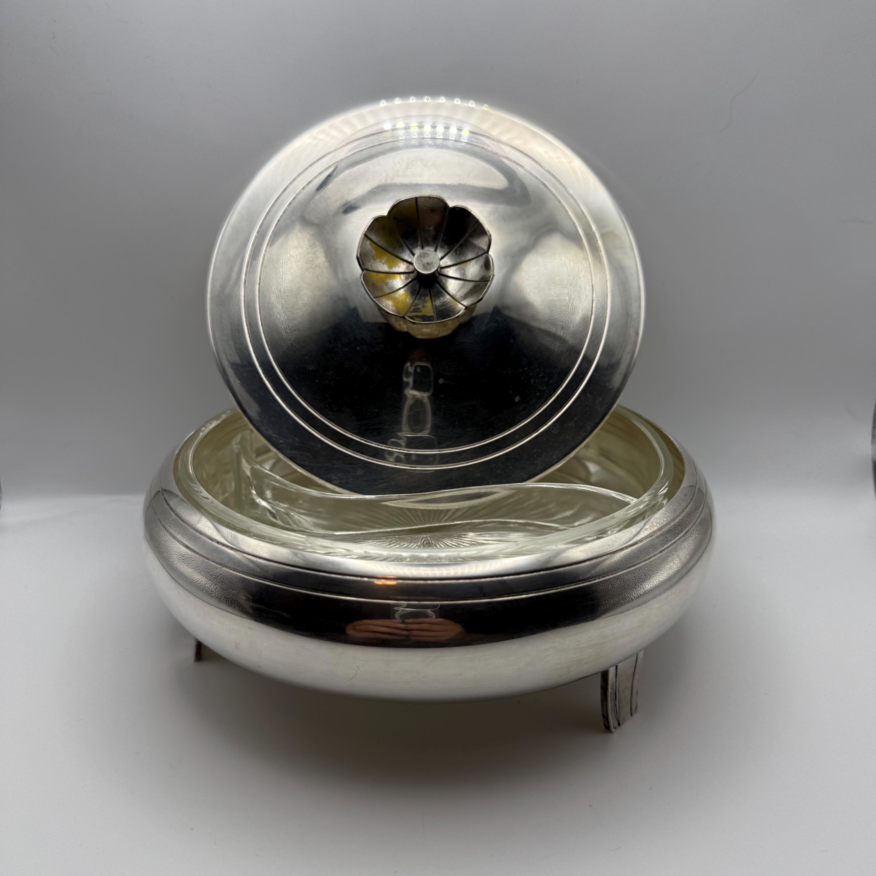 This vintage Mueck Cary silverplate covered dish features a domed lid, a floral finial, and three angled feet. It includes the original pressed glass divided insert with a starburst pattern. This design was later produced by Dorlyn Silversmiths, but this dish is an earlier Mueck Cary original, marked with the M hallmark and hand-engraved factory lettering on the underside. The silverplate shows gentle age wear consistent with use and age.