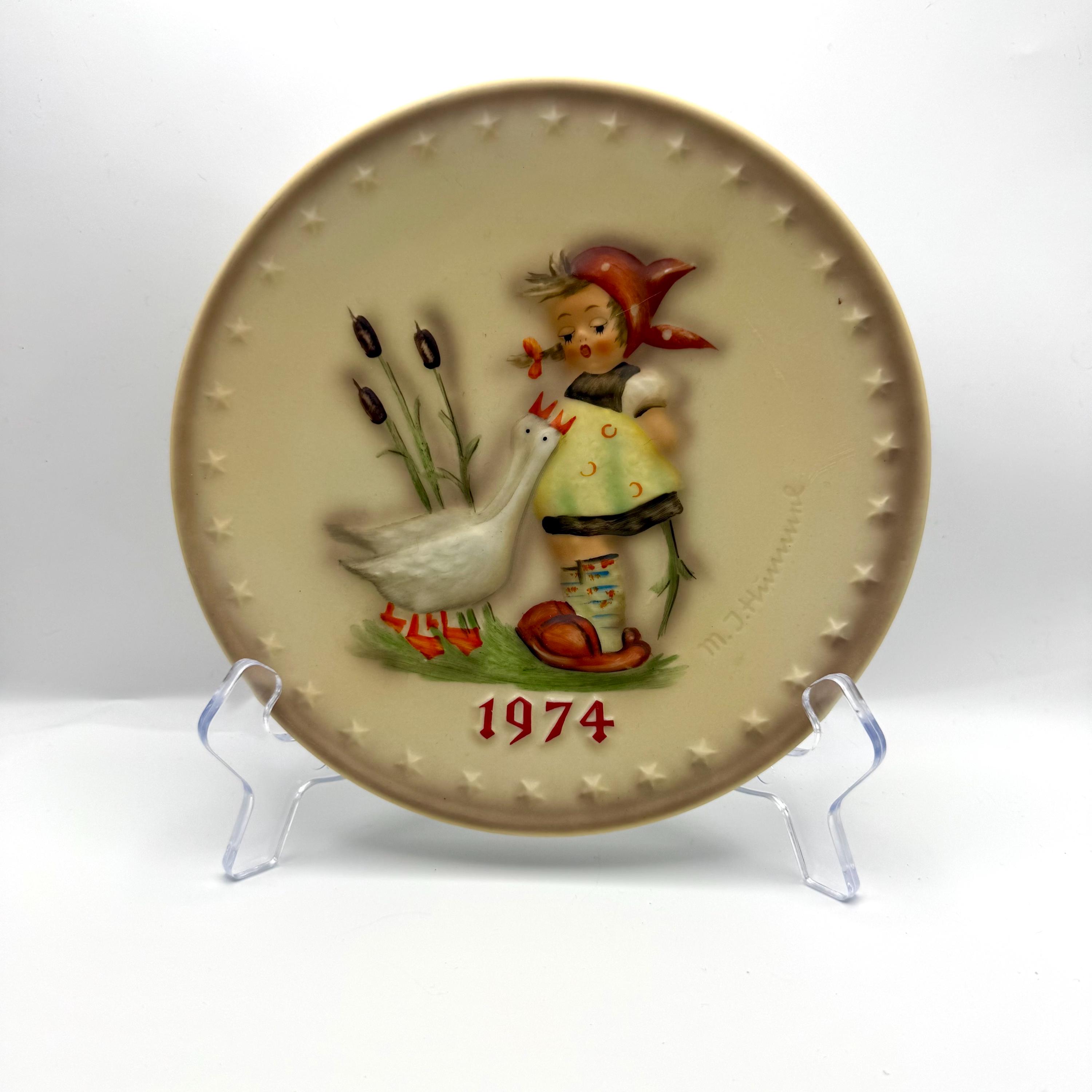 This is a vintage Goebel M.I. Hummel Annual Plate for 1974, featuring the charming “Girl with Goose” design. This is the 4th Annual Plate in the series, Hum 267, hand-painted in Rodental, West Germany. The plate has the classic raised relief artwork, soft cream border with embossed stars, and the bright red 1974 date at the bottom.