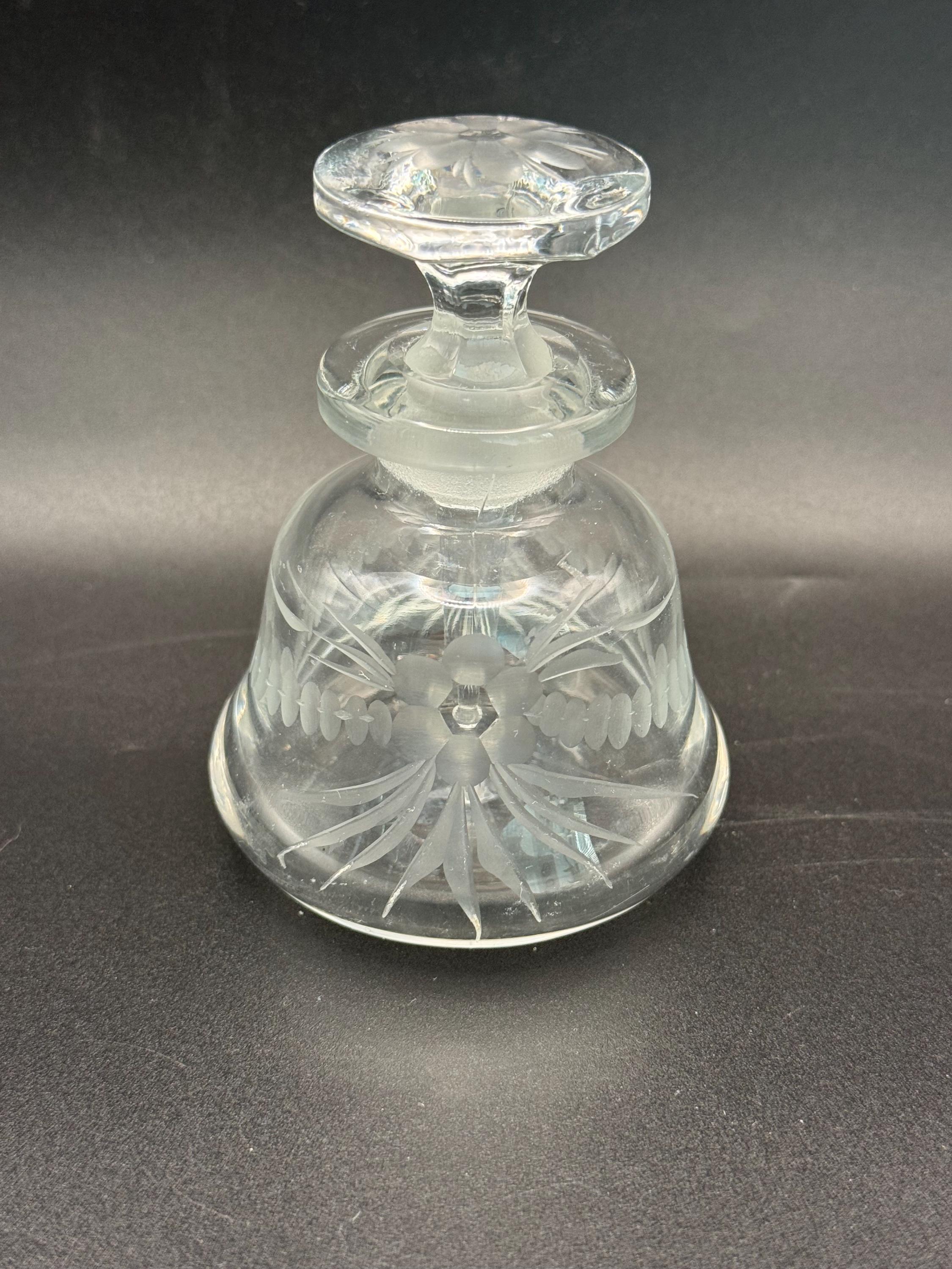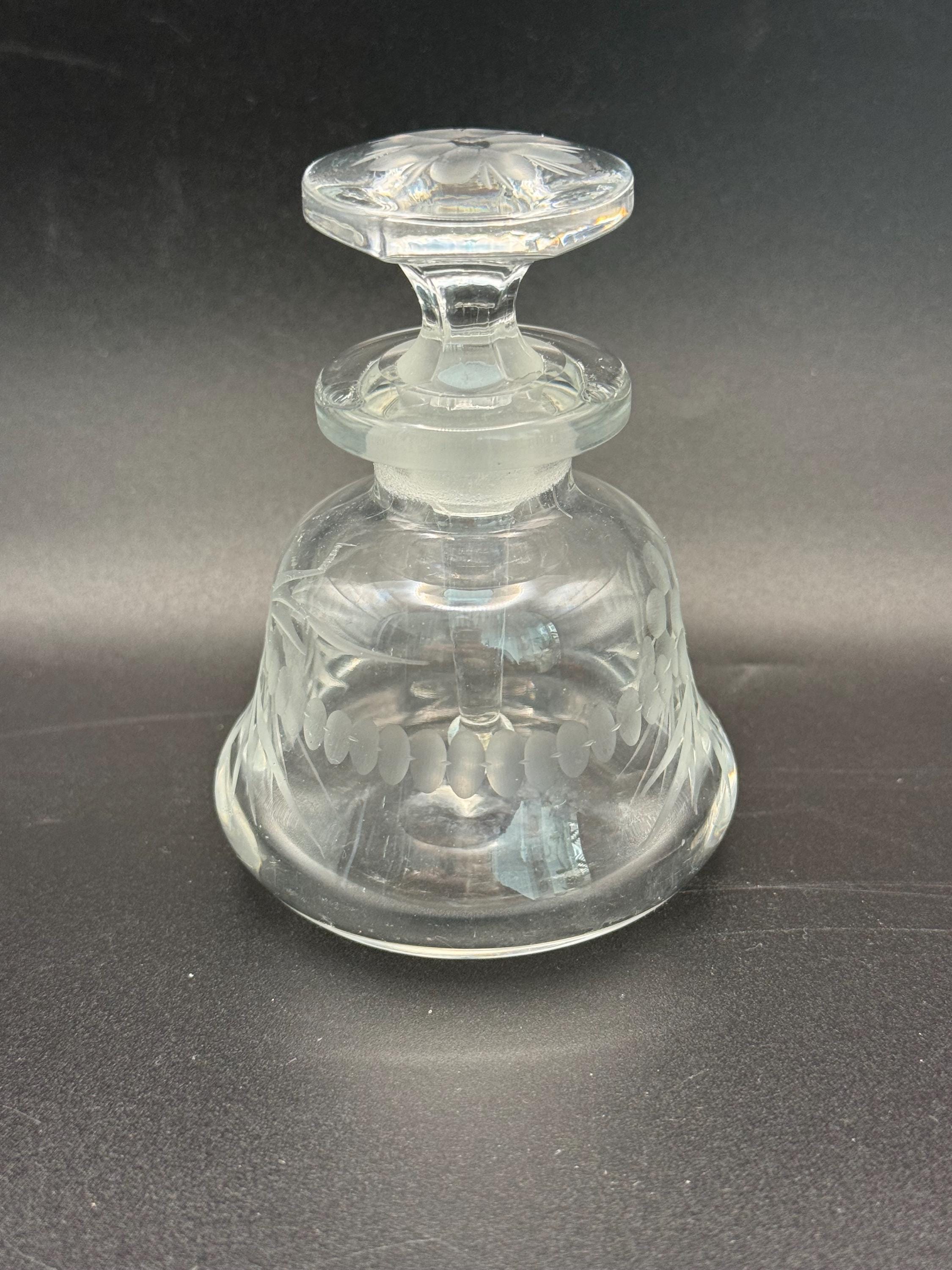 Elevate your dressing table with this vintage bell-shaped perfume bottle. Crafted from high-quality clear glass, the bottle features a "wheel-etched" floral design—a technique where a small copper wheel is used to grind the pattern into the glass, giving it a soft, frosted texture.