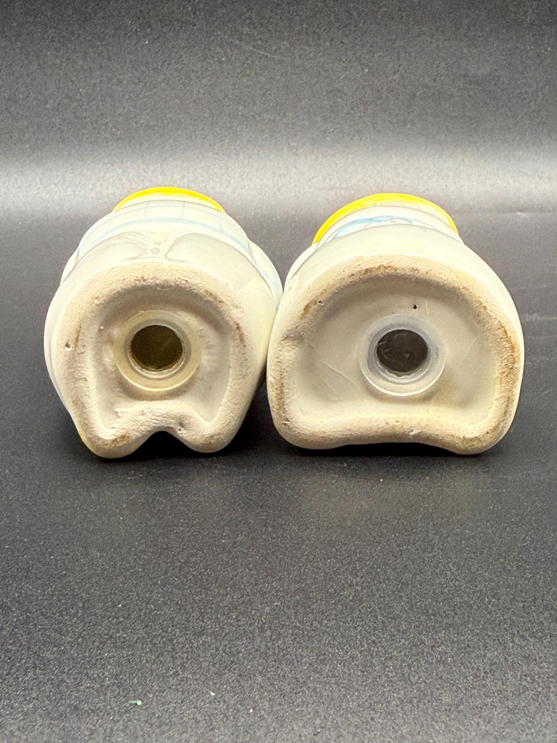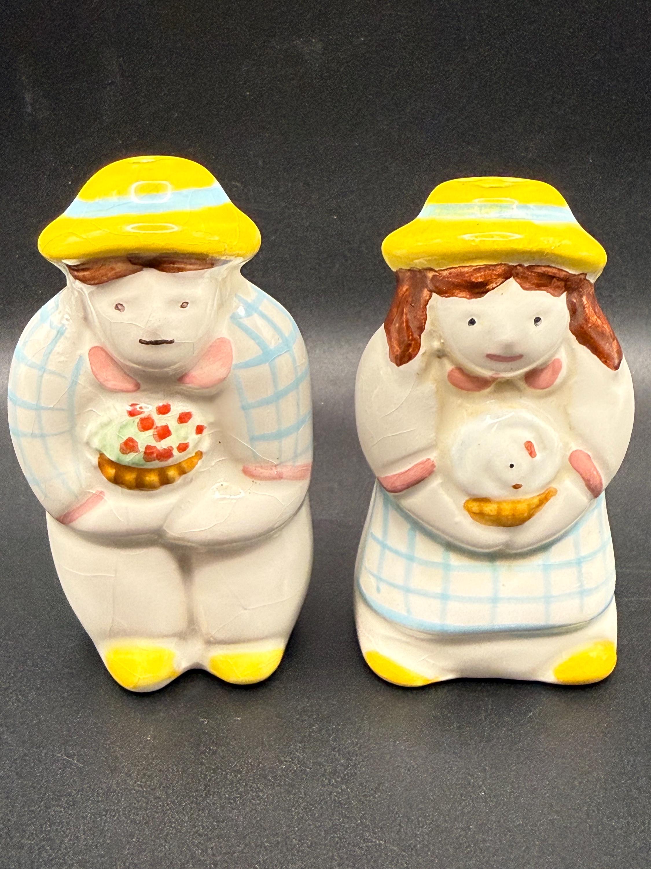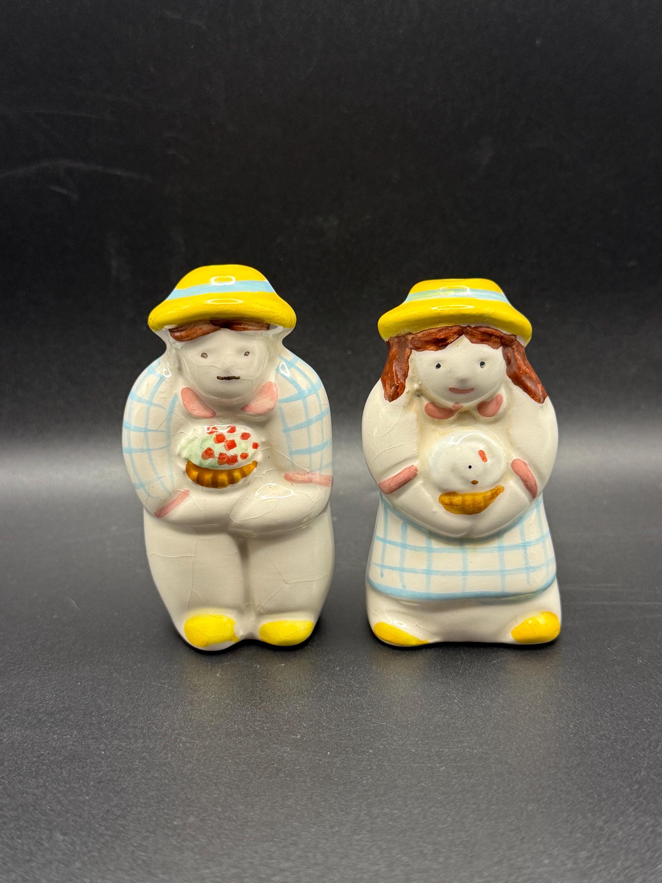 This delightful pair of vintage ceramic salt and pepper shakers features a charming country boy and girl, each carefully holding a miniature pie or tart. Dressed in matching light blue plaid outfits with bright yellow sun hats, this duo captures the quintessential cottagecore or farmhouse aesthetic of mid-century kitchen collectibles.