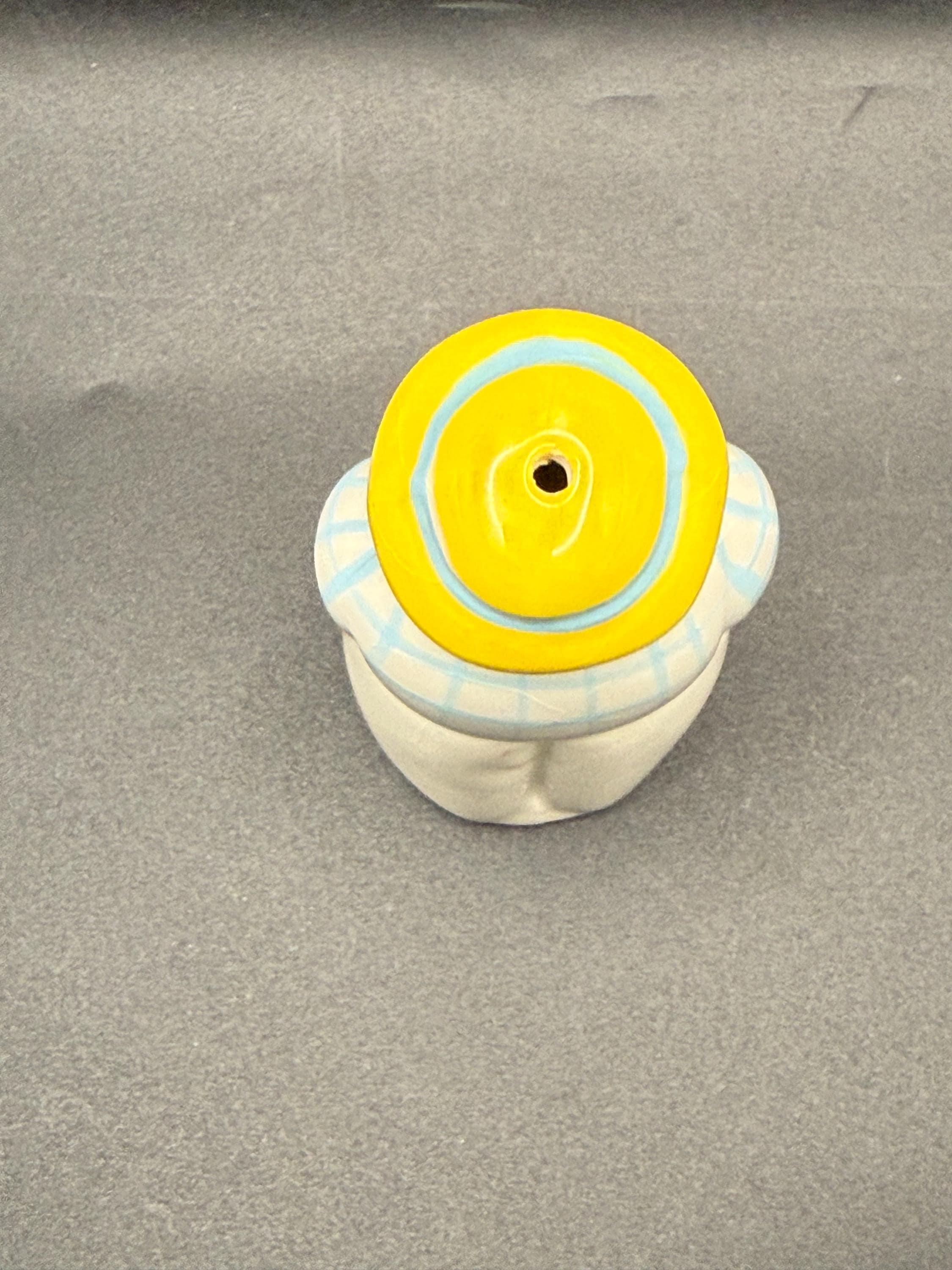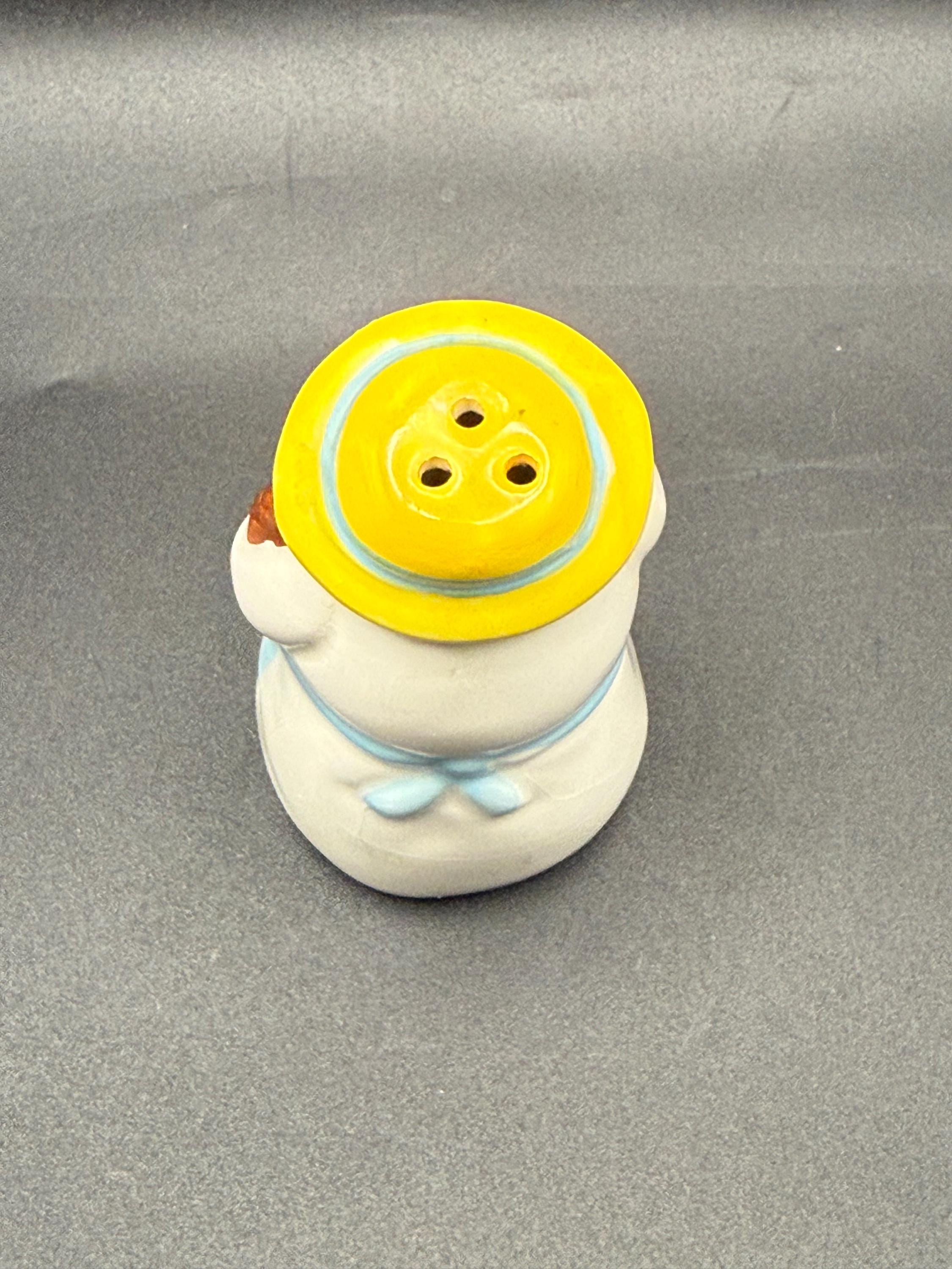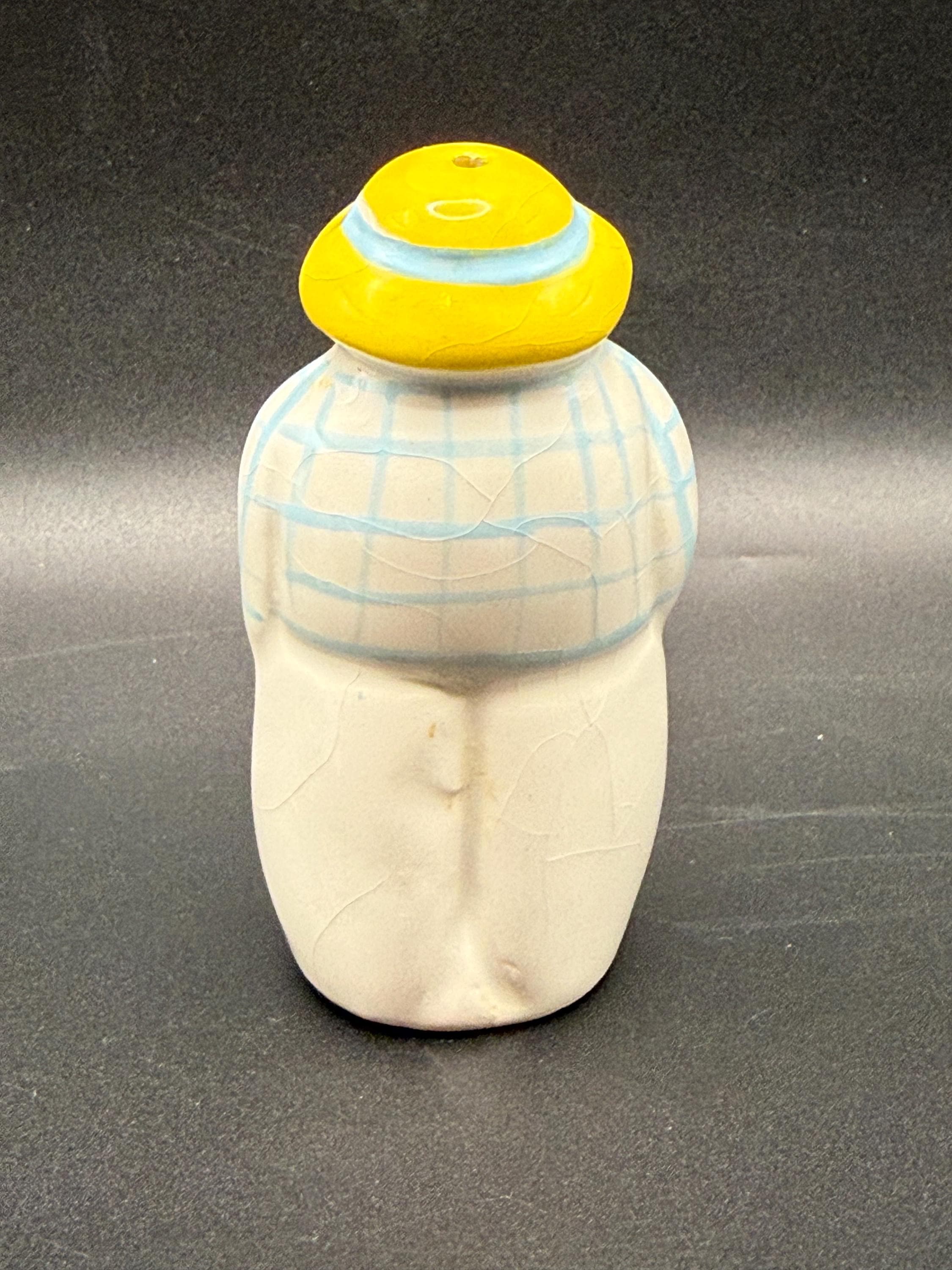 This delightful pair of vintage ceramic salt and pepper shakers features a charming country boy and girl, each carefully holding a miniature pie or tart. Dressed in matching light blue plaid outfits with bright yellow sun hats, this duo captures the quintessential cottagecore or farmhouse aesthetic of mid-century kitchen collectibles.