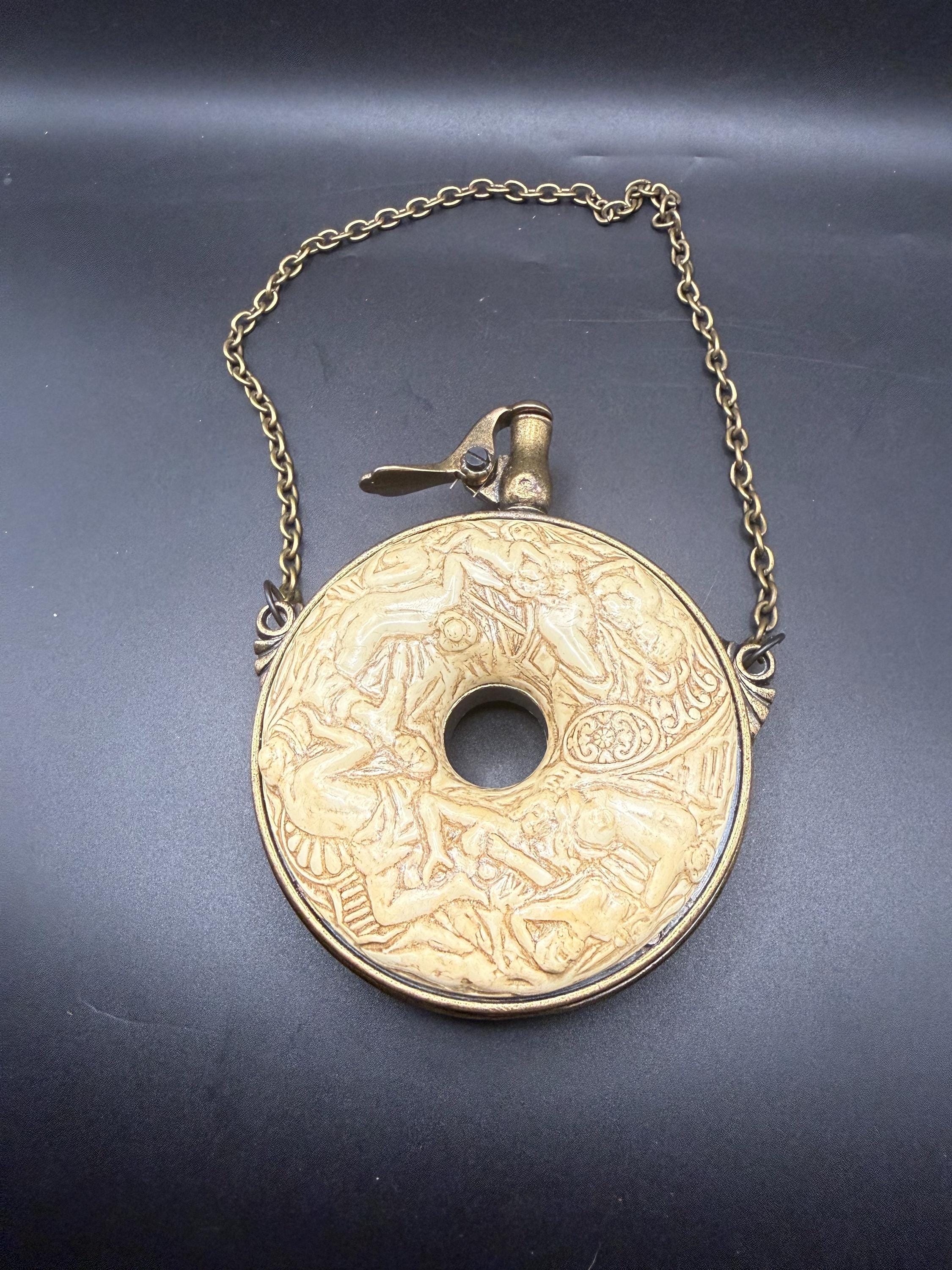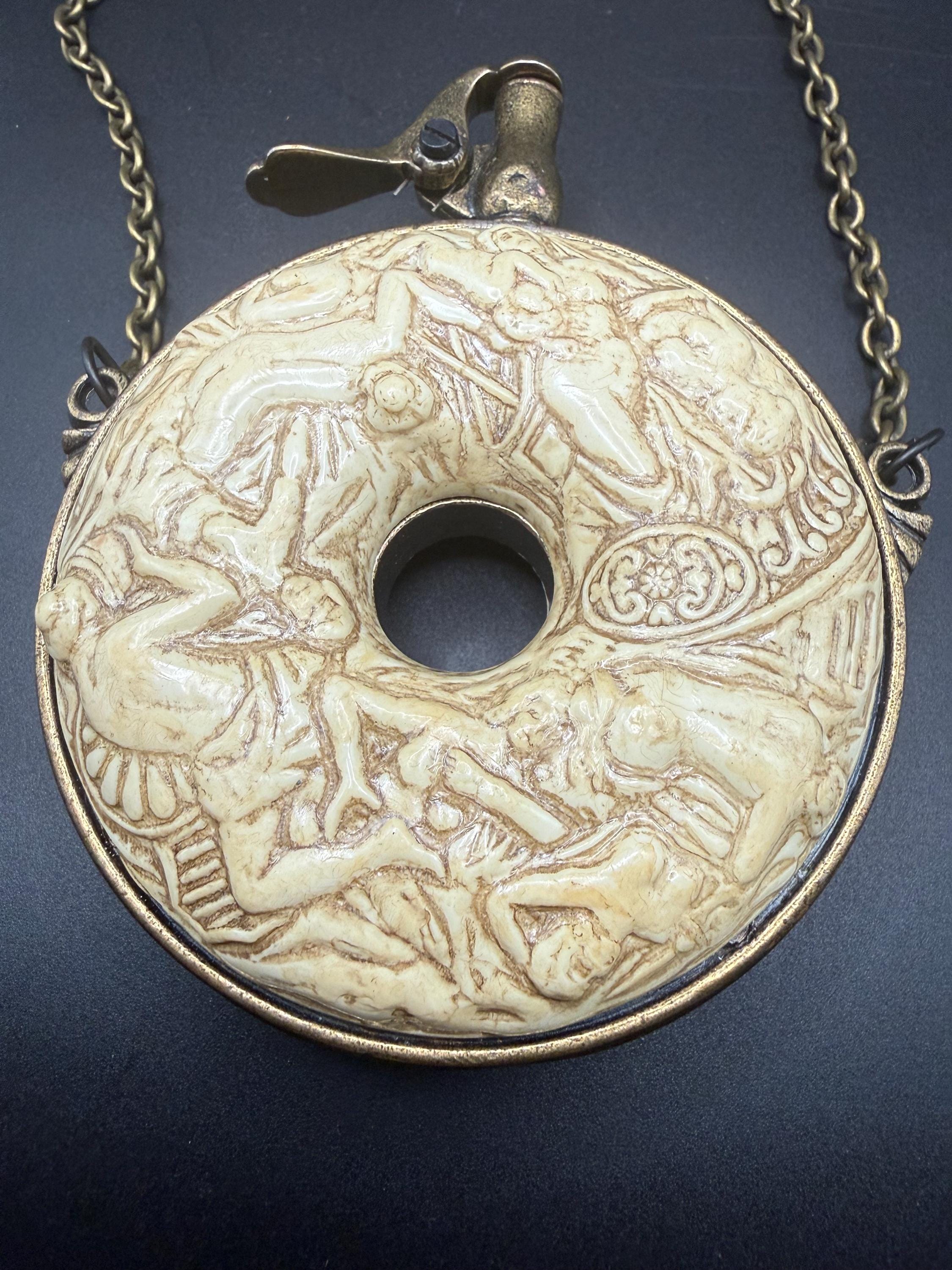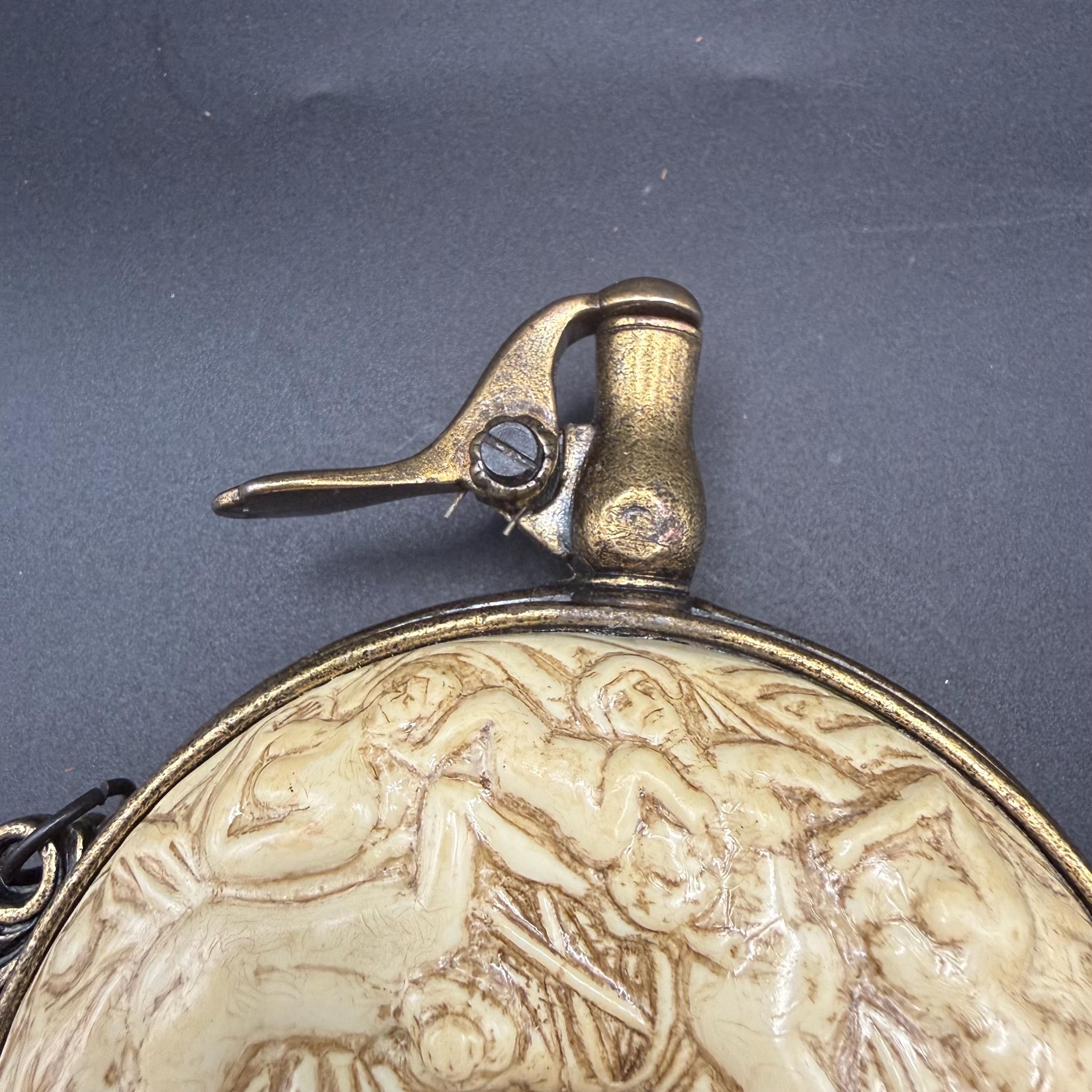 Crafted with an antiqued brass-tone finish and ivory-toned resin relief, it includes a spring-loaded lever spout (decorative only) and a long hanging chain for display. While styled like a functional powder flask, it is a non-functional prop intended for decoration, theater, or historical reenactment.