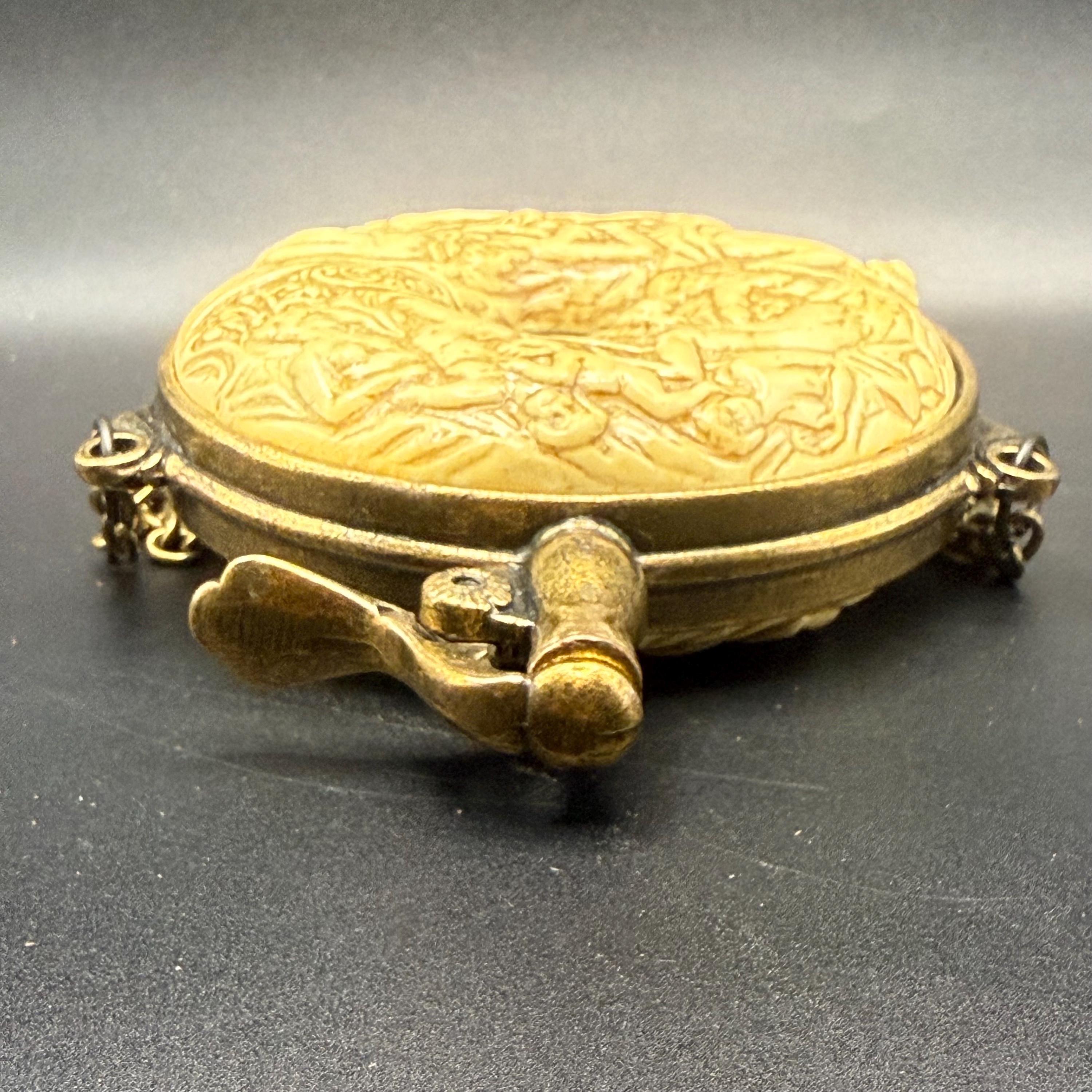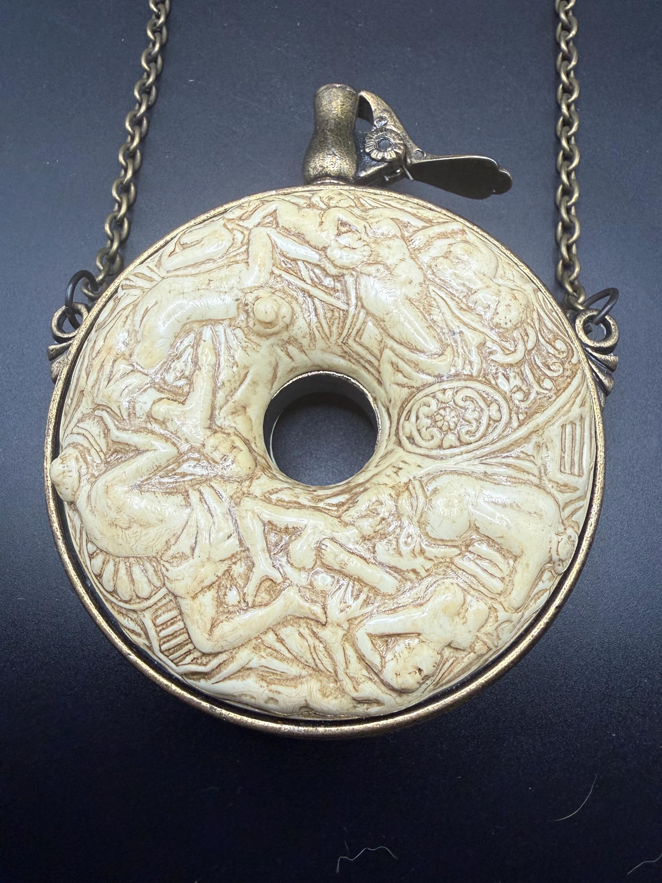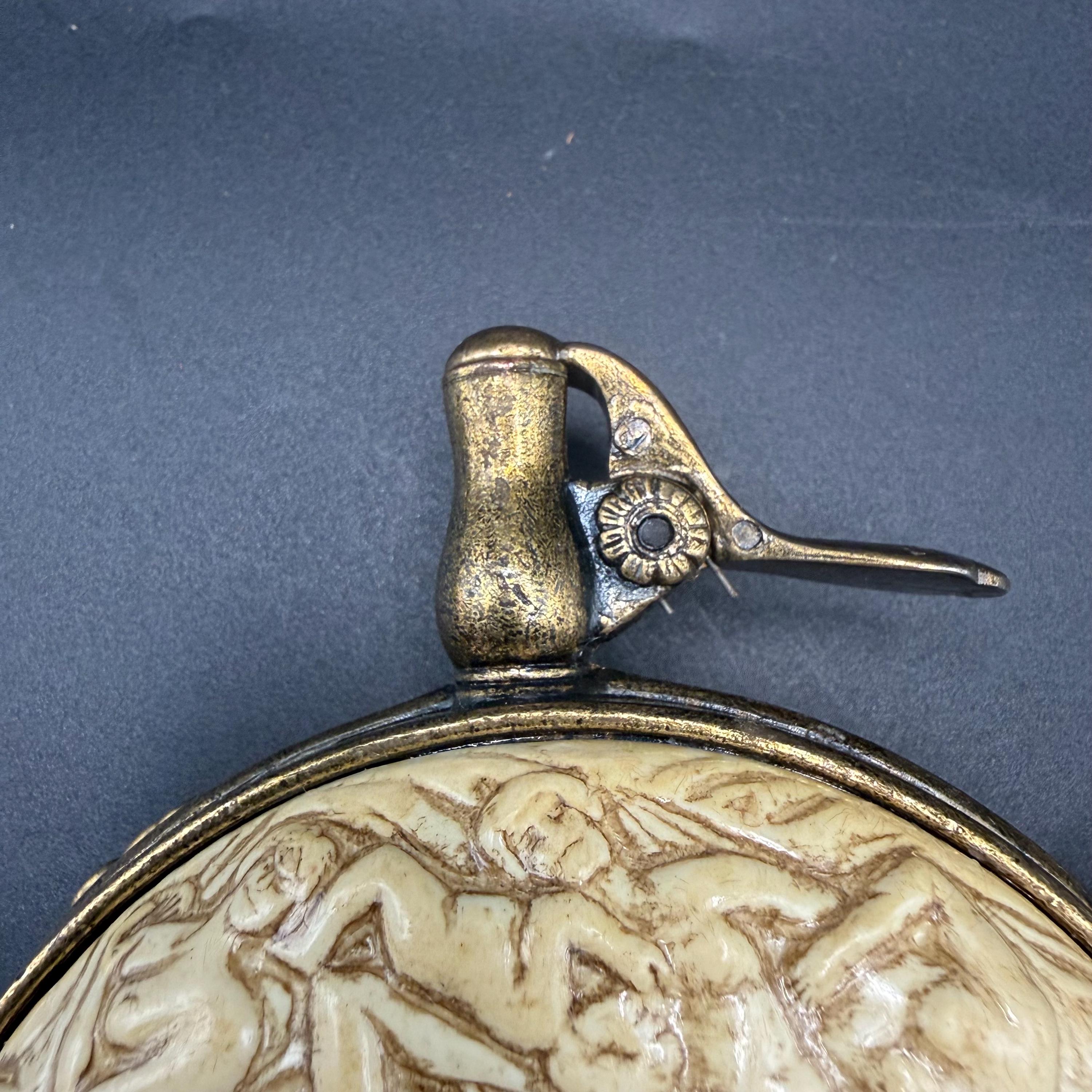 Crafted with an antiqued brass-tone finish and ivory-toned resin relief, it includes a spring-loaded lever spout (decorative only) and a long hanging chain for display. While styled like a functional powder flask, it is a non-functional prop intended for decoration, theater, or historical reenactment.