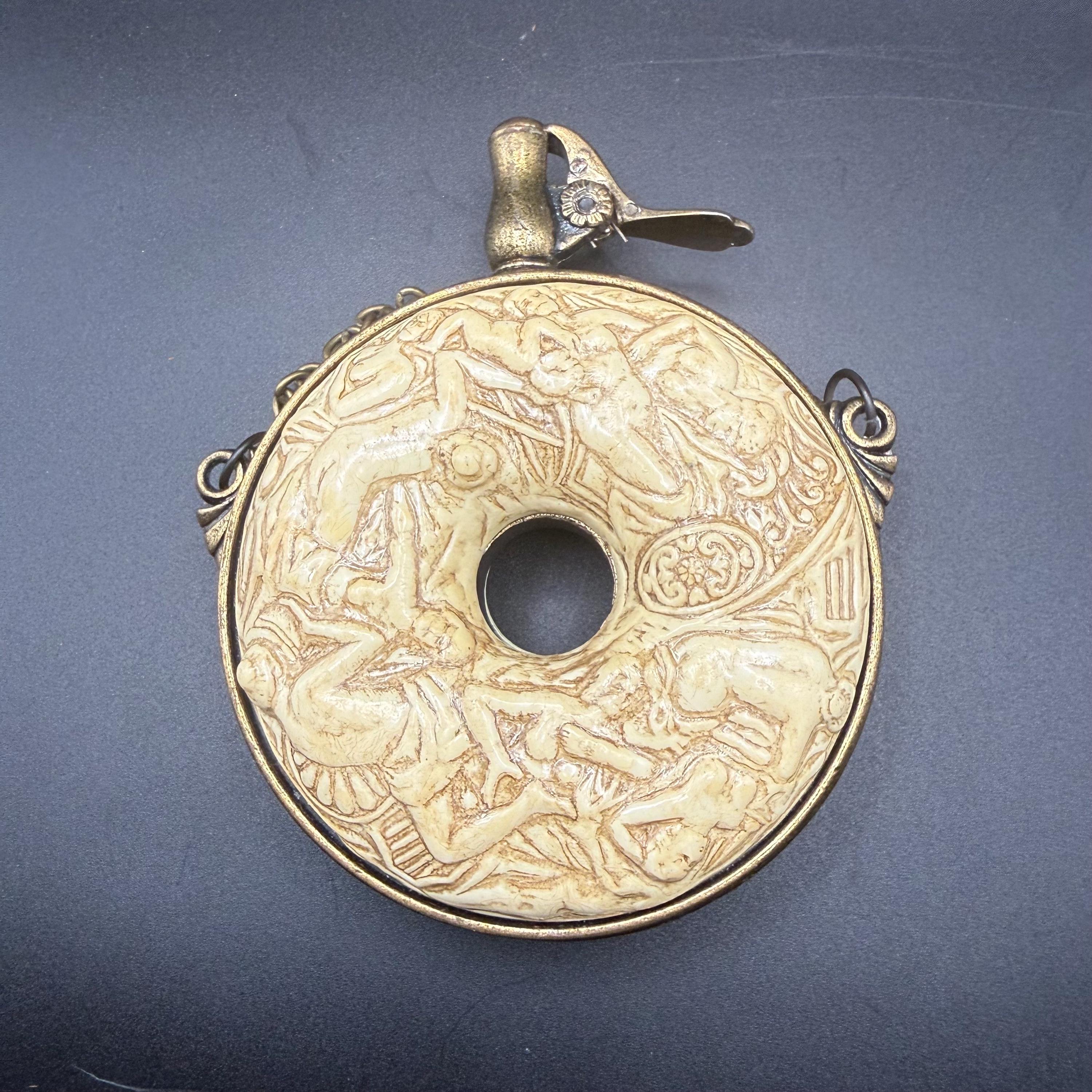 This is an authentic Denix-made reproduction of a circular 17th-century German black powder flask. A classic piece for collectors of historical militaria and decorative curiosities, it features a highly detailed, wrap-around high-relief scene. The motif depicts several figures in a classical, suggestive "naughty" style, common in late Renaissance German staghorn carvings which this piece seeks to emulate.