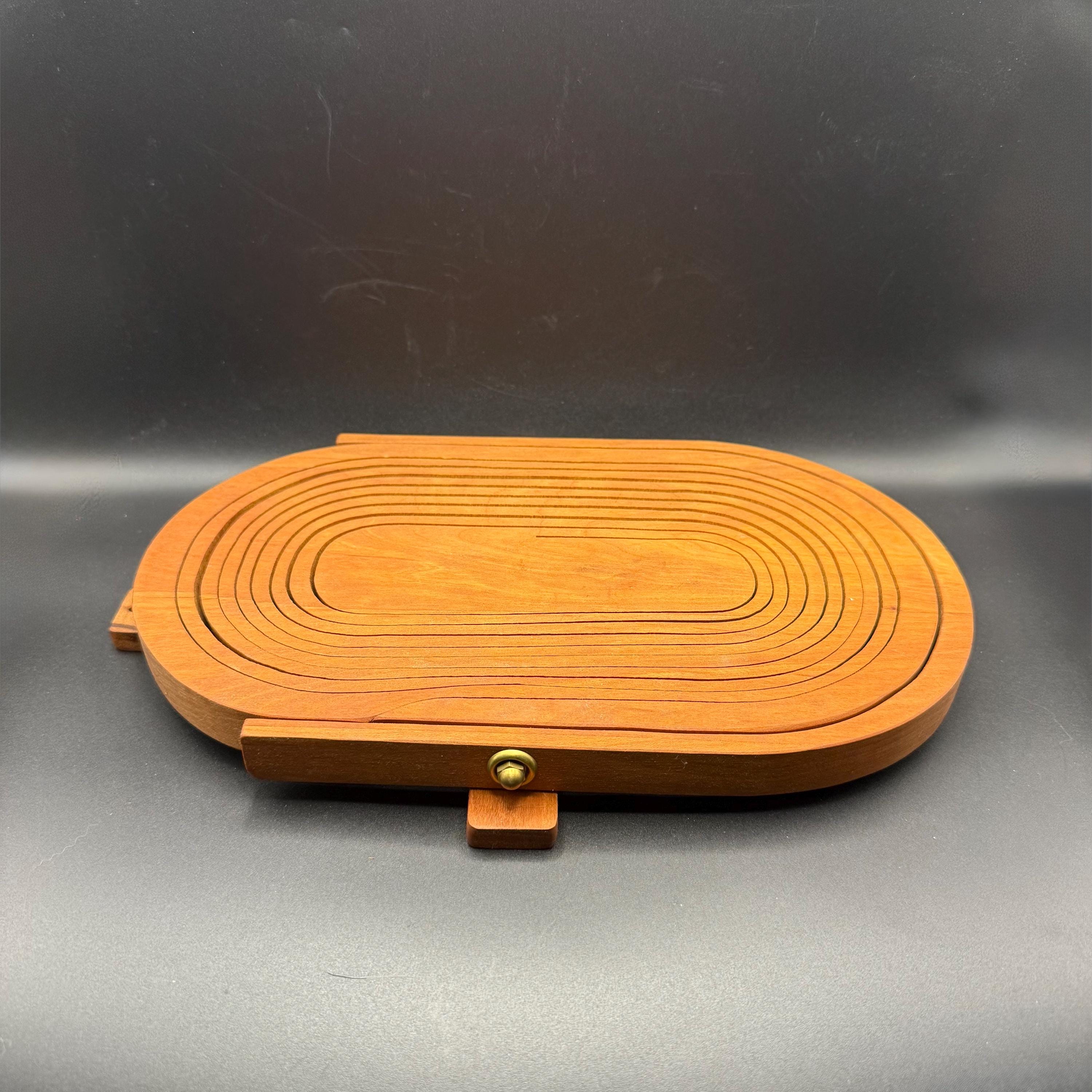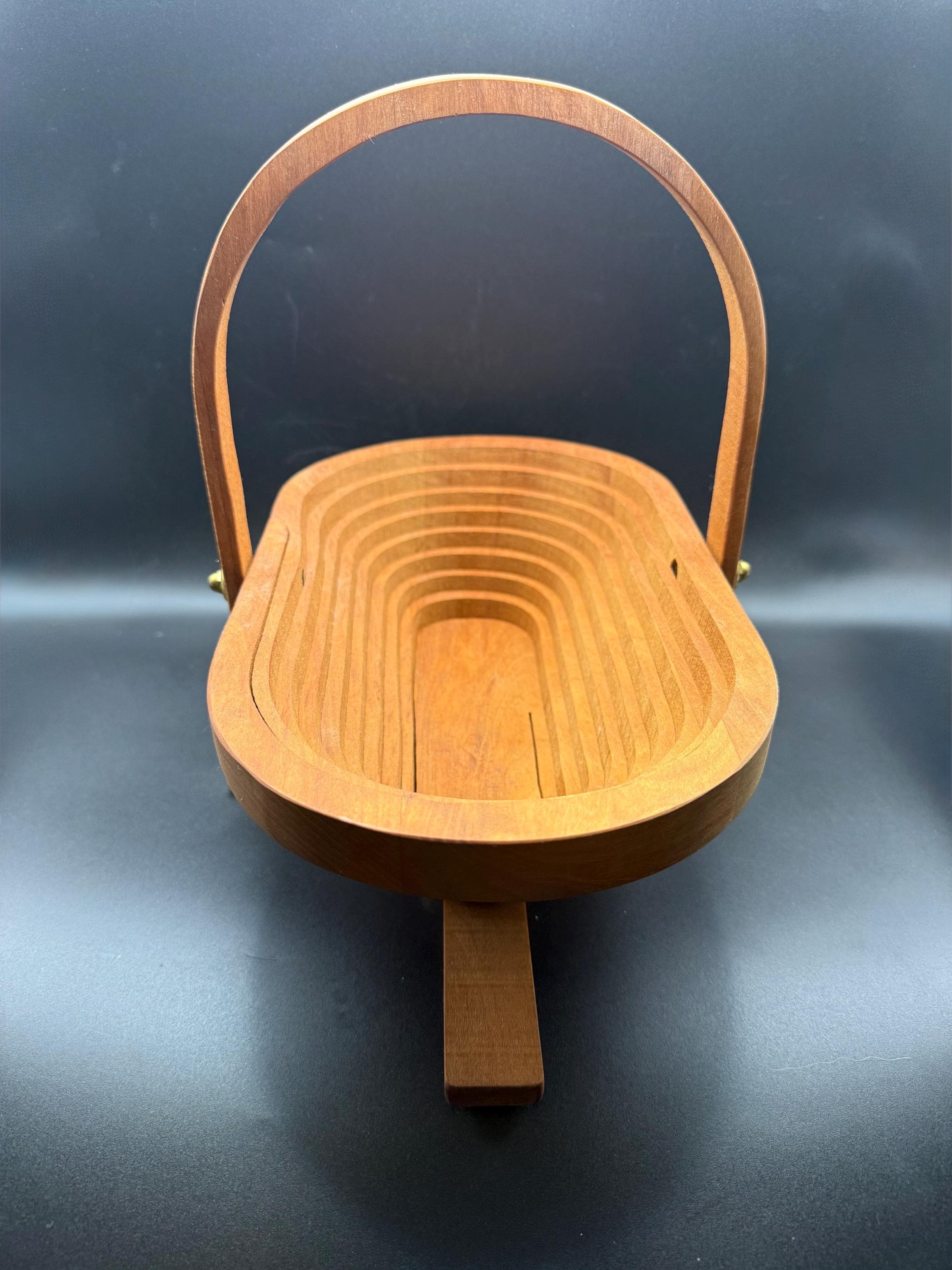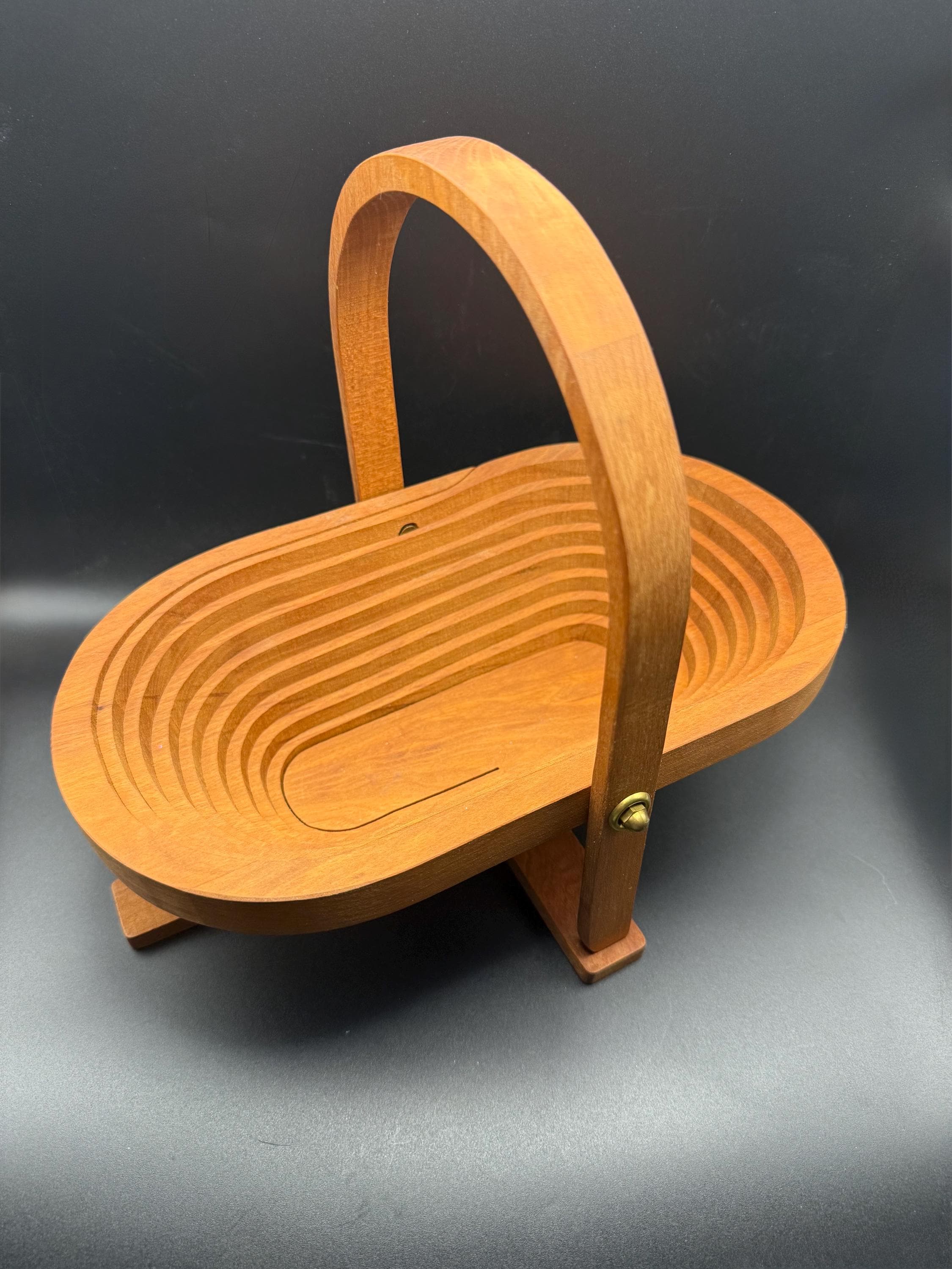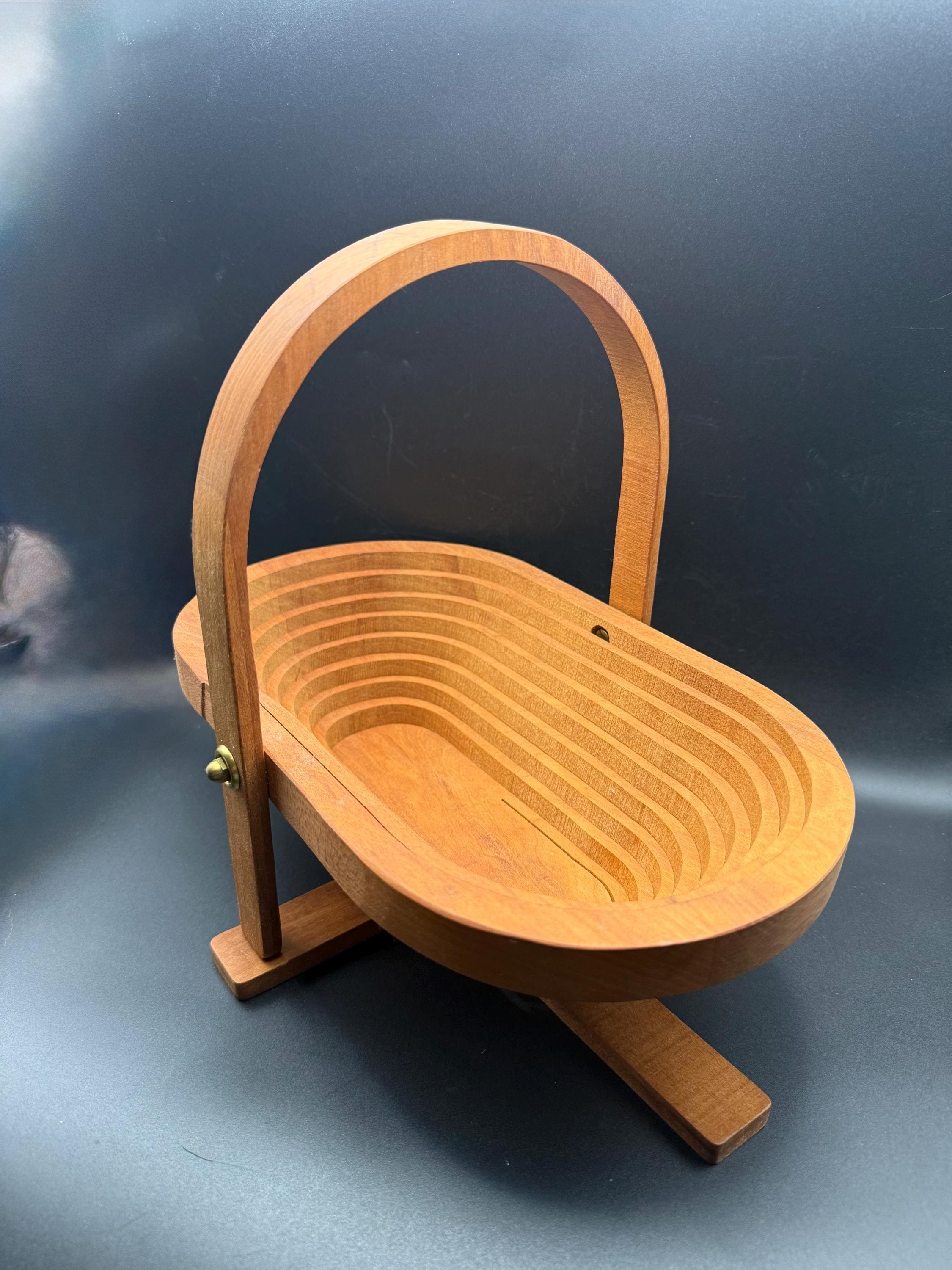 This vintage handcrafted wooden fruit basket is a beautiful marriage of mid-century form and functional design. Featuring an oval "accordion" or "puzzle" style construction, this piece is cut from a single block of wood to expand into a sturdy bowl and collapse back into a flat trivet for easy storage.