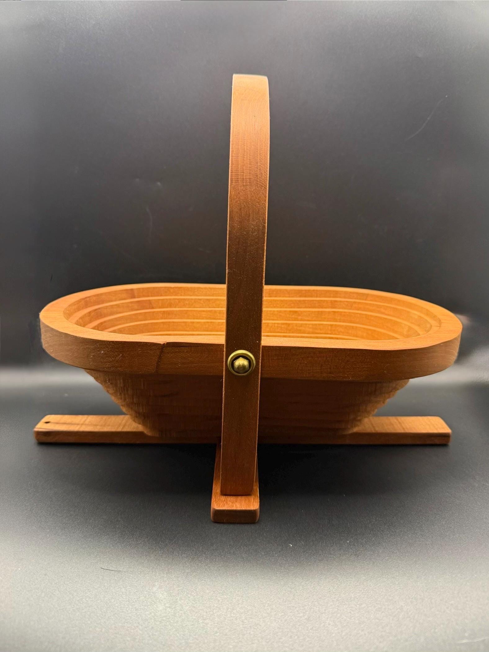 The warm wood grain and elegant curved handle make it a perfect centerpiece for a kitchen island or dining table. It is ideal for holding fruit, bread, or even seasonal decor like pinecones or ornaments. The brass-toned hardware adds a touch of classic detail to the rotating handle and base.