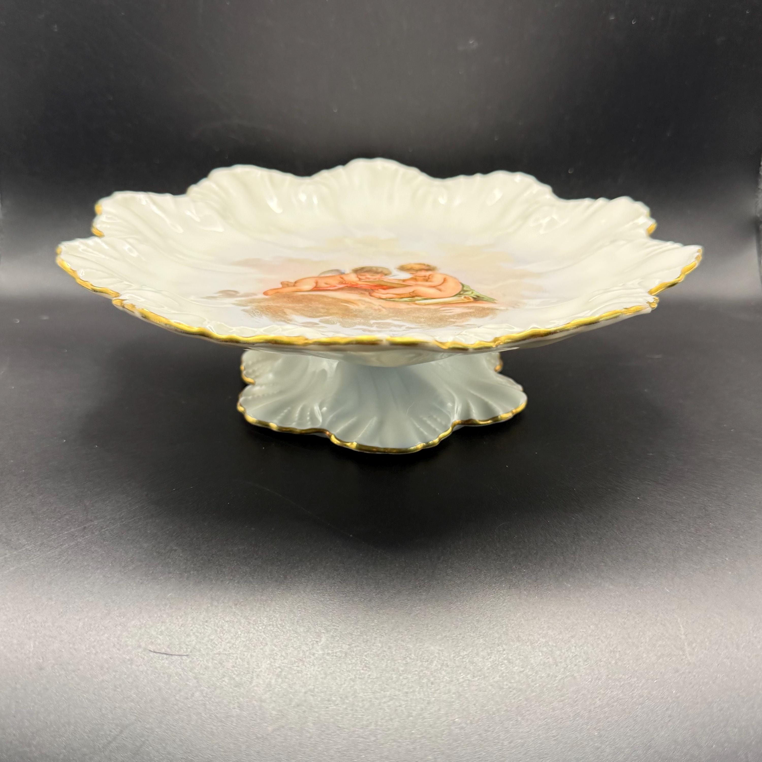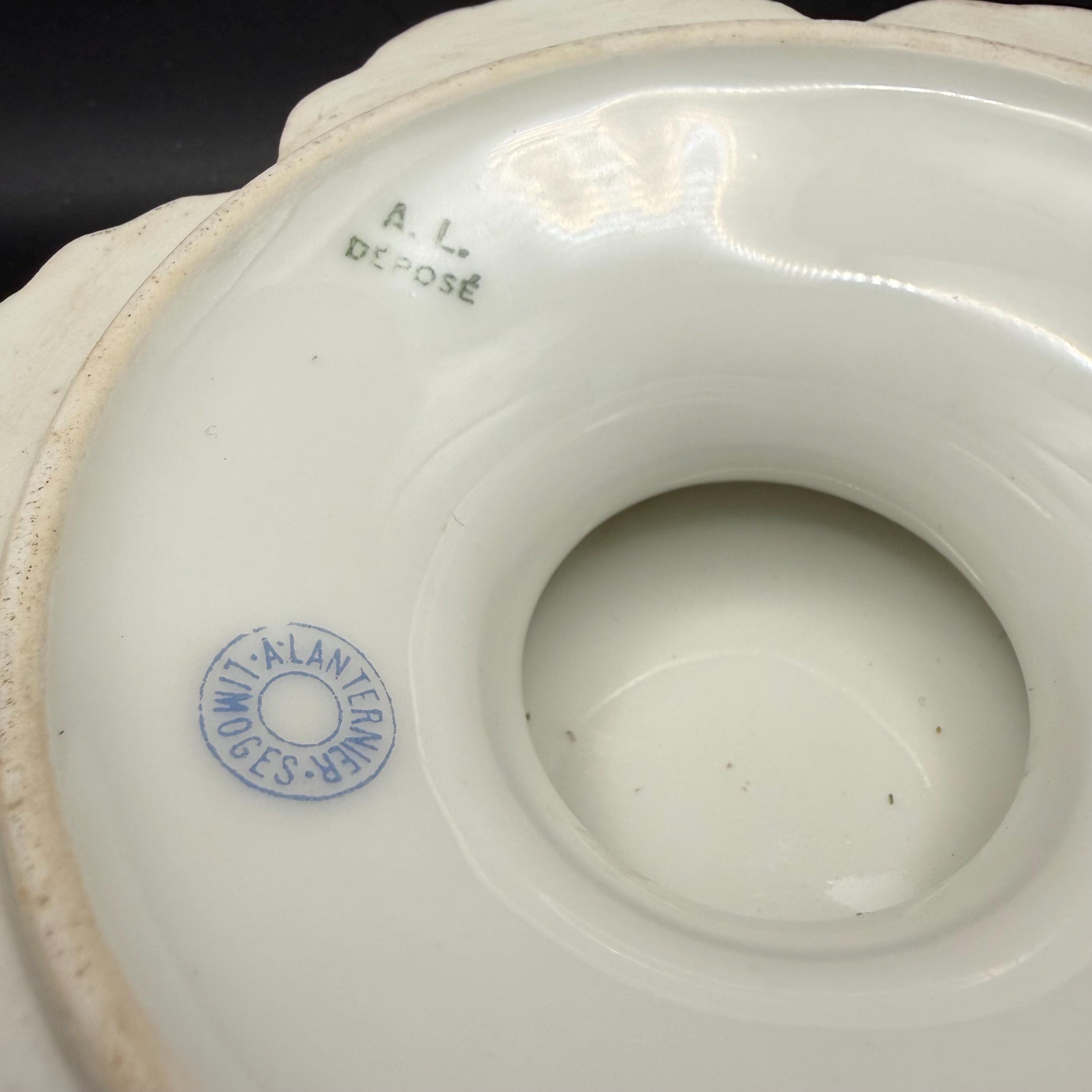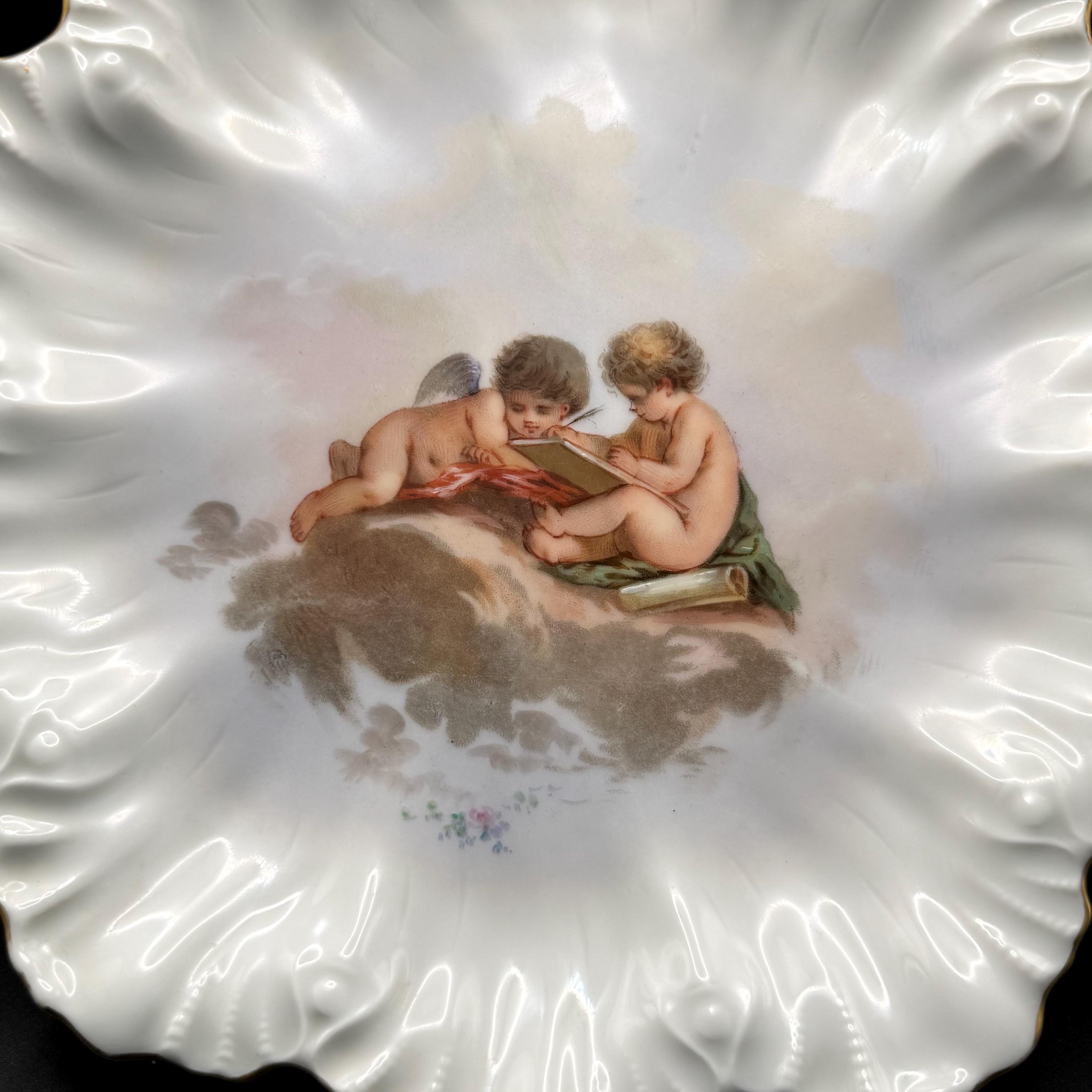 This exquisite antique porcelain cabinet plate features a hand-painted scene of two classic cherubs (putti) lounging on a cloud, deep in study with a book and quill. The plate is masterfully crafted by A. Lanternier & Co. of Limoges, France, dating back to the late 19th or early 20th century.