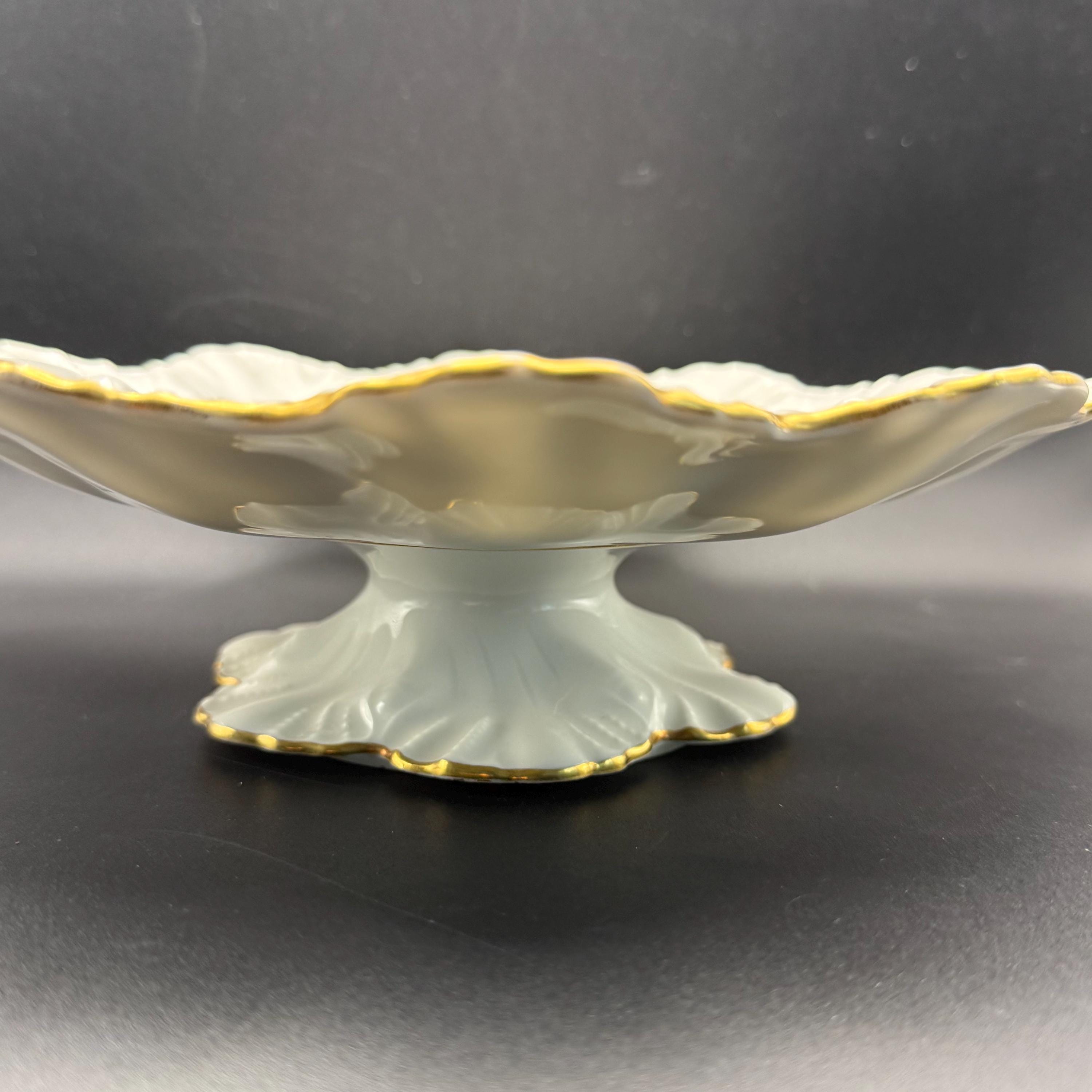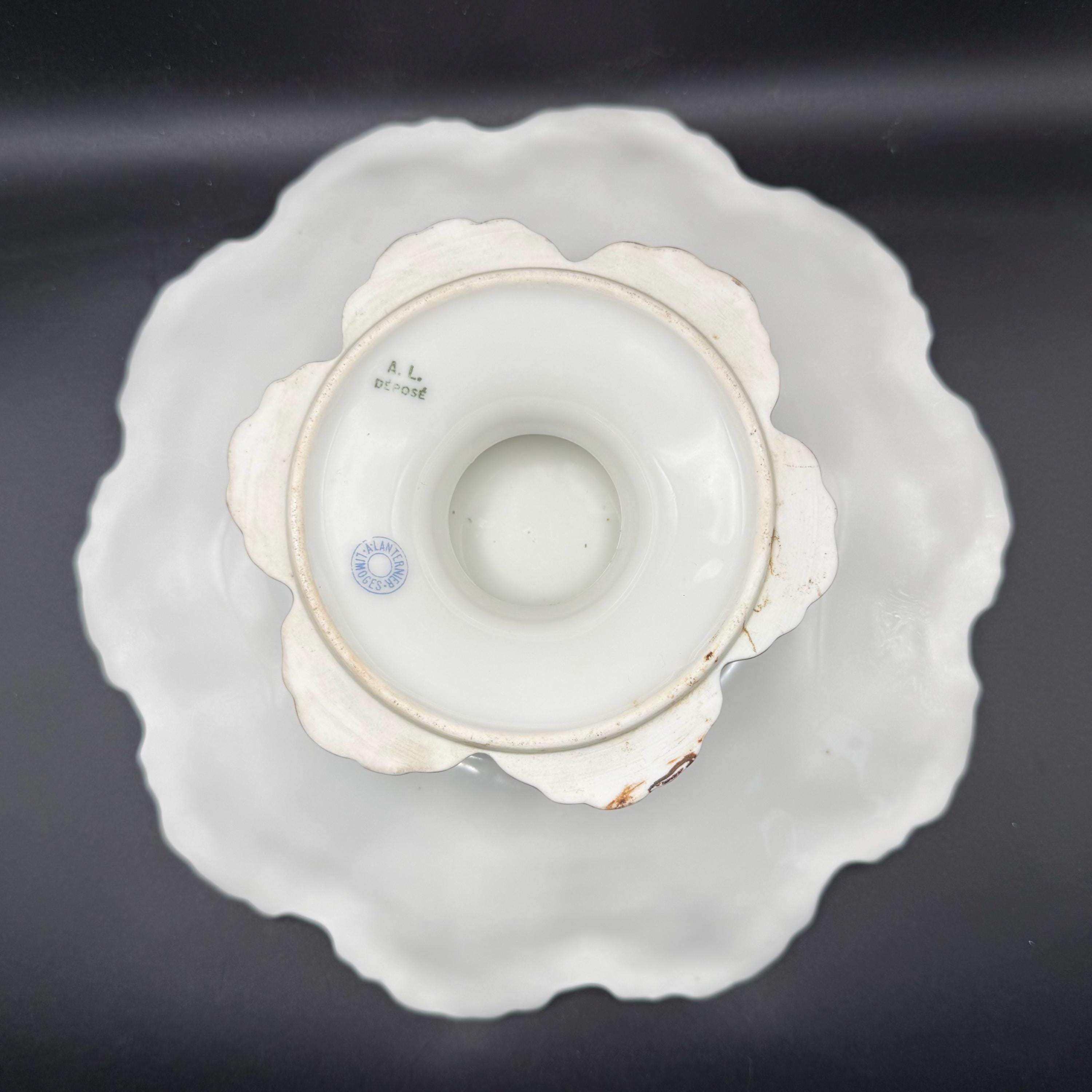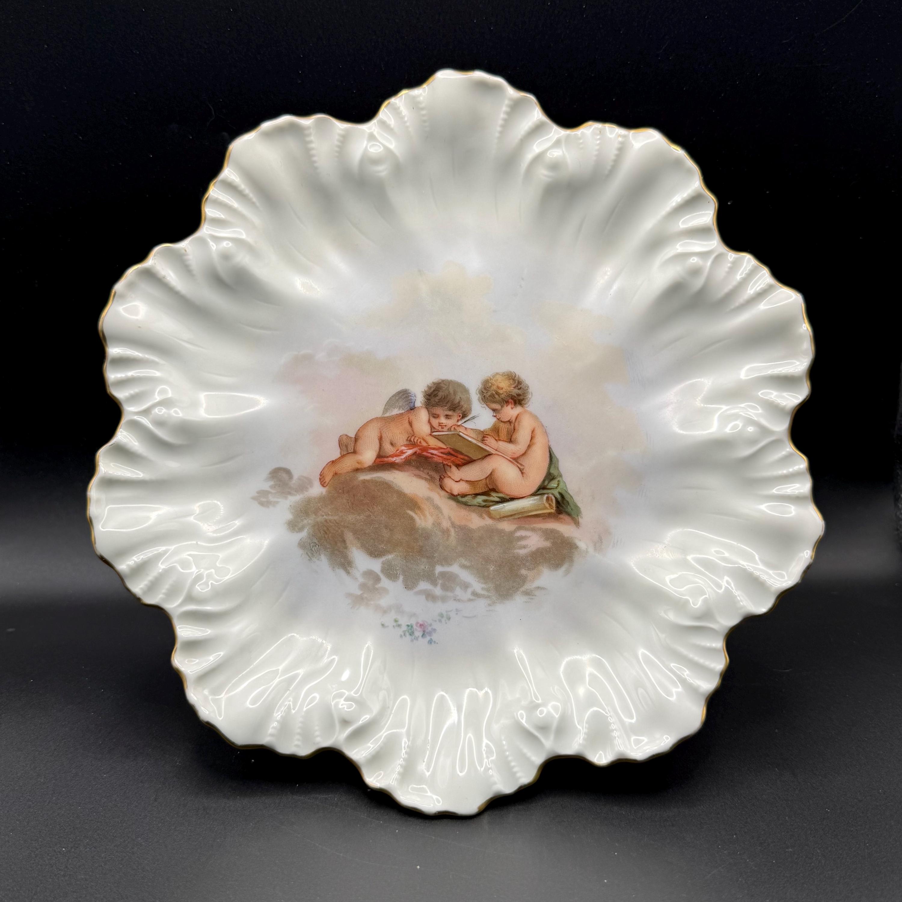 The piece boasts a dramatic, deeply scalloped "seashell" style rim with delicate embossed floral details and a fine gold-gilded edge. The soft pastel palette and romantic subject matter make this a stunning display piece for any collector of fine French porcelain or neoclassical decor.